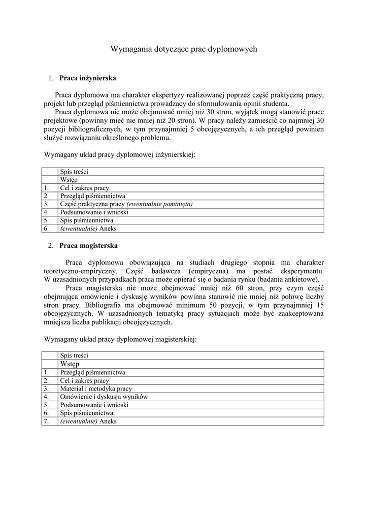 Wymagania dotyczące prac dyplomowych