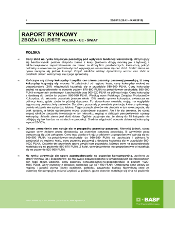 1 20/2012 (25.XI – 9.XII 2012) RAPORT RYNKOWY ZBOŻA I OLEISTE POLSKA - UE - ŚWIAT POLSKA • Ceny zbóż na rynku krajowym pozostają pod wpływem tendencji wzrostowej. Utrzymujący się bardzo wysoki poziom eksportu ziarna z kraju (zarówno drogą morską jak i lądową), a także zwiększone zapotrzebowanie na ziarno ze strony firm przetwórczych, które chcą pokryć potrzeby surowcowe na grudzień-styczeń wpływają na umacnianie się cen zbóż. Podaż ziarna na rynku zaczyna się jednak kurczyć. Część rolników widząc dynamiczny wzrost cen zbóż w ostatnich dniach wstrzymuje się z jego sprzedażą. • Kończące się zbiory kukurydzy i zwyżka cen ziarna pszenicy paszowej powodują, iż ceny kukurydzy trzymają się mocno. W zależności od regionu kraju, ceny kukurydzy mokrej na gospodarstwie (30% wilgotności) kształtują się w przedziale 580-600 PLN/t. Ceny kukurydzy suchej na gospodarstwie to obecnie poziom 870-890 PLN/t na południowym-wschodzie, 890-900 PLN/t w regionach centralnych i zachodnich oraz 900-920 PLN/t na północy kraju. Ceny kukurydzy z dostawą do portów to poziom 960-980 PLN/t. Według ocen Polskiego Związku Producentów Kukurydzy, do zebrania pozostało jeszcze około 10% areału uprawy kukurydzy, zwłaszcza na północy kraju, gdzie zboże to później dojrzewa. To stosunkowo niewiele, mając na względzie tegoroczną powierzchnię zasiewów. Do zbioru pozostały przeważnie plantacje, które z rynkowego punktu widzenia nie są bardzo istotne. Tegorocznych zbiorów nie utrudnia w tym roku pogoda, ale brak sprzętu, a także ograniczone moce przerobowe suszarni. Ale i to się zmienia, bo coraz więcej rolników poczyniło inwestycje w tym kierunku, myśląc o dalszych perspektywach uprawy kukurydzy. Jakość ziarna jest dość dobra. Ogólnie przyjmuje się, że zbiory do 15 listopada nie odbijają się tak bardzo na stratach w produkcji. Średnia wilgotność obecnie zbieranej kukurydzy wynosi 25-30%. • Dalsze umocnienie cen notuje się w przypadku pszenicy paszowej. Niemniej jednak, coraz wyższe ceny żądane przez dostawców za pszenicę paszową powodują, iż wytwórnie pasz wstrzymują się z jej zakupem. Ceny tego zboża w kraju z odbiorem z gospodarstwa wahają się od 940-950 PLN/t na południowym-wschodzie do 960-980 PLN/t na zachodzie i północy. W zależności od regionu kraju, ceny pszenicy paszowej z dostawą kształtują się w przedziale 9801020 PLN/t. Ostatnie dni przyniosły spore zwyżki cen pszenżyta, którego ceny na gospodarstwie kształtują się na poziomie 850-870 PLN/t. Z kolei, ceny jęczmienia na gospodarstwie w kształtują się na poziomie 820-860 PLN/t. • Na rynku utrzymuje się spore zapotrzebowanie na pszenicę konsumpcyjną, zarówno ze strony młynów jak i eksporterów, co ma swoje odzwierciedlenie w umacniających się notowaniach cen tego zboża. Obecnie, ceny pszenicy konsumpcyjnej na gospodarstwie to poziom 10201060 PLN/t. Ceny pszenicy z dostawą dochodzą już do 1100 PLN/t. Ostateczna cena zależy od regionu i jakości ziarna (liczby opadania, gęstości, zawartości białka). Najwyższą cenę za pszenicę konsumpcyjną można uzyskać w portach, gdzie obecnie kształtuje się ona na poziomie BASF Polska Sp. z o.o., infolinia: (22) 570 99 90, www.agro.basf.pl 20/2012 (25.XI – 9.XII 2012) 2 powyżej 1100 PLN/t (realizacja styczeń-marzec 2013). Na rynku notuje się większy popyt na żyto konsumpcyjne, którego ceny kształtują się obecnie na poziomie 720-760 PLN/t na gospodarstwie. • Eksport ziarna z kraju wydaje się nie zwalniać tempa. Znaczne ilości ziarna eksportowane są drogą lądową(główne kukurydzy do Niemiec) oraz droga morską, gdzie na sile także przybrał eksport kukurydzy. Ceny płacone przez eksporterów za zboże dostarczone do portów są niezmiennie najwyższe w kraju i w końcu tygodnia kształtowały się na następujących poziomach: - kukurydza – 960-980 PLN/t, - jęczmień – 870-900 PLN/t, - pszenżyto – 880-900 PLN/t, - żyto - 800-820 PLN/t, - pszenica paszowa - 1020-1030 PLN/t, - pszenica konsumpcyjna 1120 PLN/t (realizacja styczeń-marzec). • W pierwszych 4 miesiącach bieżącego sezonu (lipiec-październik) za pośrednictwem portów wywieziono już ponad 800 tys. ton ziarna zbóż, z tego 380 tys. ton pszenicy. W I połowie sezonu (lipiec-grudzień) eksport zbóż drogą morską może wynieść nawet 1,2 mln ton ziarna. Wiele wskazuje na to, iż w pierwszych miesiącach 2013 roku eksport zbóż przez porty także będzie znaczny. Ceny zbóż w kraju ze zbiorów 2012 płacone przez podmioty przetwórcze w zależności od regionu kraju kształtują się następująco (PLN/t, netto, z dostawą): ZBOŻA pszenica paszowa kukurydza pszenżyto jęczmień paszowy żyto paszowe pszenica konsumpcyjna żyto konsumpcyjne 10.X.12 17.X.12 24.X.12 31.X.12 7.XI.12 14.XI.12 21.XI.12 900-960 820-900 780-830 780-850 700-750 920-980 720-760 880-950 800-890 780-830 780-830 650-720 920-960 700-750 900-950 820-890 780-830 780-830 650-720 930-970 700-750 920-970 850-920 800-850 790-840 650-720 940-980 700-750 920-970 850-920 820-880 800-850 650-720 940-980 700-750 960-1000 880-960 850-900 800-860 700-750 980-1100 720-780 980-1020 900-960 870-920 850-890 720-780 1020-1100 750-800 BASF Polska Sp. z o.o., infolinia: (22) 570 99 90, www.agro.basf.pl 3 20/2012 (25.XI – 9.XII 2012) UE-27 I ŚWIAT • Nieznaczne zwiększenie szacunków tegorocznych zbiorów zbóż w UE-27. Według zaktualizowanych ocen Strategie Grains, tegoroczne zbiory zbóż ogółem w UE-27 wyniosą 270,8 mln ton, tj. o 1,3 mln ton więcej niż szacowano przed miesiącem oraz o 5% mniej niż zebrano w 2011 roku. Z tej wielkości, zbiory pszenicy miękkiej szacowane są obecnie na 122,7 mln ton (0,3 mln ton mniej od ocen z października br. i 5% mniej niż zebrano przed rokiem), a kukurydzy na 53,6 mln ton (o 0,8 mln ton więcej od ocen sprzed miesiąca i o 19% mniej od zbiorów ubiegłorocznych). • P