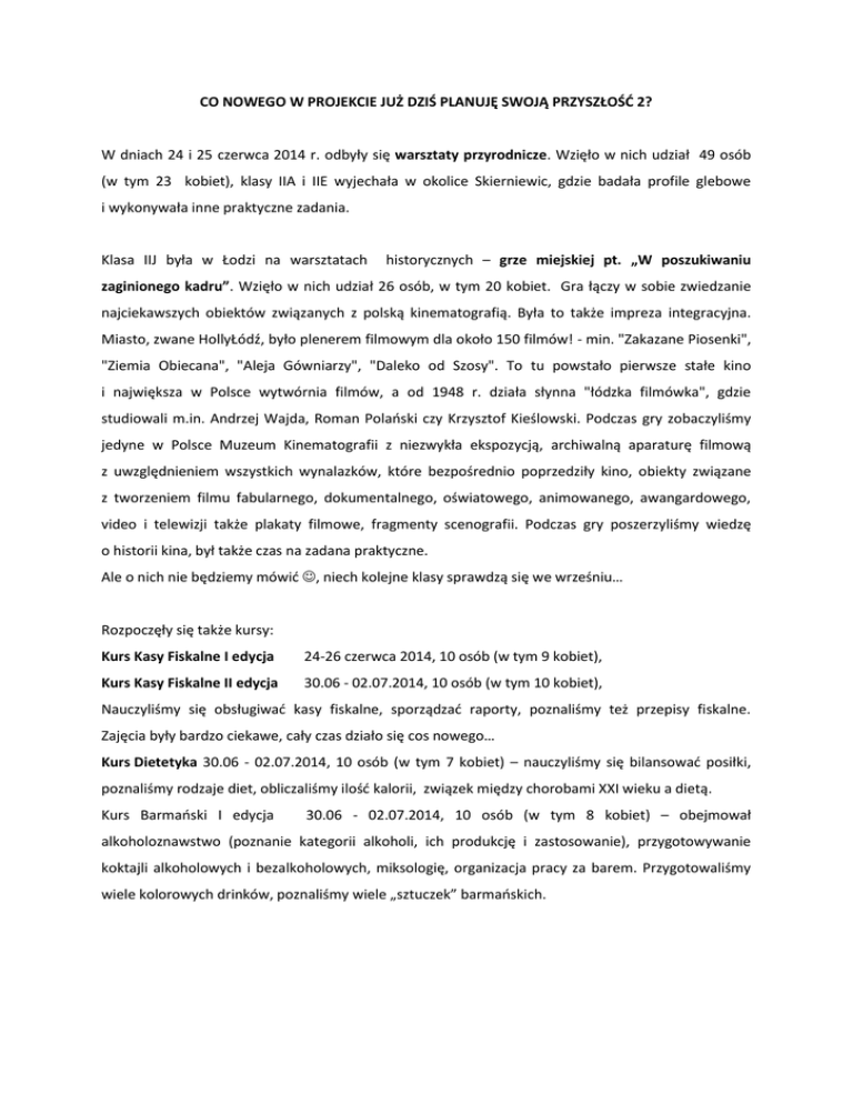 CO NOWEGO W PROJEKCIE JUŻ DZIŚ PLANUJĘ SWOJĄ PRZYSZŁOŚĆ 2? W dniach 24 i 25 czerwca 2014 r. odbyły się warsztaty przyrodnicze. Wzięło w nich udział 49 osób (w tym 23 kobiet), klasy IIA i IIE wyjechała w okolice Skierniewic, gdzie badała profile glebowe i wykonywała inne praktyczne zadania. Klasa IIJ była w Łodzi na warsztatach historycznych – grze miejskiej pt. „W poszukiwaniu zaginionego kadru”. Wzięło w nich udział 26 osób, w tym 20 kobiet. Gra łączy w sobie zwiedzanie najciekawszych obiektów związanych z polską kinematografią. Była to także impreza integracyjna. Miasto, zwane HollyŁódź, było plenerem filmowym dla około 150 filmów! - min. "Zakazane Piosenki", "Ziemia Obiecana", "Aleja Gówniarzy", "Daleko od Szosy". To tu powstało pierwsze stałe kino i największa w Polsce wytwórnia filmów, a od 1948 r. działa słynna "łódzka filmówka", gdzie studiowali m.in. Andrzej Wajda, Roman Polański czy Krzysztof Kieślowski. Podczas gry zobaczyliśmy jedyne w Polsce Muzeum Kinematografii z niezwykła ekspozycją, archiwalną aparaturę filmową z uwzględnieniem wszystkich wynalazków, które bezpośrednio poprzedziły kino, obiekty związane z tworzeniem filmu fabularnego, dokumentalnego, oświatowego, animowanego, awangardowego, video i telewizji także plakaty filmowe, fragmenty scenografii. Podczas gry poszerzyliśmy wiedzę o historii kina, był także czas na zadana praktyczne. Ale o nich nie będziemy mówić , niech kolejne klasy sprawdzą się we wrześniu… Rozpoczęły się także kursy: Kurs Kasy Fiskalne I edycja 24-26 czerwca 2014, 10 osób (w tym 9 kobiet), Kurs Kasy Fiskalne II edycja 30.06 - 02.07.2014, 10 osób (w tym 10 kobiet), Nauczyliśmy się obsługiwać kasy fiskalne, sporządzać raporty, poznaliśmy też przepisy fiskalne. Zajęcia były bardzo ciekawe, cały czas działo się cos nowego… Kurs Dietetyka 30.06 - 02.07.2014, 10 osób (w tym 7 kobiet) – nauczyliśmy się bilansować posiłki, poznaliśmy rodzaje diet, obliczaliśmy ilość kalorii, związek między chorobami XXI wieku a dietą. Kurs Barmański I edycja 30.06 - 02.07.2014, 10 osób (w tym 8 kobiet) – obejmował alkoholoznawstwo (poznanie kategorii alkoholi, ich produkcję i zastosowanie), przygotowywanie koktajli alkoholowych i bezalkoholowych, miksologię, organizacja pracy za barem. Przygotowaliśmy wiele kolorowych drinków, poznaliśmy wiele „sztuczek” barmańskich. W dniach 22-26 czerwca 2014 r. wyruszyliśmy do Spały, aby wziąć udział w programie Spadochron. 30 osób zakwaterowano w Ośrodku FWP w Spale. W czasie wyjazdu zrealizowaliśmy program Spadochron, spacerowaliśmy po urokliwej Spale, zwiedziliśmy okolice: Niebieskie Źródła, Groty Nagórzyckie, poniemiecki bunkier w Konewce oraz historyczną część Spały. Był czas na relaks i odpoczynek, bo przecież to już prawie koniec roku szkolnego… Zapraszamy na kolejne ciekawe zajęcia już w wakacje!