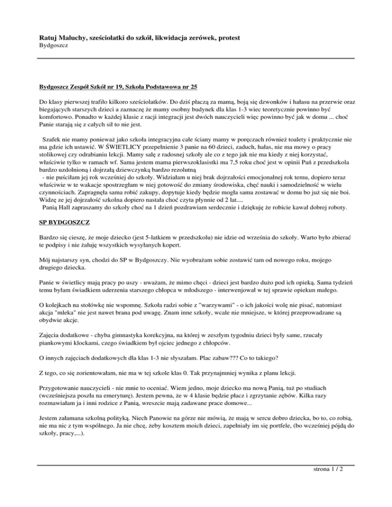 Ratuj Maluchy, sześciolatki do szkół, likwidacja zerówek, protest Bydgoszcz Bydgoszcz Zespół Szkół nr 19, Szkoła Podstawowa nr 25 Do klasy pierwszej trafiło kilkoro sześciolatków. Do dziś płaczą za mamą, boją się dzwonków i hałasu na przerwie oraz biegających starszych dzieci a zaznaczę że mamy osobny budynek dla klas 1-3 wiec teoretycznie powinno być komfortowo. Ponadto w każdej klasie z racji integracji jest dwóch nauczycieli więc powinno być jak w domu ... choć Panie starają się z całych sił to nie jest. Szafek nie mamy ponieważ jako szkoła integracyjna całe ściany mamy w poręczach również toalety i praktycznie nie ma gdzie ich ustawić. W ŚWIETLICY przepełnienie 3 panie na 60 dzieci, zaduch, hałas, nie ma mowy o pracy stolikowej czy odrabianiu lekcji. Mamy salę z radosnej szkoły ale co z tego jak nie ma kiedy z niej korzystać, właściwie tylko w ramach wf. Sama jestem mama pierwszoklasistki ma 7,5 roku choć jest w opinii Pań z przedszkola bardzo uzdolnioną i dojrzałą dziewczynką bardzo rezolutną - nie puściłam jej rok wcześniej do szkoły. Widziałam u niej brak dojrzałości emocjonalnej rok temu, dopiero teraz właściwie w te wakacje spostrzegłam w niej gotowość do zmiany środowiska, chęć nauki i samodzielność w wielu czynnościach. Zapragnęła sama robić zakupy, dopytuje kiedy będzie mogła sama zostawać w domu bo już się nie boi. Widzę ze jej dojrzałość szkolna dopiero nastała choć czyta płynnie od 2 lat.... Panią Hall zapraszamy do szkoły choć na 1 dzień pozdrawiam serdecznie i dziękuję że robicie kawał dobrej roboty. SP BYDGOSZCZ Bardzo się cieszę, że moje dziecko (jest 5-latkiem w przedszkolu) nie idzie od września do szkoły. Warto było zbierać te podpisy i nie żałuję wszystkich wysyłanych kopert. Mój najstarszy syn, chodzi do SP w Bydgoszczy. Nie wyobrażam sobie zostawić tam od nowego roku, mojego drugiego dziecka. Panie w świetlicy mają pracy po uszy - uważam, że mimo chęci - dzieci jest bardzo dużo pod ich opieką. Sama tydzień temu byłam świadkiem uderzenia starszego chłopca w młodszego - interwenjował w tej sprawie opiekun małego. O kolejkach na stołówkę nie wspomnę. Szkoła radzi sobie z "warzywami" - o ich jakości wolę nie pisać, natomiast akcja "mleka" nie jest nawet brana pod uwagę. Znam inne szkoły, wcale nie mniejsze, w której przeprowadzane są obydwie akcje. Zajęcia dodatkowe - chyba gimnastyka korekcyjna, na której w zeszłym tygodniu dzieci były same, rzucały piankowymi klockami, czego świadkiem był ojciec jednego z chłopców. O innych zajęciach dodatkowych dla klas 1-3 nie słyszałam. Plac zabaw??? Co to takiego? Z tego, co się zorientowałam, nie ma w tej szkole klas 0. Tak przynajmniej wynika z planu lekcji. Przygotowanie nauczycieli - nie mnie to oceniać. Wiem jedno, moje dziecko ma nową Panią, tuż po studiach (wcześniejsza poszła na emeryturę). Jestem pewna, że w 4 klasie będzie płacz i zgrzytanie zębów. Kilka razy rozmawiałam ja i inni rodzice z Panią, wreszcie mają zadawane prace domowe... Jestem załamana szkolną polityką. Niech Panowie na górze nie mówią, że mają w sercu dobro dziecka, bo to, co robią, nie ma nic z tym wspólnego. Ja nie chcę, żeby kosztem moich dzieci, zapełniały im się portfele, (bo wcześniej pójdą do szkoły, pracy,...). strona 1 / 2 Ratuj Maluchy, sześciolatki do szkół, likwidacja zerówek, protest Bydgoszcz strona 2 / 2