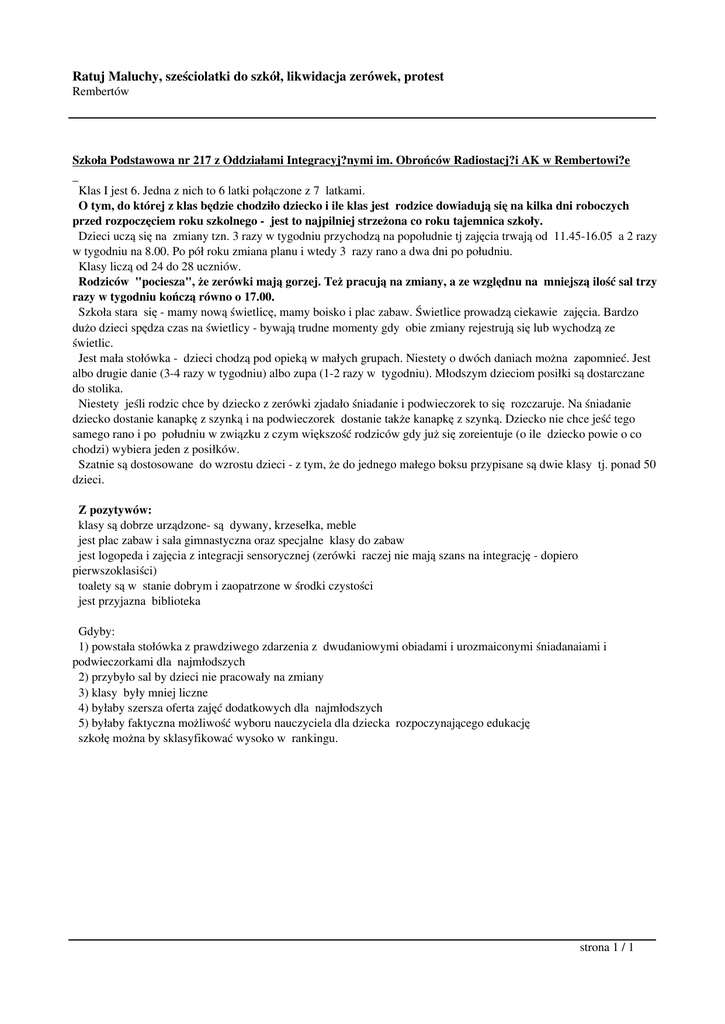 Ratuj Maluchy, sześciolatki do szkół, likwidacja zerówek, protest Rembertów Szkoła Podstawowa nr 217 z Oddziałami Integracyj?nymi im. Obrońców Radiostacj?i AK w Rembertowi?e Klas I jest 6. Jedna z nich to 6 latki połączone z 7 latkami. O tym, do której z klas będzie chodziło dziecko i ile klas jest rodzice dowiadują się na kilka dni roboczych przed rozpoczęciem roku szkolnego - jest to najpilniej strzeżona co roku tajemnica szkoły. Dzieci uczą się na zmiany tzn. 3 razy w tygodniu przychodzą na popołudnie tj zajęcia trwają od 11.45-16.05 a 2 razy w tygodniu na 8.00. Po pół roku zmiana planu i wtedy 3 razy rano a dwa dni po południu. Klasy liczą od 24 do 28 uczniów. Rodziców "pociesza", że zerówki mają gorzej. Też pracują na zmiany, a ze względnu na mniejszą ilość sal trzy razy w tygodniu kończą równo o 17.00. Szkoła stara się - mamy nową świetlicę, mamy boisko i plac zabaw. Świetlice prowadzą ciekawie zajęcia. Bardzo dużo dzieci spędza czas na świetlicy - bywają trudne momenty gdy obie zmiany rejestrują się lub wychodzą ze świetlic. Jest mała stołówka - dzieci chodzą pod opieką w małych grupach. Niestety o dwóch daniach można zapomnieć. Jest albo drugie danie (3-4 razy w tygodniu) albo zupa (1-2 razy w tygodniu). Młodszym dzieciom posiłki są dostarczane do stolika. Niestety jeśli rodzic chce by dziecko z zerówki zjadało śniadanie i podwieczorek to się rozczaruje. Na śniadanie dziecko dostanie kanapkę z szynką i na podwieczorek dostanie także kanapkę z szynką. Dziecko nie chce jeść tego samego rano i po południu w związku z czym większość rodziców gdy już się zoreientuje (o ile dziecko powie o co chodzi) wybiera jeden z posiłków. Szatnie są dostosowane do wzrostu dzieci - z tym, że do jednego małego boksu przypisane są dwie klasy tj. ponad 50 dzieci. Z pozytywów: klasy są dobrze urządzone- są dywany, krzesełka, meble jest plac zabaw i sala gimnastyczna oraz specjalne klasy do zabaw jest logopeda i zajęcia z integracji sensorycznej (zerówki raczej nie mają szans na integrację - dopiero pierwszoklasiści) toalety są w stanie dobrym i zaopatrzone w środki czystości jest przyjazna biblioteka Gdyby: 1) powstała stołówka z prawdziwego zdarzenia z dwudaniowymi obiadami i urozmaiconymi śniadanaiami i podwieczorkami dla najmłodszych 2) przybyło sal by dzieci nie pracowały na zmiany 3) klasy były mniej liczne 4) byłaby szersza oferta zajęć dodatkowych dla najmłodszych 5) byłaby faktyczna możliwość wyboru nauczyciela dla dziecka rozpoczynającego edukację szkołę można by sklasyfikować wysoko w rankingu. strona 1 / 1