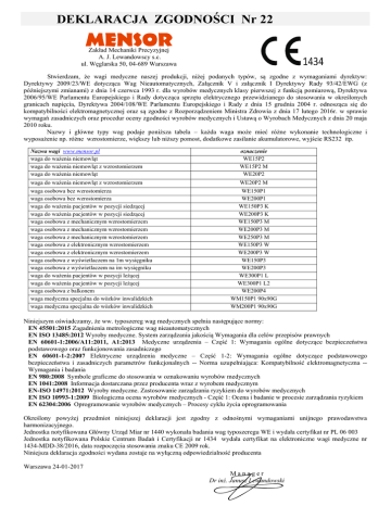 DEKLARACJA ZGODNOŚCI Nr 22 Zakład Mechaniki Precyzyjnej A. J. Lewandowscy s.c. ul. Węglarska 50, 04-689 Warszawa Stwierdzam, że wagi medyczne naszej produkcji, niżej podanych typów, są zgodne z wymaganiami dyrektyw: Dyrektywy 2009/23/WE dotycząca Wag Nieautomatycznych, Załącznik V i załącznik I Dyrektywy Rady 93/42/EWG (z późniejszymi zmianami) z dnia 14 czerwca 1993 r. dla wyrobów medycznych klasy pierwszej z funkcją pomiarową, Dyrektywa 2006/95/WE Parlamentu Europejskiego i Rady dotycząca sprzętu elektrycznego przewidzianego do stosowania w określonych granicach napięcia, Dyrektywa 2004/108/WE Parlamentu Europejskiego i Rady z dnia 15 grudnia 2004 r. odnosząca się do kompatybilności elektromagnetycznej oraz są zgodne z Rozporządzeniem Ministra Zdrowia z dnia 17 lutego 2016r. w sprawie wymagań zasadniczych oraz procedur oceny zgodności wyrobów medycznych i Ustawą o Wyrobach Medycznych z dnia 20 maja 2010 roku. Nazwy i główne typy wag podaje poniższa tabela – każda waga może mieć różne wykonanie technologiczne i wyposażenie np. różne wzrostomierze, większy lub niższy pomost, dodatkowe zasilanie akumulatorowe, wyjście RS232 itp. Nazwa wagi www.mensor.pl waga do ważenia niemowląt waga do ważenia niemowląt z wzrostomierzem waga do ważenia niemowląt oznaczenie WE15P2 WE15P2 M WE20P2 waga do ważenia niemowląt z wzrostomierzem WE20P2 M waga osobowa bez wzrostomierza waga osobowa bez wzrostomierza waga do ważenia pacjentów w pozycji siedzącej waga do ważenia pacjentów w pozycji siedzącej waga osobowa z mechanicznym wzrostomierzem waga osobowa z mechanicznym wzrostomierzem waga osobowa z mechanicznym wzrostomierzem waga osobowa z elektronicznym wzrostomierzem waga osobowa z elektronicznym wzrostomierzem waga osobowa z wyświetlaczem na 1m wysięgniku waga osobowa z wyświetlaczem na im wysięgniku waga do ważenia pacjentów w pozycji leżącej waga do ważenia pacjentów w pozycji leżącej waga osobowa z balkonem waga medyczna specjalna do wózków inwalidzkich waga medyczna specjalna do wózków inwalidzkich WE150P1 WE200P1 WE150P3 K WE200P3 K WE150P3 M WE200P3 M WE250P3 M WE150P3 W WE200P3 W WE150P3 WE200P3 WE300P1 L WE300P1 L2 WE200P4 WM150P1 90x90G WM200P1 90x90G Niniejszym oświadczamy, że ww. typoszereg wag medycznych spełnia następujące normy: EN 45501:2015 Zagadnienia metrologiczne wag nieautomatycznych EN ISO 13485:2012 Wyroby medyczne. System zarządzania jakością Wymagania dla celów przepisów prawnych EN 60601-1:2006/A11:2011, A1:2013 Medyczne urządzenia – Część 1: Wymagania ogólne dotyczące bezpieczeństwa podstawowego oraz funkcjonowania zasadniczego EN 60601-1-2:2007 Elektryczne urządzenia medyczne – Część 1-2: Wymagania ogólne dotyczące podstawowego bezpieczeństwa i zasadniczych parametrów funkcjonalnych -- Norma uzupełniająca: Kompatybilność elektromagnetyczna -Wymagania i badania EN 980:2008 Symbole graficzne do stosowania w oznakowaniu wyrobów medycznych EN 1041:2008 Informacja dostarczana przez producenta wraz z wyrobem medycznym EN-ISO 14971:2012 Wyroby medyczne. Zastosowanie zarządzania ryzykiem do wyrobów medycznych EN ISO 10993-1:2009 Biologiczna ocena wyrobów medycznych - Część 1: Ocena i badanie w procesie zarządzania ryzykiem EN 62304:2006 Oprogramowanie wyrobów medycznych – Procesy cyklu życia oprogramowania Określony powyżej przedmiot niniejszej deklaracji jest zgodny z odnośnymi wymaganiami unijnego prawodawstwa harmonizacyjnego. Jednostka notyfikowana Główny Urząd Miar nr 1440 wykonała badania wag typoszeregu WE i wydała certyfikat nr PL 06 003 Jednostka notyfikowana Polskie Centrum Badań i Certyfikacji nr 1434 wydała certyfikat na elektroniczne wagi medyczne nr 1434-MDD-38/2016, data rozpoczęcia stosowania znaku CE 2009 rok. Niniejsza deklaracja zgodności wydana zostaje na wyłączną odpowiedzialność producenta Warszawa 24-01-2017 Manager Dr inż. Janusz Lewandowski