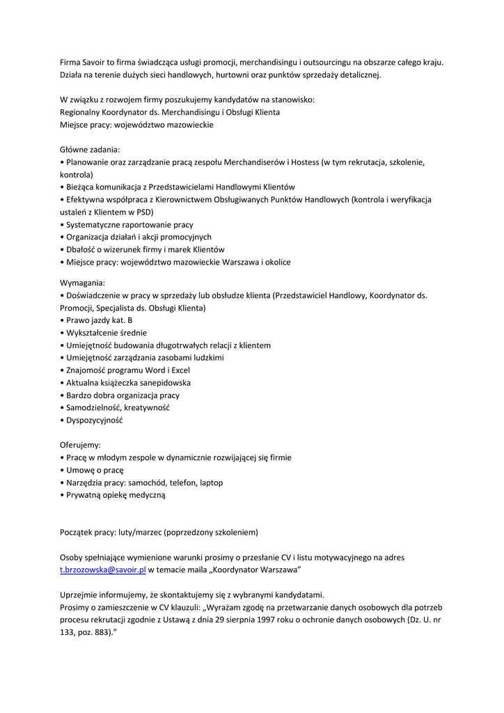 Firma Savoir to firma świadcząca usługi promocji, merchandisingu i outsourcingu na obszarze całego kraju. Działa na terenie dużych sieci handlowych, hurtowni oraz punktów sprzedaży detalicznej. W związku z rozwojem firmy poszukujemy kandydatów na stanowisko: Regionalny Koordynator ds. Merchandisingu i Obsługi Klienta Miejsce pracy: województwo mazowieckie Główne zadania: • Planowanie oraz zarządzanie pracą zespołu Merchandiserów i Hostess (w tym rekrutacja, szkolenie, kontrola) • Bieżąca komunikacja z Przedstawicielami Handlowymi Klientów • Efektywna współpraca z Kierownictwem Obsługiwanych Punktów Handlowych (kontrola i weryfikacja ustaleń z Klientem w PSD) • Systematyczne raportowanie pracy • Organizacja działań i akcji promocyjnych • Dbałość o wizerunek firmy i marek Klientów • Miejsce pracy: województwo mazowieckie Warszawa i okolice Wymagania: • Doświadczenie w pracy w sprzedaży lub obsłudze klienta (Przedstawiciel Handlowy, Koordynator ds. Promocji, Specjalista ds. Obsługi Klienta) • Prawo jazdy kat. B • Wykształcenie średnie • Umiejętność budowania długotrwałych relacji z klientem • Umiejętność zarządzania zasobami ludzkimi • Znajomość programu Word i Excel • Aktualna książeczka sanepidowska • Bardzo dobra organizacja pracy • Samodzielność, kreatywność • Dyspozycyjność Oferujemy: • Pracę w młodym zespole w dynamicznie rozwijającej się firmie • Umowę o pracę • Narzędzia pracy: samochód, telefon, laptop • Prywatną opiekę medyczną Początek pracy: luty/marzec (poprzedzony szkoleniem) Osoby spełniające wymienione warunki prosimy o przesłanie CV i listu motywacyjnego na adres [email protected] w temacie maila „Koordynator Warszawa” Uprzejmie informujemy, że skontaktujemy się z wybranymi kandydatami. Prosimy o zamieszczenie w CV klauzuli: „Wyrażam zgodę na przetwarzanie danych osobowych dla potrzeb procesu rekrutacji zgodnie z Ustawą z dnia 29 sierpnia 1997 roku o ochronie danych osobowych (Dz. U. nr 133, poz. 883).”
