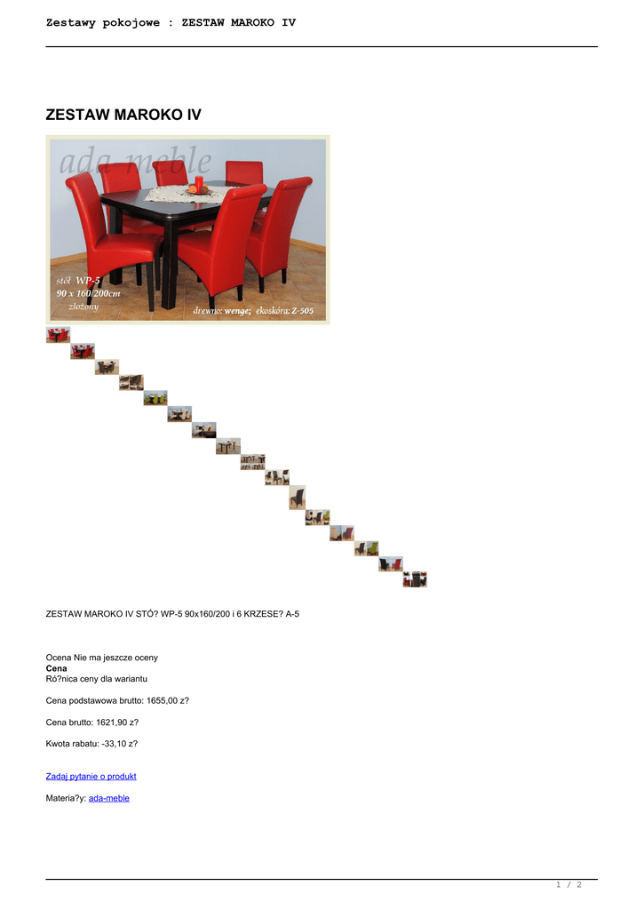 Zestawy pokojowe : ZESTAW MAROKO IV ZESTAW MAROKO IV ZESTAW MAROKO IV STÓ? WP-5 90x160/200 i 6 KRZESE? A-5 Ocena Nie ma jeszcze oceny Cena Ró?nica ceny dla wariantu Cena podstawowa brutto: 1655,00 z? Cena brutto: 1621,90 z? Kwota rabatu: -33,10 z? Zadaj pytanie o produkt Materia?y: ada-meble 1 / 2 Zestawy pokojowe : ZESTAW MAROKO IV Szczegó?y produktu Stó? WP-5 wykonany z drewna bukowego, blat sto?u z p?yty MDF s? to p?yty powstaj?ce w wyniku sprasowania w warunkach wysokiego ci?nienia i temperatury w?ókien drzewnych z dodatkiem organicznych zwi?zków ??cz?cych i utwardzaj?cych. Wysoka jako??, szerokie zastosowanie praktyczne. Blat PROSTOK?T ZAOKR?GLONY OKLEINA NATURALNA - rozk?adany. Podstawa wykonana z drewna bukowego. Wymiary sto?u: d?ugo?? sto?u 160cm /po roz?o?eniu 200 x 90/; 1 wk?ad 40cm; szeroko?? blatu 90 / blat z MDF na ?o?yskowych prowadnicach; wysoko?? sto?u 76 cm; mo?liwo?? roz?o?enia sto?u: 1,6m; 2,0m. Krzes?o A-5 wykonane z drewna bukowego wysokogatunkowej bejcy i lakieru. Obicie krzes?a elegancko przeszywane. Istnieje mo?liwo?? wyboru koloru obicia. Wymiary krzes?a: wysoko?? krzes?a 96 cm; szeroko?? siedziska krzes?a 48 cm; g??boko?? siedziska krzes?a 44 cm; wysoko?? siedziska krzes?a 49 cm. Recenzje Nikt jeszcze nie ocenia? tego produktu. 2 / 2 Powered by TCPDF (www.tcpdf.org)