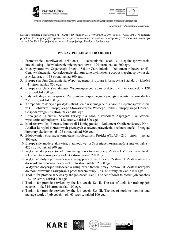 Załącznik nr 1 do zapytania ofertowego Dotyczy zapytania ofertowego nr 15/2014/TP (Numer CPV 78900000-2, 79810000-5, 79823000-9) w ramach projektu „Trener pracy jako sposób na zwiększenie zatrudnienia osób niepełnosprawnych” współfinansowanego ze środków Unii Europejskiej w ramach Europejskiego Funduszu Społecznego. WYKAZ PUBLIKACJI DO DRUKU 1. Promowanie możliwości szkolenia i zatrudniania osób z niepełnosprawnością intelektualną – doświadczenie międzynarodowe - 129 stron, nakład 800 egz. 2. Międzynarodowa Organizacja Pracy - Sektor Zatrudnienia - Dokument roboczy nr 43: Cena wykluczenia: Konsekwencje ekonomiczne wykluczenia osób z niepełnosprawnością z rynku pracy - 138 stron, nakład 800 egz. 3. Europejska Unia Zatrudnienia Wspomaganego. Broszura informacyjna i standardy jakości - 41 stron, nakład 800 egz. 4. Europejska Unia Zatrudnienia Wspomaganego. Zbiór praktycznych wskazówek - 128 stron, nakład 800 egz. 5. Indywidualny staż i wsparcie. Zatrudnienie wspomagane - podejście oparte na dowodach 235 stron, nakład 800 egz. 6. Kompendium dobrych praktyk Zatrudnienie wspomagane dla osób z niepełnosprawnością w UE i obszarze Europejskiego Stowarzyszenia Wolnego Handlu/Europejskiego Obszaru Gospodarczego - 65 stron, nakład 800 egz. 7. Rozwijanie Talentów. Ścieżki kariery dla osób z zespołem Aspergera i autyzmem wysokofunkcjonującym - 182 strony, nakład 800 egz. 8. Ministerstwo Ds. Biznesu, Innowacji i Umiejętności - Dokument Okolicznościowy Nr 4: Analiza korzyści biznesowych płynących z równouprawnienia i różnorodności. Przegląd literatury akademickiej - 75 stron, nakład 800 egz. 9. Zdobywanie i ewaluacja kompetencji społecznych. Projekt ATLAS - 210 stron, nakład 800 egz. 10. Europejskie modele aktywizacji zawodowej osób z niepełnosprawnością intelektualną 423 strony, nakład 800 egz. 11. Wytyczne dotyczące świadczenia usług przez trenera pracy. Zestaw I. Zestaw narzędzi do rekrutacji trenerów pracy – ok. 45 stron, nakład 2 000 egz. 12. Wytyczne dotyczące świadczenia usług przez trenera pracy. Zestaw II. Zestaw narzędzi do szkolenia trenerów pracy – ok. 314 stron, nakład 2 000 egz. 13. Wytyczne dotyczące świadczenia usług przez trenera pracy. Zestaw III. Zestaw narzędzi do monitorowania i zarządzania pracą trenera pracy – ok. 63 strony, nakład 2 000 egz. 14. Toolkit for provide services by the job coach. Set I. The set of tools to recruit job coaches – ok. 45 stron, nakład 100 egz. 15. Toolkit for provide services by the job coach. Set II. The set of tools for training job coaches – ok. 314 stron, nakład 100 egz. 16. Toolkit for provide services by the job coach. Set III. The set of tools to monitor and manage work of job coach – ok. 63 strony, nakład 100 egz.
