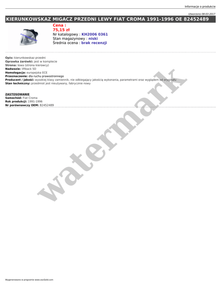 Informacje o produkcie Utworzono 08-03-2017 KIERUNKOWSKAZ MIGACZ PRZEDNI LEWY FIAT CROMA 1991-1996 OE 82452489 Cena : 75,15 zł Nr katalogowy : KH2006 0361 Stan magazynowy : niski Średnia ocena : brak recenzji w at ZASTOSOWANIE Samochód: Fiat Croma Rok produkcji: 1991-1996 Nr porównawczy OEM: 82452489 er m ar k Opis: kierunkowskaz przedni Oprawka żarówki: jest w komplecie Strona: lewa (strona kierowcy) Nadwozie: liftback 5D Homologacja: europejska ECE Przeznaczenie: dla ruchu prawostronnego Producent / jakość: wysokiej klasy zamiennik, nie odbiegający jakością wykonania, parametrami oraz wyglądem od oryginału Stan techniczny: przedmiot jest nieużywany, fabrycznie nowy Wygenerowano w programie www.oscGold.com