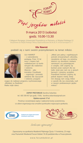 Pi ę ć j ę z i c ś o ł yk ów mi 9 marca 2013 (sobota) godz. 10.00-13.30 Collegium Rungego, Uniwersytet Przyrodniczy w Poznaniu, ul. Wojska Polskiego 52 skrzyżowanie ulic Wojska Polskiego i Witosa, dojazd autobusami: 60, 64, 82, 91, 93 lub tramwajami 9, 11 Ula Nawrot podzieli się z nami swoimi przemyśleniami na temat miłości. ULA NAWROT – z wykształcenia pedagog. Przez 10 lat wraz z mężem byli wykładowcami na konferencjach dla małżeństw i rodziców. Obecnie – jako instruktor CrossRoads – organizuje i prowadzi szkolenia dla nauczycieli i rodziców, przygotowujące do realizacji programu wychowawczego „Młodzież na Rozdrożu”. Matka trójki dzieci. „Miłość jest jedną z najsilniejszych potrzeb emocjonalnych człowieka, niezależnie od tego, czy jesteśmy dziećmi czy dorosłymi, osobami samotnymi czy pozostającymi w związku. Jeśli czujemy się kochani przez ważnych dla nas ludzi, świat jawi nam się w jasnych barwach i jesteśmy szczęśliwi. Prawdziwie kochani czujemy się jednak dopiero wtedy, kiedy inni okazują nam swoją miłość w sposób dla nas zrozumiały, czyli w naszym podstawowym języku miłości.” ZAPISY PRZYJMUJE: Karolina Sobańska tel. 605 358 457 (po godz. 17.00), [email protected] Opłata wynosi: 17 zł Prosimy o wcześniejsze zapisy i wpłacenie kwoty uczestnictwa, co ułatwi organizację oraz umożliwi punktualne rozpoczęcie spotkania. Spotkanie jest objęte patronatem medialnym radia Emaus Serdecznie zapraszamy! Zapraszamy na spotkania Akademii Pięknego Życia: 11 kwietnia, 23 maja oraz Poznański Weekend Forum Kobiet 19-20 października w Puszczykowie. w w w.forumkobiet . pl