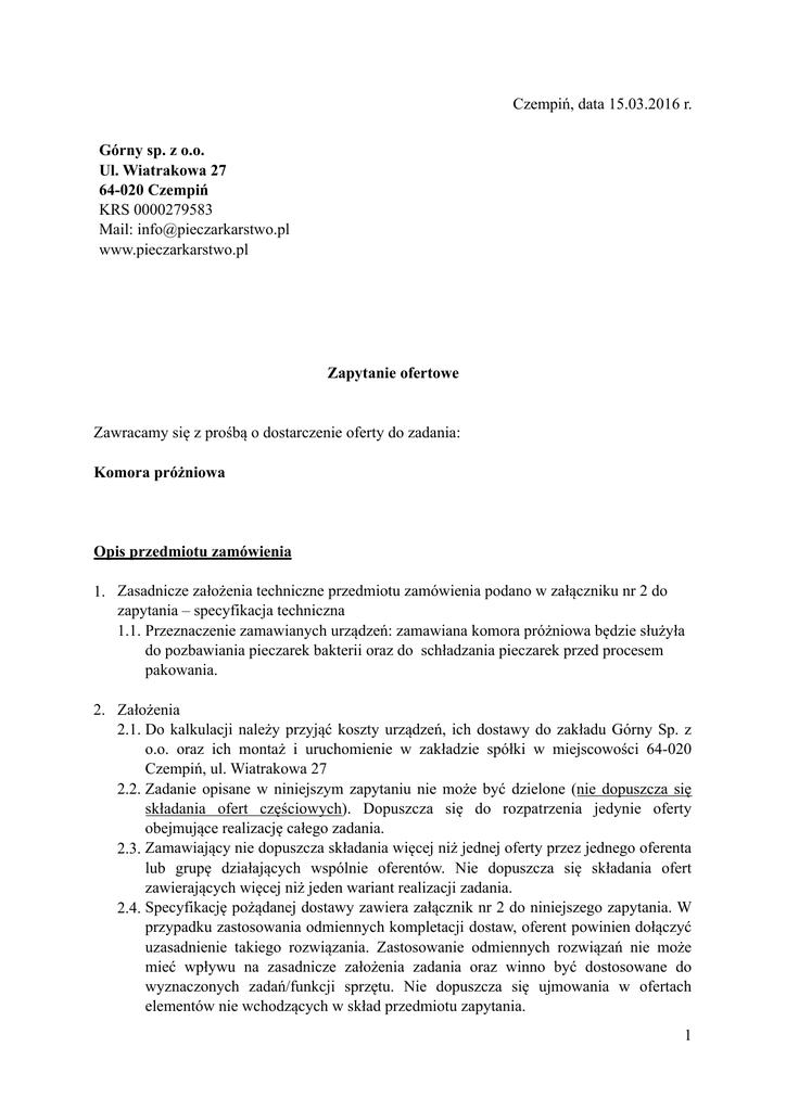 Czempiń, data 15.03.2016 r. Górny sp. z o.o. Ul. Wiatrakowa 27 64-020 Czempiń KRS 0000279583 Mail: [email protected] www.pieczarkarstwo.pl Zapytanie ofertowe Zawracamy się z prośbą o dostarczenie oferty do zadania: Komora próżniowa Opis przedmiotu zamówienia 1. Zasadnicze założenia techniczne przedmiotu zamówienia podano w załączniku nr 2 do zapytania – specyfikacja techniczna 1.1. Przeznaczenie zamawianych urządzeń: zamawiana komora próżniowa będzie służyła do pozbawiania pieczarek bakterii oraz do schładzania pieczarek przed procesem pakowania. 2. Założenia 2.1. Do kalkulacji należy przyjąć koszty urządzeń, ich dostawy do zakładu Górny Sp. z o.o. oraz ich montaż i uruchomienie w zakładzie spółki w miejscowości 64-020 Czempiń, ul. Wiatrakowa 27 2.2. Zadanie opisane w niniejszym zapytaniu nie może być dzielone (nie dopuszcza się składania ofert częściowych). Dopuszcza się do rozpatrzenia jedynie oferty obejmujące realizację całego zadania. 2.3. Zamawiający nie dopuszcza składania więcej niż jednej oferty przez jednego oferenta lub grupę działających wspólnie oferentów. Nie dopuszcza się składania ofert zawierających więcej niż jeden wariant realizacji zadania. 2.4. Specyfikację pożądanej dostawy zawiera załącznik nr 2 do niniejszego zapytania. W przypadku zastosowania odmiennych kompletacji dostaw, oferent powinien dołączyć uzasadnienie takiego rozwiązania. Zastosowanie odmiennych rozwiązań nie może mieć wpływu na zasadnicze założenia zadania oraz winno być dostosowane do wyznaczonych zadań/funkcji sprzętu. Nie dopuszcza się ujmowania w ofertach elementów nie wchodzących w skład przedmiotu zapytania. (1 Warunki udziału w postępowaniu 1. Oferenci muszą spełniać niżej wymienione warunki: 1) posiadać uprawnienia do wykonywania działalności lub czynności w zakresie odpowiadającym przedmiotowi zapytania oraz nie podlegać wykluczeniu z możliwości realizacji zadania na podstawie odrębnych przepisów lub prawomocnych wyroków sądu. W celu potwierdzenia spełniania niniejszego warunku Wykonawcy zobowiązani są przedłożyć następujące dokumenty: ✓ aktualny odpis elektroniczny z właściwego rejestru sądowego albo aktualne elektroniczne zaświadczenie o wpisie do ewidencji działalności gospodarczej, wystawionego nie wcześniej niż 14 dni przed upływem terminu składania ofert (w przypadku wspólnego ubiegania się o udzielenie niniejszego zamówienia przez dwóch lub więcej Wykonawców w ofercie muszą być złożone przedmiotowe dokumenty dla każdego z nich), 2) Posiadać niezbędną wiedzę i doświadczenie w branży dostawy i montażu maszyn oraz dysponować potencjałem technicznym i osobami zdolnymi do wykonania niniejszego zamówienia. 3) Znajdować się w sytuacji ekonomicznej i finansowej zapewniającej wykonanie niniejszego zamówienia, w szczególności posiadać ubezpieczenie od odpowiedzialności cywilnej za szkody wynikłe z tytułu prowadzonej działalności gospodarczej, 4) Nie znajdować się w stanie upadłości lub likwidacji 5) Nie podlegać wykluczeniu z postępowania 2. Jeżeli Wykonawca ma siedzibę lub miejsce zamieszkania poza terytorium Rzeczypospolitej Polskiej zamiast dokumentu, o którym mowa w pkt 1.1) składa dokument wystawiony w kraju, w którym ma siedzibę lub miejsce zamieszkania potwierdzające, że nie otwarto jego likwidacji, ani nie ogłoszono upadłości. 3. Ocena spełniania przedstawionych powyżej warunków zostanie dokonana na podstawie podpisanego przez oferentów oświadczenia wg wzoru załączonego do niniejszego zapytania. Kryteria oceny oferty 1. Kryteria oceny ofert – wybór najkorzystniejszej oferty nastąpi w oparciu o następujące kryteria. Oferent jest zobowiązany do umieszczenia w ofercie danych pozwalających na ocenę oferty wg poniższych kryteriów: Lp. Kryteria oceny oferty Waga kryterium 1 60% Wartość oferty (2 2 Gwarancja na przedmiot oferty (wyrażona w miesiącach) 10% 3 Efektywność energetyczna 30% Razem 100% Opis sposobu przyznawania punktacji 1. Oceniana oferta otrzyma zaokrągloną do dwóch miejsc po przecinku ilość punktów wynikających z kryteriów oceny oferty, wyliczanych na podstawie następujących wzorów: a) Wartość oferty Wartość wartość oferty najtańszej wartość oferty badanej x 100x znaczenie 60% - max. 60 pkt. b) Gwarancja bezwarunkowa na przedmiot oferty (wyrażona w miesiącach) Okres gwarancji gwarancja oferty badanej najdłuższy termin gwarancji x 100x znaczenie 10% max. 10 pkt. c) efektywność energetyczna w kW energii pierwotnej / kg(t) produktu Efekty wność energe tyczna 2. Najkorzystniejsza wartość efektywności energetycznej Efektywności energetycznej oferty badanej x 100 x znaczenie 10% max. 30 pkt. W przypadku uzyskania przez więcej niż jedną ofertę takiej samej ilości punktów wyliczonych wg ww. kryteriów, wybór nastąpi w oparciu o: Kryterium pierwsze – efektywność energetyczna - najkorzystniejsza wartość efektywności energetycznej Kryterium drugie (w przypadku takiego samego kryterium pierwszego) - wartość – wybór oferty tańszej Informacja na temat zakresu wykluczenia (3 W postępowaniu nie mogą brać udziału następujące podmioty: A. Podmioty nieposiadające doświadczenia w branży dostawy maszyn/urządzeń branży spożywczej B. Podmioty powiązane z Zamawiającym osobowo lub kapitałowo. Przez powiązania kapitałowe lub osobowe rozumie się wzajemne powiązania między beneficjentem lub osobami upoważnionymi do zaciągania zobowiązań w imieniu beneficjenta lub osobami wykonującymi w imieniu beneficjenta czynności związane z przygotowaniem i przeprowadzeniem procedury wyboru wykonawcy a wykonawcą, polegające w szczególności na: a. uczestniczeniu w spółce jako wspólnik spółki cywilnej lub spółki osobowej; b. posiadaniu co najmniej 10 % udziałów lub akcji; c. pełnieniu funkcji członka organu nadzorczego lub zarządzaj