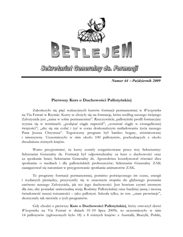 Numer 44 Październik 2009 Pierwszy Kurs o Duchowości Pallotyńskiej Zakończyło się pięć wakacyjnych kursów formacji permanentnej w Wieczerniku na Via Ferrari w Rzymie. Kursy te złożyły się na formację, która według naszego świętego Założyciela jest „sama w sobie permanentna”. Rzeczywiście, pallotyński profil formacyjny wyraża się w terminach: „podążać ciągle naprzód”; „wzrastać ciągle w ewangelicznej świętości”; „aby się nie cofać i żyć w coraz doskonalszym naśladowaniu życia naszego Pana Jezusa Chrystusa”. Tegoroczny program był bardzo bogaty, zróżnicowany i intensywny. Uczestniczyło w nim około 100 pallotynów, pochodzących z około dwudziestu różnych krajów. Warto przypomnieć, że kursy zostały zorganizowane przez trzy Sekretariaty: Sekretariat Generalny ds. Formacji był odpowiedzialny za kurs o duchowości oraz za spotkanie braci; Sekretariat Generalny ds. Apostolstwa koordynował również dwa spotkania: o mediach i dla pallotyńskich proboszczów; Sekretariat Generalny ZAK zaangażował się natomiast w przygotowanie spotkania animatorów ZAK. Te programy formacji permanentnej, pomimo poświęconego im czasu, energii i wydanych pieniędzy, przyczyniły się w znacznym stopniu do głębszego poznania zarówno naszego Założyciela, jak też jego duchowości. Jest bowiem czymś istotnym dla nas, aby posiadać uniwersalną wizję Rodziny Pallotyńskiej oraz bardziej jasną i mocną świadomość naszej tożsamości – jako pallotyni. Szkoda tylko, że tzw. „stare prowincje”, skorzystały tak niewiele z tych programów. Gdy chodzi o pierwszy Kurs o Duchowości Pallotyńskiej, który otworzył drzwi Wieczernika na Via Ferrari w dniach 01-10 lipca 2009r, to uczestniczyło w nim 14 pallotynów (zgłoszonych było 18) z 8 różnych krajów: z Australii, Brazylii, Polski, Rwandy, Kenii, Kamerunu, Indii i Ukrainy. Służebną posługę pełnili wobec nich jeden moderator i czterech tłumaczy (Nampudakam, Murphy, Małkiewicz, Dallazen i Stawicki). Jedenastu prelegentów, pallotynów i pallotynek, mężczyzn i kobiet, osób zakonnych i świeckich (Capretti, Turecka, Acerbi, Kupka, Todisco, Hanas, Celona, Murphy, Nampudakam, Montaldo i Stawicki) ukazało 12 różnorakich aspektów duchowości pallotyńskiej. Cała grupa, z wielkim entuzjazmem i zainteresowaniem, przemierzała szlaki św. Wincentego Pallottiego (Via del Pellegrino, Santo Spirito dei Napoletani, San Pantaleo, San Salvatore in Onda, Sapienza, Chiesa Nova, Santo Spirito in Sassia, Ponte Rotto, Regina Coeli, Pia Casa, Kolegium Irlandzkie, Kongregacja Rozkrzewiania Wiary, San Silvestro in Capite…), przeżywała bardzo znaczące celebracje liturgiczne, oraz uczestniczyła w dwudniowej formacji na temat ZAK razem z dwudziestką Sióstr Pallotynek Rzymskich i Pallotynek Misjonarek, które również przeżywały czas formacji permanentnej w Rzymie. Podczas Mszy św. na zakończenie kursu, której przewodniczył Przełożony Generalny w naszym kościele San Salvatore in Onda, ks. Friedrich Kretz podkreślił w homilii, że nie możemy już pozostawać tylko zwykłymi „widzami”, lecz musimy zanurzyć się w głębokim nurcie duchowości Pallottiego, aby jak najmocniej go poznać i pokochać. W środę, 8 lipca, wszyscy uczestniczyli w audiencji generalnej, podczas której papież Benedykt XVI zaprezentował swoją nową encyklikę społeczną Caritas in Veritate. Arcybiskup Giampaolo Crepaldi, sekretarz Papieskiej Rady Iustitia et Pax, opisał „gramatykę” tej encykliki w następującym określeniu: „otrzymanie poprzedza działanie”. Również uczestnicy Kursu o Duchowości Pallotyńskiej otrzymali wiele w pierwszych dniach lipca na Via Ferrari. Mamy nadzieję, że to co „otrzymali” na kursie, wpłynęło także na ich „działanie” po kursie. Rzeczywiście bowiem, „wiele zebrań się urządza w sprawie pobożnych dzieł – słusznie zauważa ks. Wincenty Pallotti – ale stosunkowo niewiele z nich osiąga cel, dla którego zostały one zwołane” (OOCC I, 121; Wybór Pism I, 269). Stwierdzenie Założyciela prowokuje do postawienia pytania: Czy kurs duchowości pallotyńskiej osiągnął cele, dla których został zwołany? Ks. Stanisław Stawicki SAC Rzym, Via Giuseppe Ferrari