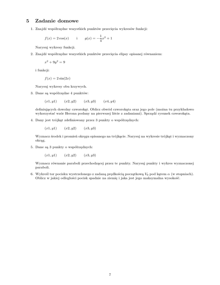 5 Zadanie domowe 1. Znajdź współrzędne wszystkich punktów przecięcia wykresów funkcji: f (x) = 2 cos(x) i 1 g(x) = − x2 + 1 4 Narysuj wykresy funkcji. 2. Znajdź współrzędne wszystkich punktów przecięcia elipsy opisanej równaniem: x2 + 9y 2 = 9 i funkcji: f (x) = 2 sin(2x) Narysuj wykresy obu krzywych. 3. Dane są współrzędne 4 punktów: (x1, y1) (x2, y2) (x3, y3) (x4, y4) definiujących dowolny czworokąt. Oblicz obwód czworokąta oraz jego pole (można tu przykładowo wykorzystać wzór Herona podany na pierwszej liście z zadaniami). Sprządź rysunek czworokąta. 4. Dany jest trójkąt zdefiniowany przez 3 punkty o współrzędnych: (x1, y1) (x2, y2) (x3, y3) Wyznacz środek i promień okręgu opisanego na trójkącie. Narysuj na wykresie trójkąt i wyznaczony okrąg. 5. Dane są 3 punkty o współrzędnych: (x1, y1) (x2, y2) (x3, y3) Wyznacz równanie paraboli przechodzącej przez te punkty. Narysuj punkty i wykres wyznaczonej paraboli. 6. Wykreśl tor pocisku wystrzelonego z zadaną prędkością początkową V0 pod kątem α (w stopniach). Oblicz w jakiej odległości pocisk spadnie na ziemię i jaka jest jego maksymalna wysokość. 7