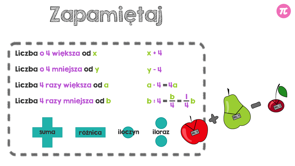 Zapamiętaj Liczba o 4 większa od x x+4 Liczba o 4 mniejsza od y y-4 Liczba 4 razy większa od a a . 4 = 4a Liczba 4 razy mniejsza od b 1 b b : 4 = - =-b 4 4 Ms. Ms. suma różnica iloczyn iloraz Mr. X Y Z