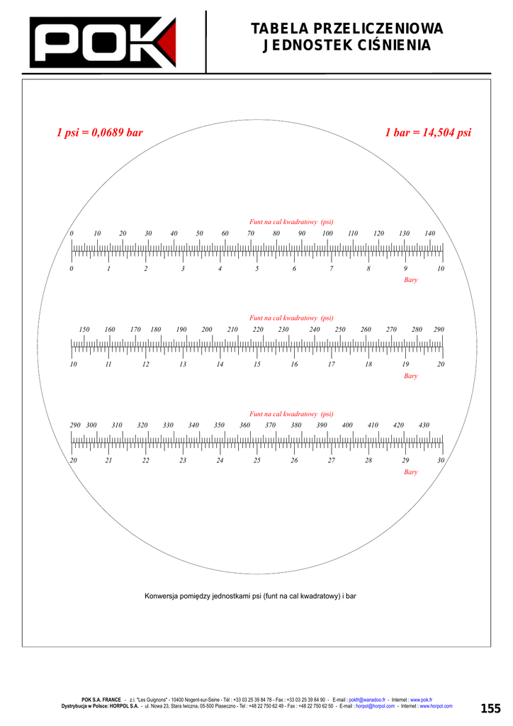 TABELA PRZELICZENIOWA JEDNOSTEK CIŚNIENIA 1 bar = 14,504 psi 1 psi = 0,0689 bar Funt na cal kwadratowy (psi) 0 10 0 20 30 1 40 2 50 3 60 70 4 80 5 90 100 6 110 7 120 130 8 140 9 10 Bary Funt na cal kwadratowy (psi) 150 10 160 11 170 180 190 12 200 13 210 220 14 230 15 240 16 250 17 260 18 270 280 19 290 20 Bary Funt na cal kwadratowy (psi) 290 300 20 310 21 320 22 330 340 23 350 24 360 370 25 380 26 390 400 27 410 28 420 430 29 30 Bary Konwersja pomiędzy jednostkami psi (funt na cal kwadratowy) i bar POK S.A. FRANCE - z.i. "Les Guignons" - 10400 Nogent-sur-Seine - Tél : +33 03 25 39 84 78 - Fax : +33 03 25 39 84 90 - E-mail : [email protected] - Internet : www.pok.fr Dystrybucja w Polsce: HORPOL S.A. - ul. Nowa 23, Stara Iwiczna, 05-500 Piaseczno - Tel : +48 22 750 62 49 - Fax : +48 22 750 62 50 - E-mail : [email protected] - Internet : www.horpol.com 155