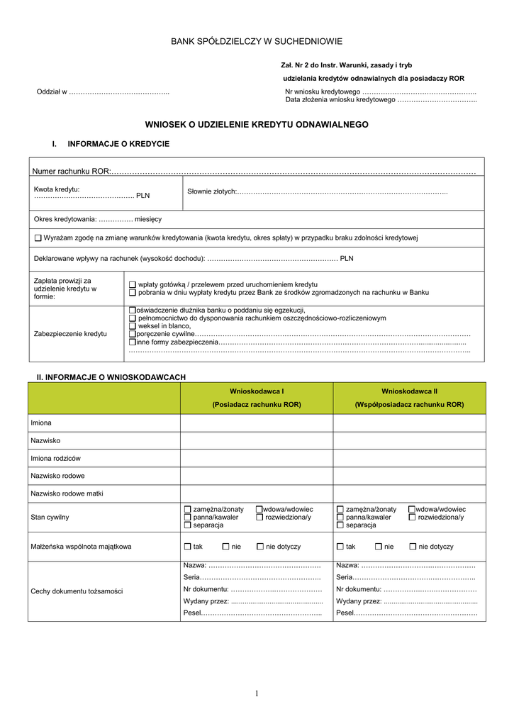 BANK SPÓŁDZIELCZY W SUCHEDNIOWIE Zał. Nr 2 do Instr. Warunki, zasady i tryb udzielania kredytów odnawialnych dla posiadaczy ROR Oddział w …………………………………….. Nr wniosku kredytowego ………………………………………….. Data złożenia wniosku kredytowego …………………………….. WNIOSEK O UDZIELENIE KREDYTU ODNAWIALNEGO I. INFORMACJE O KREDYCIE Numer rachunku ROR:…………………………………………………………………………………………………………………………… Kwota kredytu: …………….………………………. PLN Słownie złotych:……………………………………………………………………………….. Okres kredytowania: …………… miesięcy Wyrażam zgodę na zmianę warunków kredytowania (kwota kredytu, okres spłaty) w przypadku braku zdolności kredytowej Deklarowane wpływy na rachunek (wysokość dochodu): ………………………………………………… PLN Zapłata prowizji za udzielenie kredytu w formie: Zabezpieczenie kredytu wpłaty gotówką / przelewem przed uruchomieniem kredytu pobrania w dniu wypłaty kredytu przez Bank ze środków zgromadzonych na rachunku w Banku oświadczenie dłużnika banku o poddaniu się egzekucji, pełnomocnictwo do dysponowania rachunkiem oszczędnościowo-rozliczeniowym weksel in blanco, poręczenie cywilne………………………………………………………………………………………………………… inne formy zabezpieczenia……………………………………………………………………………......................... ………………………………………………………………………………………………………………………………….. II. INFORMACJE O WNIOSKODAWCACH Wnioskodawca I Wnioskodawca II (Posiadacz rachunku ROR) (Współposiadacz rachunku ROR) Imiona Nazwisko Imiona rodziców Nazwisko rodowe Nazwisko rodowe matki Stan cywilny zamężna/żonaty panna/kawaler separacja Małżeńska wspólnota majątkowa tak Cechy dokumentu tożsamości wdowa/wdowiec rozwiedziona/y nie nie dotyczy zamężna/żonaty panna/kawaler separacja tak nie wdowa/wdowiec rozwiedziona/y nie dotyczy Nazwa: …………………………………………. Nazwa: ………………………….………………. Seria…………………………………………….. Seria…………………………….……………….. Nr dokumentu: ……………….………………… Nr dokumentu: …………….…….……………… Wydany przez: ................................................ Wydany przez: ................................................. Pesel…………………………………………….. Pesel……………………………………………… 1 Adres zamieszkania Adres do korespondencji Nr telefonu (do wyboru) Wnioskodawca I Wnioskodawca II (Posiadacz rachunku ROR) (Współposiadacz rachunku ROR) Ulica: ………………………….…………………. Ulica: ……………………………………………... Nr domu: ………………….…………………….. Nr domu: …………………………………………. Nr lokalu………………….……………………… Nr lokalu: …………………….…………………… Kod: ……………………………………………... Kod: …………………………….………………… Miejscowość: …………………….……………… Miejscowość………………….………………….. Kraj: ……………………………………………... Kraj: ………………………….…………………… Ulica……...………………………….…………… Ulica……...…………………….….……………… Nr domu: ……...………………………………… Nr domu: ……...…………………….…………… Nr lokalu: ……...……………...………………… Nr lokalu: ……...…………….…………………… Kod……...………….……….…………………… Kod……...………..…………….………………… Miejscowość: ……...…………………………… Miejscowość: …………....……………………… Kraj: ……...……………………………………… Kraj: ……...…………….………………………… Stacjonarny…………………………….………… stacjonarny: ……………………………………… komórkowy: ………………………….………….. komórkowy: ……………………….……………… E-mail: Wykształcenie wyższe magisterskie licencjat/inżynier średnie zasadnicze zawodowe podstawowe/gimnazjalne wyższe magisterskie licencjat/inżynier średnie zasadnicze zawodowe podstawowe/gimnazjalne nie posiadam posiadam ROR w ................. nie posiadam posiadam ROR w ................. Wykonywany zawód Rachunek typu ROR w innych bankach III. INFORMACJE O DOCHODACH I WYDATKACH Wnioskodawca I Wnioskodawca II Całkowity staż pracy (w latach) Okres zatrudnienia u obecnego pracodawcy/czas prowadzenia obecnej dział. gospodarczej (w latach) Informacje o pracodawcy (nazwa, adres) Stanowisko Miesięczny dochód netto: Źródła dochodu właściciel firmy wyższa kadra zarządzająca średnia kadra zarządzająca urzędnik specjalista pracownik inne ..................................... PLN, w tym: umowa o pracę: .................................... emerytura: ............................................ renta: .................................................... zasiłek przedemerytalny: ...................... wolne zawody: ...................................... działalność gospodarcza: ..................... działalność rolnicza: ............................. umowa cywilno-prawna: ....................... umowa najmu: ...................................... umowa o pra
