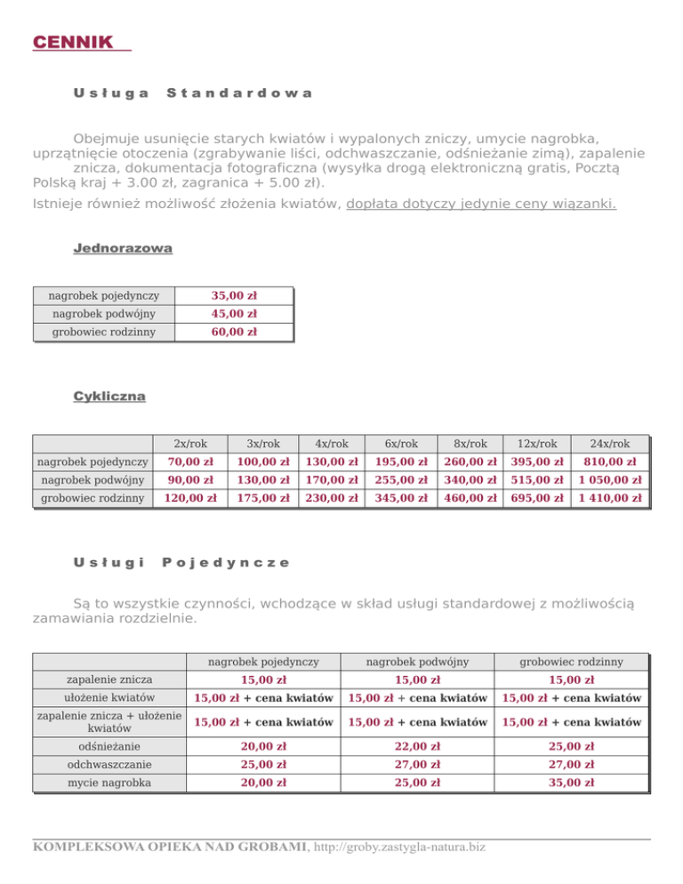 CENNIK Usługa Standardowa Obejmuje usunięcie starych kwiatów i wypalonych zniczy, umycie nagrobka, uprzątnięcie otoczenia (zgrabywanie liści, odchwaszczanie, odśnieżanie zimą), zapalenie znicza, dokumentacja fotograficzna (wysyłka drogą elektroniczną gratis, Pocztą Polską kraj + 3.00 zł, zagranica + 5.00 zł). Istnieje również możliwość złożenia kwiatów, dopłata dotyczy jedynie ceny wiązanki. Jednorazowa nagrobek pojedynczy 35,00 zł nagrobek podwójny 45,00 zł grobowiec rodzinny 60,00 zł Cykliczna 2x/rok 3x/rok 4x/rok 6x/rok 8x/rok 12x/rok 24x/rok nagrobek pojedynczy 70,00 zł 100,00 zł 130,00 zł 195,00 zł 260,00 zł 395,00 zł 810,00 zł nagrobek podwójny 90,00 zł 130,00 zł 170,00 zł 255,00 zł 340,00 zł 515,00 zł 1 050,00 zł grobowiec rodzinny 120,00 zł 175,00 zł 230,00 zł 345,00 zł 460,00 zł 695,00 zł 1 410,00 zł Usługi Pojedyncze Są to wszystkie czynności, wchodzące w skład usługi standardowej z możliwością zamawiania rozdzielnie. nagrobek pojedynczy nagrobek podwójny grobowiec rodzinny zapalenie znicza 15,00 zł 15,00 zł 15,00 zł ułożenie kwiatów 15,00 zł + cena kwiatów 15,00 zł + cena kwiatów 15,00 zł + cena kwiatów zapalenie znicza + ułożenie kwiatów 15,00 zł + cena kwiatów 15,00 zł + cena kwiatów 15,00 zł + cena kwiatów odśnieżanie 20,00 zł 22,00 zł 25,00 zł odchwaszczanie 25,00 zł 27,00 zł 27,00 zł mycie nagrobka 20,00 zł 25,00 zł 35,00 zł KOMPLEKSOWA OPIEKA NAD GROBAMI, http://groby.zastygla-natura.biz Usługi Dodatkowe pastowanie i polerowanie nagrobek pojedynczy nagrobek podwójny grobowiec rodzinny 30,00 zł 45,00 zł 60,00 zł obsadzanie grobu roślinami 25,00 zł + cena roślin odnawianie napisów 0,80 zł za literę wysypanie grysu lub żwiru od 25,00 zł wysypanie nowej ziemi lub torfu od 20,00 zł porządkowanie po ceremonii pogrzebowej 55,00 zł KOMPLEKSOWA OPIEKA NAD GROBAMI, http://groby.zastygla-natura.biz