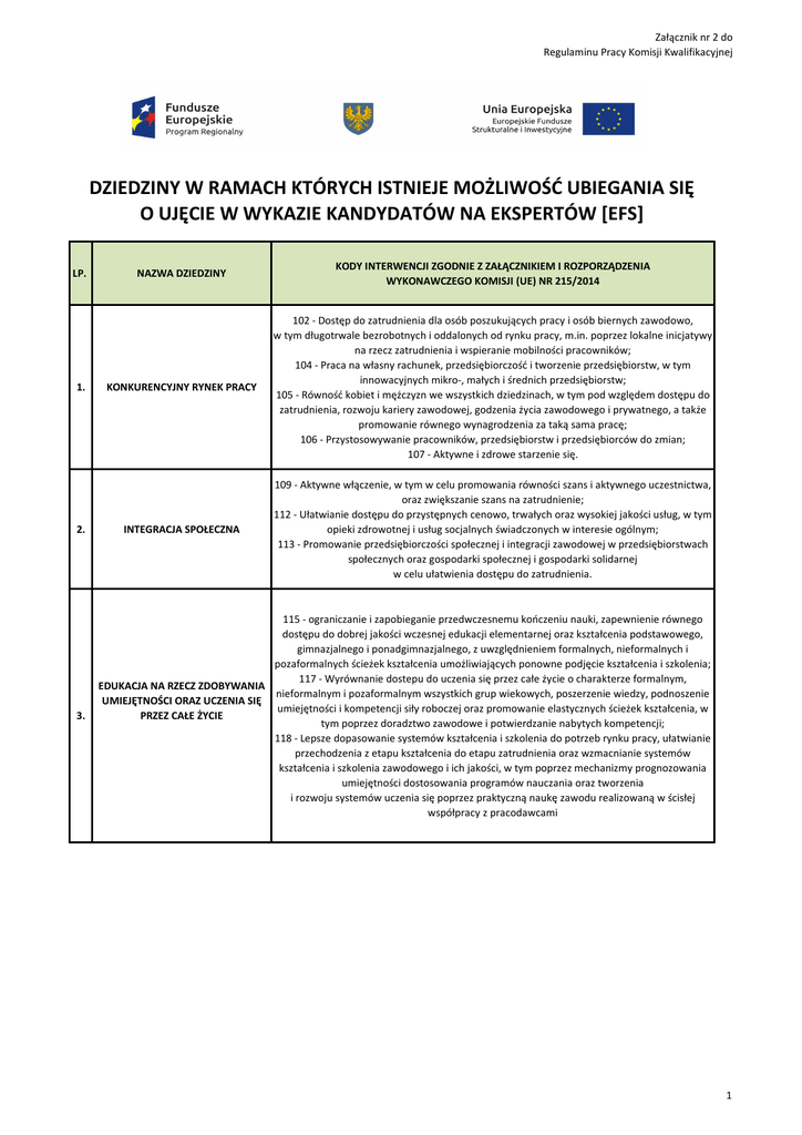 Załącznik nr 2 do Regulaminu Pracy Komisji Kwalifikacyjnej DZIEDZINY W RAMACH KTÓRYCH ISTNIEJE MOŻLIWOŚĆ UBIEGANIA SIĘ O UJĘCIE W WYKAZIE KANDYDATÓW NA EKSPERTÓW [EFS] LP. 1. 2. 3. NAZWA DZIEDZINY KODY INTERWENCJI ZGODNIE Z ZAŁĄCZNIKIEM I ROZPORZĄDZENIA WYKONAWCZEGO KOMISJI (UE) NR 215/2014 KONKURENCYJNY RYNEK PRACY 102 - Dostęp do zatrudnienia dla osób poszukujących pracy i osób biernych zawodowo, w tym długotrwale bezrobotnych i oddalonych od rynku pracy, m.in. poprzez lokalne inicjatywy na rzecz zatrudnienia i wspieranie mobilności pracowników; 104 - Praca na własny rachunek, przedsiębiorczość i tworzenie przedsiębiorstw, w tym innowacyjnych mikro-, małych i średnich przedsiębiorstw; 105 - Równość kobiet i mężczyzn we wszystkich dziedzinach, w tym pod względem dostępu do zatrudnienia, rozwoju kariery zawodowej, godzenia życia zawodowego i prywatnego, a także promowanie równego wynagrodzenia za taką sama pracę; 106 - Przystosowywanie pracowników, przedsiębiorstw i przedsiębiorców do zmian; 107 - Aktywne i zdrowe starzenie się. INTEGRACJA SPOŁECZNA 109 - Aktywne włączenie, w tym w celu promowania równości szans i aktywnego uczestnictwa, oraz zwiększanie szans na zatrudnienie; 112 - Ułatwianie dostępu do przystępnych cenowo, trwałych oraz wysokiej jakości usług, w tym opieki zdrowotnej i usług socjalnych świadczonych w interesie ogólnym; 113 - Promowanie przedsiębiorczości społecznej i integracji zawodowej w przedsiębiorstwach społecznych oraz gospodarki społecznej i gospodarki solidarnej w celu ułatwienia dostępu do zatrudnienia. 115 - ograniczanie i zapobieganie przedwczesnemu kończeniu nauki, zapewnienie równego dostępu do dobrej jakości wczesnej edukacji elementarnej oraz kształcenia podstawowego, gimnazjalnego i ponadgimnazjalnego, z uwzględnieniem formalnych, nieformalnych i pozaformalnych ścieżek kształcenia umożliwiających ponowne podjęcie kształcenia i szkolenia; 117 - Wyrównanie dostepu do uczenia się przez całe życie o charakterze formalnym, EDUKACJA NA RZECZ ZDOBYWANIA nieformalnym i pozaformalnym wszystkich grup wiekowych, poszerzenie wiedzy, podnoszenie UMIEJĘTNOŚCI ORAZ UCZENIA SIĘ umiejętności i kompetencji siły roboczej oraz promowanie elastycznych ścieżek kształcenia, w PRZEZ CAŁE ŻYCIE tym poprzez doradztwo zawodowe i potwierdzanie nabytych kompetencji; 118 - Lepsze dopasowanie systemów kształcenia i szkolenia do potrzeb rynku pracy, ułatwianie przechodzenia z etapu kształcenia do etapu zatrudnienia oraz wzmacnianie systemów kształcenia i szkolenia zawodowego i ich jakości, w tym poprzez mechanizmy prognozowania umiejętności dostosowania programów nauczania oraz tworzenia i rozwoju systemów uczenia się poprzez praktyczną naukę zawodu realizowaną w ścisłej współpracy z pracodawcami 1