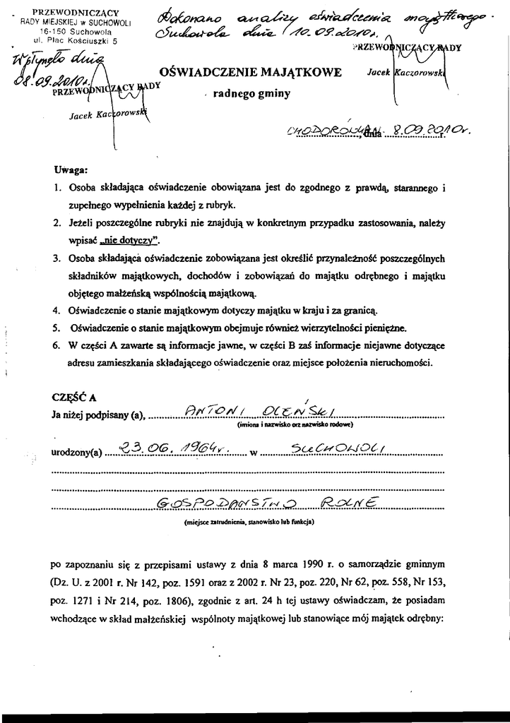 PRZEWODNICZACY RAP( MIEJSKIEJ w SUCHOWOLI 16-150 Suchowola Plac Kociuszki 5 Cel7fryg2 deafonam.0 csrcvtcy arrewitaig(-tez-rek oftzdaa-adz- oig.f.zz_ 1c_ e25 sce/c2,,e2,,, dal 0 n IRZEWO DY de4az OVVIADCZENIE MAJATKOWE 01. of okiat PRZEW DY Jacek jKaczorowsk radnego gminy (.-Ye0,0R-0,oe 14 , 9. 6-3, eqn or, Uwaga: 1. Osoba skladajkca otwiadczenie obowikzana jest do zgodnego z prawdq, starannego i zupeinego wypelnienia kaidej z rubryk. 2. Jeteli poszczegolne rubryki nie znajdujk w konlcretnym przypadku zastosowania, nalety wpisad ...nie dotvczy". 3. Osoba skladajkca otwiadczenie zobowigzana jest okretlit przynale±nott poszczegalnych skiadnik6w majqtkowych, dochodew i zobowiazati do majktku odrebnego i majkticu objetego malteftska wsp6Inoteia makttkowk. 4. Oiwiadezenie o stanie majktkowym dotyczy majktku w Icraju i za grottiest 5. Otwiadczenie o stank majktkowym obejmuje rownie2 wierzytelnoici pienigIne. 6. W ezetci A zawarte sit informacje jawne, w czetci B zag informacje niejawne dotyczace adresu zamieszkania skladajkcego o gwiadezenie oraz miejsce poloienia nieruchomotei. t CZkg A Ja nitej podpisany (a), 211670w OC ev / (imiona i nazwisko on nanvisko rodowe) urodzony(a) 3 . oc, ei go efv-. 6-Los po „2).e-ov s 564 Cite OARDC s2 (miejsce atrudnicnia, sthnowisko lub funkcja) po zapoznaniu sic z przepisami ustawy z dnia 8 marea 1990 r. o samorzgdzie gminnym (Dz. U. z 2001 r. Mr 142, poz. 1591 oraz z 2002 r. Mr 23, poz. 220, Nr 62, poz. 558, Nr 153, poz. 12711 Mr 214, poz. 1806), zgodnie z art. 24 h tej ustawy o§wiadcztun, le posiadam wchodzkce w sklad maltenskiej wspolnoty majktkowej lub stanowikce maj majktek odrgbny: 1. Zasoby pienigine: - g rodki pienietne zgromadzone w walucie polskiej• crt? t-c,c e cf:on - g rodki pienin ne zgromadzone w walucie obcej- papiery wartokiowe• Aex ct I- „--zz-ze na kwotg: II. -9-9 mo wrtogci: 2.9 ' e.7o0 L90 C C. 1. Dom o powierzchni: 1 AI -0Pt Sec uo... C tytui prawny: 4,66 2. Mieszkanie o powierzchni: , o wartoki: A tIC (-4'9° 4 c 4.c`e ce r tytui prawny: 3. Gospodarstwo mine: rodzaj gospodarstwa: Pr( 1-Y1"A/ / _Dte .e- ft A- , powierzchnia: .( 2 (Cla t co.C, L_O 7_,T o wartoki: 2c--JA/e rm24 ce .noc...... a- rodzaj zabudowy: tytui prawny- 4t 3Sitc) sC . r A -) .5P° ' e - -1 W c 2 .t c." :V- heti4a Z tegoulu osiignqiengglam) w roku utii eg/ym prz_y_ch6d icloch6d w wysokoki: loco (.:200 i1/4 g 1 aC e c.)-13 - Q ?--ce 7. bine nieruchomoki: CY powierzchnia: 4a. o wartoici: tytul prawny: .esce C Q .c.gy 1.Posiadamy udzialy w spelkach handlowych z udzialem gminnych os6b prawnych lub przedsigbiorc6w, w kt6rych uczestniczq takie osoby — nalety poda6 liczbg i emitenta C sce CZ7 udzialów udziaty te stanowiqpakiet wigkszy nit 10 % udzialew w spelce: CCSE- .K.ky Z tego tytulu osiqgnqiem (clam) w roku ubieglym doched w wysokogci: ittee cic, 42v, 2. Posiadam udzialy w innych spoikach handlowych — nalety poda6 liczbg Yudzia/6w: C Z tego tytuiu osiqgnft/em (clam) w roku ubieglym doch6d w wysoko gci: AMe croi (07 Iv. 1. Posiadam akcjg w spolkach handlowych z udzialem gminnych osOb prawnych lub przedsiebiorcew, w ktorych uczestniczq takie osoby — nalety podae liczbe i emitenta akcji: C et° akcje te stanowiq pakiet wiekszy nit 10% akcji w spoke . e Z tego tytulu osiqgnqlem(glam) w roku ubieglym doched w wysokaci: 44-c L-)-4. Posiadam alccje w innych spelkach handlowyck— nalety podae liczbe i emitenta akcji: 71.4..4. C.Zip se. Z tego tytutu osiqgnqiem(elam) w roku ubiegiym doch6d w wysokoici . .4t'Gtre V. Nabylem(am) (nabyl m6j maltonek, z wylqczeniem mienia przynaletnego do jego majqtku odrebnego) od Skarbu Paristwa, innej panstwowej osoby prawnej, jednostek samormdu terytorialnego, ich zwiqzkow lub od komunalnej osoby prawnej nastepujqce mienie, kt6re podlegalo zbyciu w drodze przetargu — nalety podae opis mienia i date nabycia, od kogo"vocz e c4o VI. 1.Prowadze dziaialno ge gospodarczq (nalety poda6 forme prawnq i przedmiot dzialalnoki). ,...44...c Ced.ce L:?:7 : d../..4.4.e.. cerua - osobigcie - wsp61nie z innymi osobami Z tego tytulu osiqgnqlem(glam) w roku ubieg/ym przychOd i doched w wysoko gci2. Zarmdzam dzialalnaciq gospodarczq lub jestem przedstawicielem pelnomocnikiem takiej dzialalnoki (nalety podae forme i przedmiot dzialalnogci):714tc - osobigcie - wsp6Inie z innymi osobami Z tego tytuht osiunglem(giam) w roku ubieglym doch6d w wysokogcik. st. azt VII. W spOlkach handlowych (nazwa, siedziba spelki)- Geo - jestem czionkiem zarzadu (od kiedy) . - jestem czionlciem rady nadzorczej (od kiedy)- - jestem czlonkiem komisji rewizyjnej (od kiedy)- ce1.9 Z tego tytulu osiagnalem(k1am) w roku ubieglym dochod w wysokoki . /14 VIM lime dochody osiagane z tytulu zatrudnienia lub innej dzialalno gci zarobkowej lub zajee, z podaniem kwot uzyskiwanych z kaidego tytulu. felt..2ec-EQ.0 IX. Skladniki mienia ruchowego o warto gci powytej 10 000 ziotych (w przypadku pojazdow mechanicznych nalety podae markt, model i rok produkcjj): . CISOX(t. 045C Ger- 20026'.-etoOiCip°1 6,,,t6nytk., melt ''c(1 - 1'f '?4 ercZErr 2o(2.€ 0. 2 ,1- 4 99to = 5 0000 17e-tc-(0-d2,RAciptitir 163/53 44 "1004' .7 2 c }0,90 e 2n6Pee/efin4-ecoa, -4 t c000r-;— 64-Diorw9-ce -ac.06,.., - 0-0 ?Ce2c-c. "I i -43 cocctO z 71atsft ROCG9 444 -1 - zco o 0 ?) Ra-.6:-dir *- ci-- • - 2.f.a221- . - 5.Q:c&9.ki4&4. p.a vc.9c)247 osoR ' 200;"-0 50 1‘.000eZ oP/2-rizei "on. - 2 cwi -457°,60 g 7‘0(-4- r' 9 1000 er 'ciao ?Act:3'0 4 z cr7- - 3 Al 2 >c ot z c e,4 t_, S9 ( 41(7 0004; “ Pe s f e -t - ecyainc, - Zobowiazania pienietne o wartoaci powytej 10 000 zlotych, w tym zaciagniete Icredyty i potyczki oraz warunki, na jakich zostaly udzielone, (wobec kogo, w zwiazku z jakim zdarzeniem, w jakiej Wysokoici). ic .e6-17 `17- 1,1 ta . - ',00%Q Si 0-.1t eck cC2g04 pw.y.q.z.k& ? - 46-e4S/e.: ./ 4J5 • et. ptca — f9oroco 0 AA/ er; c con/ , 44ç7 Loc) . ' &cc '?Werawne & ?eV. E Powytsze ogwiadczenie sktadam g wiadomy(a), it na podstawie art. 233 § I Kodcksu kamego za podanie nieprawdy lub zatajenie 