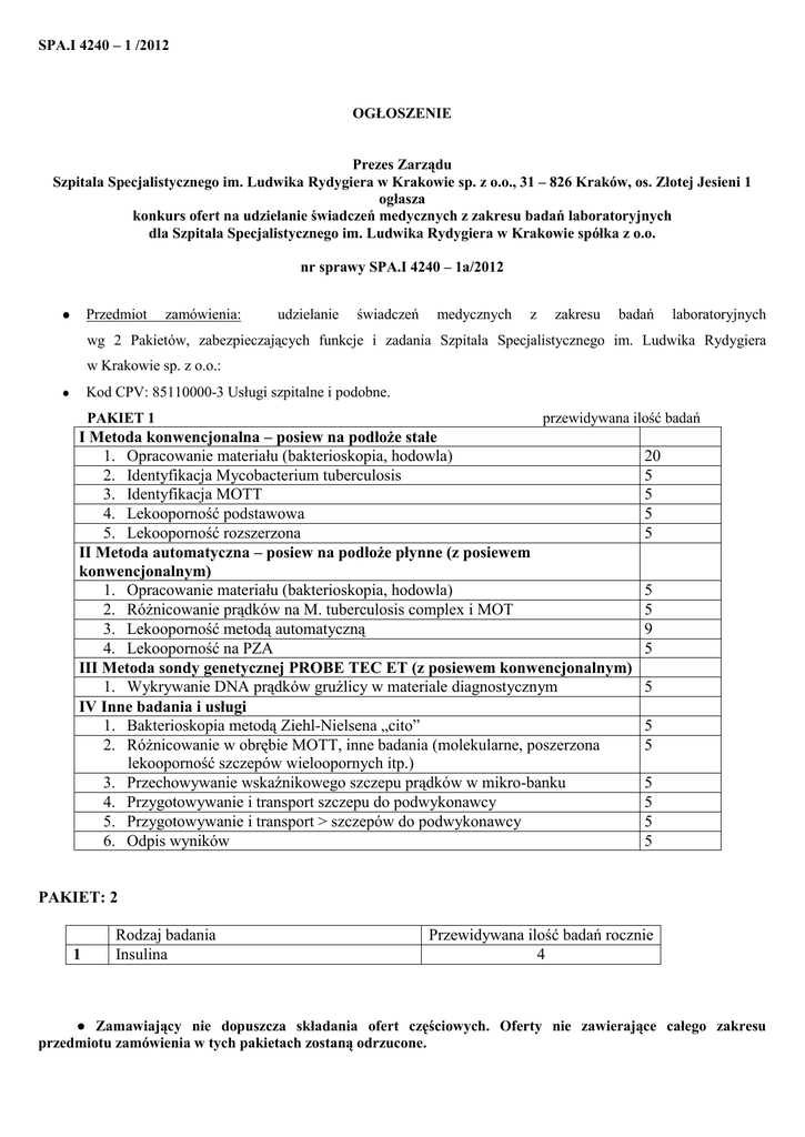 SPA.I 4240 – 1 /2012 OGŁOSZENIE Prezes Zarządu Szpitala Specjalistycznego im. Ludwika Rydygiera w Krakowie sp. z o.o., 31 – 826 Kraków, os. Złotej Jesieni 1 ogłasza konkurs ofert na udzielanie świadczeń medycznych z zakresu badań laboratoryjnych dla Szpitala Specjalistycznego im. Ludwika Rydygiera w Krakowie spółka z o.o. nr sprawy SPA.I 4240 – 1a/2012 Przedmiot zamówienia: udzielanie świadczeń medycznych z zakresu badań laboratoryjnych wg 2 Pakietów, zabezpieczających funkcje i zadania Szpitala Specjalistycznego im. Ludwika Rydygiera w Krakowie sp. z o.o.: Kod CPV: 85110000-3 Usługi szpitalne i podobne. PAKIET 1 przewidywana ilość badań I Metoda konwencjonalna – posiew na podłoże stałe 1. Opracowanie materiału (bakterioskopia, hodowla) 2. Identyfikacja Mycobacterium tuberculosis 3. Identyfikacja MOTT 4. Lekooporność podstawowa 5. Lekooporność rozszerzona II Metoda automatyczna – posiew na podłoże płynne (z posiewem konwencjonalnym) 1. Opracowanie materiału (bakterioskopia, hodowla) 2. Różnicowanie prądków na M. tuberculosis complex i MOT 3. Lekooporność metodą automatyczną 4. Lekooporność na PZA III Metoda sondy genetycznej PROBE TEC ET (z posiewem konwencjonalnym) 1. Wykrywanie DNA prądków gruźlicy w materiale diagnostycznym IV Inne badania i usługi 1. Bakterioskopia metodą Ziehl-Nielsena „cito” 2. Różnicowanie w obrębie MOTT, inne badania (molekularne, poszerzona lekooporność szczepów wieloopornych itp.) 3. Przechowywanie wskaźnikowego szczepu prądków w mikro-banku 4. Przygotowywanie i transport szczepu do podwykonawcy 5. Przygotowywanie i transport > szczepów do podwykonawcy 6. Odpis wyników 20 5 5 5 5 5 5 9 5 5 5 5 5 5 5 5 PAKIET: 2 1 Rodzaj badania Insulina Przewidywana ilość badań rocznie 4 ● Zamawiający nie dopuszcza składania ofert częściowych. Oferty nie zawierające całego zakresu przedmiotu zamówienia w tych pakietach zostaną odrzucone. Miejsce udzielania świadczeń: wykonywanie usług w siedzibie Oferenta. Kwalifikacje zawodowe osób udzielających świadczeń medycznych: wymagane są uprawnienia do wykonywania działalności lub czynności polegających na świadczeniu specjalistycznych usług medycznych zgodnie z obowiązującymi przepisami prawa. Warunki techniczne udzielania świadczeń: świadczenia będące przedmiotem konkursu udzielane będą w oparciu o sprzęt, wyroby medyczne oraz pomieszczenia będące własnością Oferenta. Szczegółowe warunki konkursu ofert oraz szczegółowe materiały informacyjne o przedmiocie zamówienia: dostępne będą w siedzibie Szpitala, os. Złotej Jesieni 1 w Krakowie, w Sekcji Marketingu i Sprzedaży, pokój 65 (I piętro), od poniedziałku do piątku w godzinach od 7:30 do 15:05 oraz na stronie internetowej Szpitala: www.rydygierkrakow.pl/marketing, najpóźniej w terminie do 15.02.2012r. Umowa zostanie zawarta na czas określony od dnia podpisania do dnia 31.12.2013. Rozpoczęcie udzielania świadczeń zdrowotnych: 01.03.2012 r. Miejsce i termin składania ofert: ofertę w zamkniętej i oznaczonej adnotacją kopercie: „Konkurs ofert na udzielanie świadczeń zdrowotnych z zakresu badań laboratoryjnych dla Szpitala Specjalistycznego im. Ludwika Rydygiera w Krakowie spółka z o.o.” – nr sprawy SPA.I 4240- 1a/2012 – należy składać na Dzienniku Podawczym Szpitala, w terminie do dnia 15.02.2012 r. do godziny 10:00. Otwarcie ofert: nastąpi w Sali nr 219, w dniu 15.02.2012 r. o godzinie 10:30 w siedzibie Szpitala Termin związania ofertą wynosi 60 dni od daty składania ofert. Konkurs zostanie rozstrzygnięty w terminie do 14 dni od daty, w której upływa termin składania ofert. Miejsce i termin ogłoszenia rozstrzygnięcia konkursu ofert: ogłoszenie o rozstrzygnięciu ofert zostanie umieszczone na tablicy ogłoszeń i stronie internetowej Szpitala. Umowa na udzielanie świadczeń zdrowotnych z zakresu badań laboratoryjnych dla Szpitala Specjalistycznego im. Ludwika Rydygiera w Krakowie spółka z o.o. zostanie zawarta z wybranym Oferentem w terminie do 21 dni od daty rozstrzygnięcia konkursu. Zastrzega się prawo odwołania konkursu oraz przedłużenia terminu składania ofert oraz terminu ogłoszenia rozstrzygnięcia konkursu ofert bez podania przyczyny. Protesty dotyczące konkursu ofert można składać na Dziennik Podawczy Szpitala, zgodnie z art. 153 ustawy z dnia 27 sierpnia 2004 r. o świadczeniach opieki zdrowotnej finansowanych ze środków publicznych (Dz.U. z 2008 r. Nr 164, poz. 1027 z późn. zm.) w związku z art. 26 ust. 4 Ustawy z dnia 15 kwietnia 2011 r. o działalności leczniczej (Dz.U. z 2011 r., nr 112, poz. 654). Oferty mogą składać: podmioty wykonujące działalność leczniczą spełniające wymagania określone w Zarządzeniach Prezesa NFZ oraz rozporządzeniach Ministra Zdrowia. Zapraszamy do składania ofert