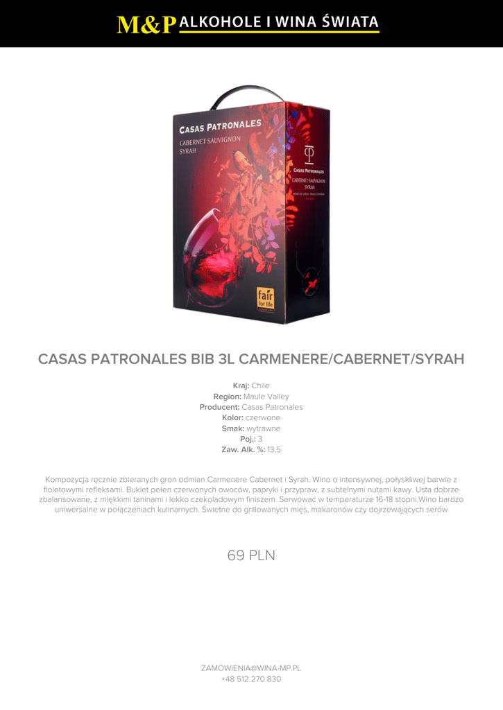 CASAS PATRONALES BIB 3L CARMENERE/CABERNET/SYRAH Kraj: Chile Region: Maule Valley Producent: Casas Patronales Kolor: czerwone Smak: wytrawne Poj.: 3 Zaw. Alk. %: 13,5 Kompozycja ręcznie zbieranych gron odmian Carmenere Cabernet i Syrah. Wino o intensywnej, połyskliwej barwie z fioletowymi refleksami. Bukiet pełen czerwonych owoców, papryki i przypraw, z subtelnymi nutami kawy. Usta dobrze zbalansowane, z miękkimi taninami i lekko czekoladowym finiszem. Serwować w temperaturze 16-18 stopni.Wino bardzo uniwersalne w połączeniach kulinarnych. Świetne do grillowanych mięs, makaronów czy dojrzewających serów 69 PLN [email protected] +48 512 270 830