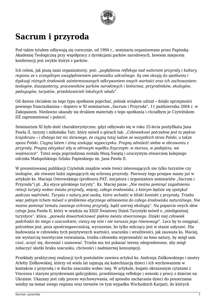 Sacrum i przyroda Pod takim tytułem odbywają się corocznie, od 1994 r., seminaria organizowane przez Papieską Akademię Teologiczną przy współpracy z dyrekcjami parków narodowych, bowiem miejscem konferencji jest zwykle któryś z parków. Ich celem, jak piszą sami organizatorzy, jest: „pogłębiona refleksja nad walorami przyrody i kultury regionu ze s zczególnym uwzględnieniem pierwiastka sakralnego. Są one okazją do spotkania i dyskusji różnych środowisk zainteresowanych odkrywaniem owych wartości oraz ich zachowaniem: teologów, duszpasterzy, pracowników parków narodowych i leśnictwa, przyrodników, ekologów, pedagogów, turystów, przedstawicieli lokalnych władz”. Od dawna chciałem na tego typu spotkanie pojechać, jednak wziąłem udział – dzięki uprzejmości pewnego franciszkanina – dopiero w XI seminarium „Sacrum i Przyroda”, 11 października 2004 r. w Zakopanem. Niedawno ukazały się drukiem materiały z tego spotkania i chciałbym je Czytelnikom DŻ zaprezentować i polecić. Seminarium XI było dość charakterystyczne, gdyż odbywało się w roku 25-lecia pontyfikatu Jana Pawła II, turysty i miłośnika Tatr, który mówił o górach tak: „Człowiekowi potrzebne jest to piękno krajobrazu – i dlatego też nic dziwnego, że ciągną tutaj ludzie ze wszystkich stron Polski, a także spoza Polski. Ciągną latem i zimą szukając wypoczynku. Pragną odnaleźć siebie w obcowaniu z przyrodą. Pragną odzyskać siły w zdrowym wysiłku fizycznym: w marszu, w podejściu, we wspinaczce”. Toteż sesja poprzedzona została Mszą Świętą i uroczystym otwarciem kolejnego odcinka Małopolskiego Szlaku Papieskiego im. Jana Pawła II. W prezentowanej publikacji Czytelnik znajdzie wiele treści interesujących nie tylko turystów czy teologów, ale również ludzi zajmujących się ochroną przyrody. Pierwszy tego przejaw mamy już w artykule ks. Macieja Ostrowskiego (profesora PAT, inicjatora i organizatora seminariów „Sacrum i Przyroda”) pt. „Ku etyce górskiego turysty”. Ks. Maciej pisze: „Nie można pominąć zagadnienia relacji turysty wobec świata przyrody, więcej, całego środowiska, z którym będzie się spotykał podczas wędrówki. Turysta z natury jest osobą, która wchodzi w bliski kontakt z przyrodą. Trzeba więc jednym tchem mówić o problemie etycznego odniesienia do całego środowiska naturalnego. Nie można pominąć tematu zwanego ochroną przyrody, bądź szerzej ekologią”. Na poparcie swych słów cytuje Jana Pawła II, który w orędziu na XXIII Światowy Dzień Turystyki mówił o „inteligentnej turystyce”, która: „pozwala dowartościować piękno świata stworzonego. Dzięki niej człowiek podchodzi do niego z szacunkiem, cieszy się nim i nie narusza jego równowagi”. Lecz by to osiągnąć, potrzebne jest, poza spostrzegawczością, wyciszenie, bo tylko milczący jest w stanie usłyszeć. Dla budowania w człowieku tych pozytywnych wartości, szacunku i wrażliwości, jak zauważa ks. Maciej, nie wystarczą teoretyczne rozważania, trzeba człowieka wyprowadzić na łono natury, by mógł sam czuć, uczyć się, doceniać i szanować. Trzeba mu też pokazać tereny zdegradowane, aby mógł zobaczyć skutki braku szacunku, chciwości i nadmiernej konsumpcji. Przekłady praktycznej realizacji tych postulatów zawiera artykuł ks. Andrzeja Ziółkowskiego i siostry Arletty Ziółkowskiej, którzy od wielu lat zajmują się katechizacją dzieci i ich wychowaniem w kontakcie z przyrodą i w duchu szacunku wobec niej. W artykule, bogato okraszonym cytatami z Vincenza i starymi przysłowiami galicyjskimi, przedstawiają refleksje i wnioski z pracy z dziećmi na Ukrainie. Ukazany jest cały proces wychowywania, od sposobu zachęcania dzieci do poszerzania wiedzy na temat swego regionu oraz terenów (w tym wypadku Wschodnich Karpat), do których Sacrum i przyroda 1 odbywają się wycieczki, rajdy i wędrówki. Autorzy dzielą się zarówno pozytywnymi, jak i negatywnymi wynikami swej pracy. Jednak, jak sami na koniec stwierdzają, „nie wiemy, czy Irina, Roma, Tania i inni młodzi, którzy zdobywali z nami szczyty Wschodnich Karpat podjęli dalej proces samowychowania nawet wbrew powszechnie panującym poglądom i niesprzyjającym okolicznościom /.../. Wiemy jednak, że piękno, jakie dostrzegli wraz z nami, pozwoli im dostrzec głębiej tajemnicę pięknego życia”. Na wędrówkę szlakiem tatrzańskich kapliczek zaprasza ks. Stanisław Czernik – proboszcz z Andrychowa, refleksję tę pogłębia o watki krajobrazowe i architektoniczne prof. Zbigniew Myczkowski. Nieco inny charakter od pozostałych ma referat Tomasza Pollera (autora książki pt.: „Bóg – człowiek – natura. Problematyka ekologiczna w nauczaniu Jana Pawła II”). Autor analizuje w swym wystąpieniu utwory Mickiewicza, starając się wychwycić wątki przyrodnicze powiązane z sacrum. Praca jest tym ciekawsza, że Poller omawia nie tylko znane utwory wieszcza, jak Sonety Krymskie, ale również te, o których przeciętny Polak nawet nie słyszał, bo gdzieś zaginęły i uchowały się tylko ich fragmenty – jak choćby Historia przyszłości, w której Mickiewicz pisze o „najwyższym szczycie cywilizacji materialnej i najniższym upadku uczucia ducha i wiary”. Niejako na kanwie tego warto zacytować znamienny fragment listu Mickiewicza do Otylli Goethe, ukazujący stosunek poety do cywilizacji materialnej: „Nie potrafię ukryć przed Panią rozczarowania, jakie doznałem zwiedzając brzegi Renu. Ta rzeka arcyrycerska i arcyromantyczna stała się po mieszczańsku gospodarna. Topór cywilizacji nie pozostawił na wzgórzach ani jednego lasu, ani jednego drzewa godnego tej nazwy. Wszędzie winnice i winnice bez końca. Pan Goethe skarżył się kiedyś na monotonię łanów sycylijskich. Wasze germańskie winnice nieruchome i jednakowe wydały mi się tysiąc razy nudniejsze. Gdzieniegdzie pośród owych pól widz