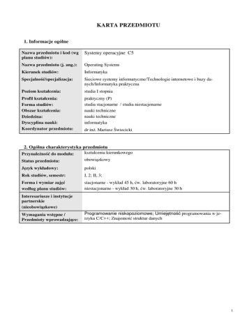 KARTA PRZEDMIOTU 1. Informacje ogólne Nazwa przedmiotu i kod (wg planu studiów): Systemy operacyjne C5 Nazwa przedmiotu (j. ang.): Operating Systems Kierunek studiów: Informatyka Specjalność/specjalizacja: Sieciowe systemy informatyczne/Technologie internetowe i bazy danych/Informatyka praktyczna Poziom kształcenia: studia I stopnia Profil kształcenia: Forma studiów: Obszar kształcenia: Dziedzina: Dyscyplina nauki: Koordynator przedmiotu: praktyczny (P) studia stacjonarne / studia niestacjonarne nauki techniczne nauki techniczne informatyka dr inż. Mariusz Świecicki 2. Ogólna charakterystyka przedmiotu Przynależność do modułu: kształcenia kierunkowego Status przedmiotu: obowiązkowy Język wykładowy: polski Rok studiów, semestr: I, 2; II, 3; Forma i wymiar zajęć według planu studiów: stacjonarne - wykład 45 h, ćw. laboratoryjne 60 h niestacjonarne - wykład 30 h, ćw. laboratoryjne 30 h Interesariusze i instytucje partnerskie (nieobowiązkowe) Wymagania wstępne / Przedmioty wprowadzające: Programowanie niskopoziomowe; Umiejętność programowania w jerzyku C/C++; Znajomość struktur danych 1 3. Bilans punktów ECTS 10 (A+B) A. Liczba godzin wymagających bezpośredniego udziału nauczyciela (kontaktowych, w czasie rzeczywistym, w tym testy, egzaminy etc) z podziałem na typy zajęć oraz całkowita liczba punktów ECTS osiąganych na tych zajęciach wykład laboratorium egzamin konsultacje 45 60 2 10 30 30 2 10 W sumie: ECTS przygotowanie do kolokwium przygotowanie do laboratorium przygotowanie sprawozdań praca w sieci praca na platformie e-learningowej przygotowanie do egzaminu przygotowanie do konsultacji uzupełnienie/studiowanie notatek studiowanie zalecanej literatury 117 5,5 10 5 5 5 10 10 2 4 5 72 3 10 5 5 10 10 10 2 5 10 w sumie: ECTS 56 4,5 67 7 laboratorium praca na platformie e-learningowej przygotowanie do kolokwium egzamin Suma 60 10 10 2 82 30 40 10 2 82 ECTS 3,5 3,5 B. Poszczególne typy zadań do samokształcenia studenta (niewymagających bezpośredniego udziału nauczyciela) wraz z planowaną średnią liczbą godzin na każde i sumaryczną liczbą ECTS (np. praca w bibliotece, w sieci, na platformie e-learningowej, w laboratorium, praca nad projektem końcowym, przygotowanie ogólne; suma poszczególnych godzin powinna zgadzać się z liczbą ogólną) C. Liczba godzin praktycznych/laboratoryjnych w ramach przedmiotu oraz związana z tym liczba punktów ECTS (ta liczba nie musi być powiązana z liczbą godzin kontaktowych, niektóre zajęcia praktyczne/laboratoryjne mogą odbywać się bez udziału nauczyciela): stacjonarne Niestacjonarne Całkowita liczba punktów ECTS (wg planu studiów; 1 punkt =25-30 godzin pracy studenta, w tym praca na zajęciach i poza zajęciami): 4. Opis przedmiotu Cel przedmiotu: 1. Zapoznanie studentów z budowa i struktura systemu operacyjnego oraz funkcjonalnością wszystkich jego modułów 2. Zaznajomienie studentów z zasadami działania systemów operacyjnych: Unix, Linux i Windows 3. Zaznajomienie studentów z wybranymi funkcjami systemowymi systemu linux i praktyczne ich wykorzystanie. 4. Implementacja problemów synchronizacji i komunikacji procesów z wykorzystaniem systemowych mechanizmów IPC 5. Umiejętność posługiwania się językiem powłoki, przy rozhisteryzowaniu elementarnych problemów z zakresu administrowania systemem komputerowym Metody dydaktyczne: np. podające (wykład), problemowe (konwersatorium, seminarium), aktywizujące (symulacja, metoda przypadków itp. ), eksponujace (pokaz, film), praktyczne (ćwiczenia, metoda projektów itp) – pełniejszy wykaz poniżej (prosimy wybrać najstosowniejsze - jedną lub więcej, można dodać 2 własne metody) wykład informacyjny, wykład problemowy, pokaz, ćwiczenia laboratoryjne Treści kształcenia (w rozbiciu na formę zajęć (jeśli są różne formy) i najlepiej w punktach): Wykłady: 1. Wprowadzenie. Rozwój i przeglad systemów operacyjnych. Zadania i właściwości systemu operacyjnego. 2. Struktury systemów operacyjnych. Jadro systemu, podstawowe udogodnienia sprzetowe (mechanizm przerwań, ochrona pamięci operacyjnej, zbiór rozkazów uprzywilejowanych, zegar czasu rzeczywistego) 3. Hierarchia pamięci. Organizacja pamięci pomocniczej. Podsystem plików 4. Organizacja systemu plików, katalogi plików, współużytkowanie i ochrona informacji, integralnosc systemu plików. Zarządzanie wolna przestrzenią na dysku. 5. System plików EXT3 (UNIX, LINUX) oraz system plików FAT, NTFS (WINDOWS NT). 6. Podstawowe wiadomości o procesach i watkach, zarządzanie procesami, stany procesu, atrybuty procesu. 7. Planowanie przydziału procesora - przegląd algorytmów przydziału procesora. 8. Zagadnienia związane z szeregowaniem zadań dobór właściwego algorytmu do specyfiki aplikacji. 9. Współbieżność procesów i synchronizacja. Gniazda, Semafory, operacje semaforowe (czekaj i sygnalizuj) 10. Rozwiązywanie klasycznych problemów synchronizacji (producent-konsument, piszacy-czytajacy, pieciu filozofów). 11. Komunikacja miedzy procesami (pliki, sygnały, łącza nienazwane, kolejki FIFO, semafory, kolejki komunikatów, pamięć dzielona). 12. Zakleszczenia graf przydziału zasobów, algorytm piekarniany. Metody obsługi zakleszczeń. 13. Zarządzanie pamięcią operacyjna. Strategie przydziału pamięci, segmentacja, stronicowanie, stronicowanie wielopoziomowe, segmentacja ze stronicowaniem 14. Pamięć wirtualna, stronicowanie na zadanie, sprawność stronicowania na zadanie. Algorytmy zastępowania stron. Przydział ramek. Szamotanie zapobieganie szamotaniu. 15. System wejscia/wyjscia. Interfejs programowy we/wy. Podsystem we/wy w jadrze. Wydajność systemu we/wy. 16. Bezpieczeństwo i ochrona Ćwiczenia laboratoryjne: 1. Omówienie tematyki zajęć, warunki zaliczenia. Polecenia systemu Linux 2. System plikowy - prawa dostępu, linki, przeszukiwanie systemu plików 3. Powłoka Bash - zmienne, aliasy, pliki konfiguracyjne,