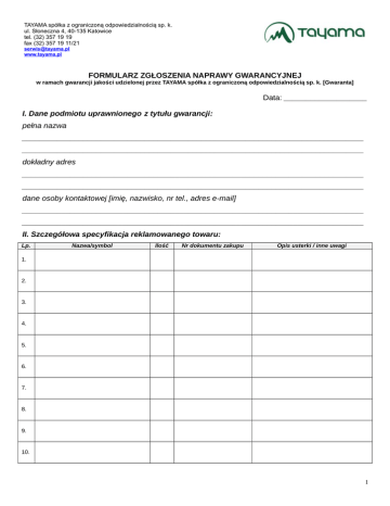 TAYAMA spółka z ograniczoną odpowiedzialnością sp. k. ul. Słoneczna 4, 40-135 Katowice tel. (32) 357 19 19 fax (32) 357 19 11/21 [email protected] www.tayama.pl FORMULARZ ZGŁOSZENIA NAPRAWY GWARANCYJNEJ w ramach gwarancji jakości udzielonej przez TAYAMA spółka z ograniczoną odpowiedzialnością sp. k. [Gwaranta] Data: ___________________ I. Dane podmiotu uprawnionego z tytułu gwarancji: pełna nazwa ______________________________________________________________________________ ______________________________________________________________________________ dokładny adres ______________________________________________________________________________ ______________________________________________________________________________ dane osoby kontaktowej [imię, nazwisko, nr tel., adres e-mail] ______________________________________________________________________________ ______________________________________________________________________________ II. Szczegółowa specyfikacja reklamowanego towaru: Lp. Nazwa/symbol Ilość Nr dokumentu zakupu Opis usterki / inne uwagi 1. 2. 3. 4. 5. 6. 7. 8. 9. 10. 1 III. Oświadczenie Nabywcy /uprawnionego z tytułu gwarancji/: Oświadczam, że akceptuję bez zastrzeżeń wszystkie warunki, określone w dokumencie gwarancyjnym, wystawionym przez TAYAMA spółka z ograniczoną odpowiedzialnością sp. k. w treści dowodu zakupu, a opublikowane, w szczegółowym zakresie w dokumencie na stronie internetowej pod adresem: http://www.tayama.pl/gwarancja ______________________________________________________________________________ data i podpis przedsiębiorcy lub osoby reprezentujące, zgodnie z rejestrem, podmiot uprawniony z tytułu gwarancji V. Zobowiązanie do sprawdzenia wysłanego towaru po dokonaniu naprawy: Niniejszym zobowiązuję się do sprawdzenia pod względem ilości towaru przesłanego za pośrednictwem kuriera/poczty zgłoszonego do naprawy w treści niniejszego formularza, w czasie nie dłuższym niż 3 dni po jego otrzymaniu. Po upływie ustalonego terminu zgłoszenia nieprawidłowości wszelkie reklamacje ilościowe nie będą uwzględniane. ______________________________________________________________________________ data, imię i nazwisko przedsiębiorcy lub osoby reprezentującej statutowo podmiot zgłaszający naprawę VI. Zobowiązanie do odbioru własnego towaru po dokonaniu naprawy /obowiązuje w przypadku uzgodnienia takiej formy odbioru z Klientem/: Niniejszym zobowiązuję się do odebrania towaru, zgłoszonego do naprawy w treści niniejszego formularza, we własnym zakresie, nie później niż 4 tygodnie po otrzymaniu zawiadomienia o jego naprawie. Równocześnie, dobrowolnie wyrażam zgodę na obciążenie mnie kosztami składowania w magazynie depozytowym Gwaranta, w wysokości netto 100,00 zł za każdy rozpoczęty dzień składowania, po upływie ustalonego terminu odbioru. ______________________________________________________________________________ data, imię i nazwisko przedsiębiorcy lub osoby reprezentującej statutowo podmiot zgłaszający naprawę 2