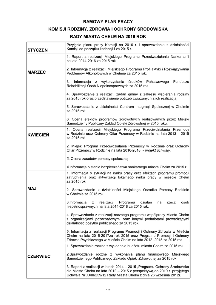 RAMOWY PLAN PRACY KOMISJI RODZINY, ZDROWIA I OCHRONY ŚRODOWISKA RADY MIASTA CHEŁM NA 2016 ROK STYCZEŃ Przyjęcie planu pracy Komisji na 2016 r. i sprawozdania z działalności Komisji od początku kadencji i za 2015 r. 1. Raport z realizacji Miejskiego Programu Przeciwdziałania Narkomanii na lata 2014-2016 za 2015 rok. MARZEC 2. Informacja z realizacji Miejskiego Programu Profilaktyki i Rozwiązywania Problemów Alkoholowych w Chełmie za 2015 rok. 3. Informacja z wykorzystania środków Państwowego Rehabilitacji Osób Niepełnosprawnych za 2015 rok. Funduszu 4. Sprawozdanie z realizacji zadań gminy z zakresu wspierania rodziny za 2015 rok oraz przedstawienie potrzeb związanych z ich realizacją. 5. Sprawozdanie z działalności Centrum Integracji Społecznej w Chełmie za 2015 rok. 6. Ocena efektów programów zdrowotnych realizowanych przez Miejski Samodzielny Publiczny Zakład Opieki Zdrowotnej w 2015 roku. KWIECIEŃ 1. Ocena realizacji Miejskiego Programu Przeciwdziałania Przemocy w Rodzinie oraz Ochrony Ofiar Przemocy w Rodzinie na lata 2013 – 2015 za 2015 rok. 2. Miejski Program Przeciwdziałania Przemocy w Rodzinie oraz Ochrony Ofiar Przemocy w Rodzinie na lata 2016-2018 - projekt uchwały. 3. Ocena zasobów pomocy społecznej. 4.Informacja o stanie bezpieczeństwa sanitarnego miasta Chełm za 2015 r. 1. Informacja o sytuacji na rynku pracy oraz efektach programu promocji zatrudnienia oraz aktywizacji lokalnego rynku pracy w mieście Chełm za 2015 rok. MAJ 2. Sprawozdanie z działalności Miejskiego Ośrodka Pomocy Rodzinie w Chełmie za 2015 rok. 3.Informacja z realizacji Programu działań niepełnosprawnych na lata 2014-2018 za 2015 rok. na rzecz osób 4. Sprawozdanie z realizacji rocznego programu współpracy Miasta Chełm z organizacjami pozarządowymi oraz innymi podmiotami prowadzącymi działalność pożytku publicznego za 2015 rok. 5. Informacja z realizacji Programu Promocji i Ochrony Zdrowia w Mieście Chełm na lata 2015-2017za rok 2015 oraz Programu Promocji i Ochrony Zdrowia Psychicznego w Mieście Chełm na lata 2012 -2015 za 2015 rok. 1. Sprawozdanie roczne z wykonania budżetu miasta Chełm za 2015 rok. CZERWIEC 2.Sprawozdanie roczne z wykonania planu finansowego Miejskiego Samodzielnego Publicznego Zakładu Opieki Zdrowotnej za 2015 rok. 3. Raport z realizacji w latach 2014 – 2015 „Programu Ochrony Środowiska dla Miasta Chełm na lata 2012 – 2015 z perspektywą do 2019 r. przyjętego Uchwałą Nr XXIII/259/12 Rady Miasta Chełm z dnia 26 września 2012r. 1/2 4. „Programu Ochrony Środowiska dla Miasta Chełm na lata 2016 – 2019 z perspektywą do 2023r. - projekt uchwały 5.Sprawozdanie z realizacji Programu i Rozwoju Pieczy Zastępczej za 2015 rok. Wspierania Rodziny 1. Informacja o przebiegu wykonania budżetu miasta Chełm za I półrocze 2016r. WRZESIEŃ LISTOPAD 2. Informacja o przebiegu wykonania planu finansowego Miejskiego Samodzielnego Publicznego Zakładu Opieki Zdrowotnej za I półrocze 2016r. 1. Ocena stanu zdrowia ludności zamieszkałej na terenie miasta Chełm za 2015 rok. 2. Program współpracy Miasta Chełm z organizacjami pozarządowymi oraz innymi podmiotami prowadzącymi działalność pożytku publicznego na 2017 rok – projekt uchwały. 1. Projekt budżetu miasta Chełm na 2017 rok. GRUDZIEŃ 2. Miejski Program Profilaktyki i Rozwiązywania Problemów Alkoholowych w Chełmie na 2017 rok - projekt uchwały. 3. Miejski Program Przeciwdziałania 2017-2019 – projekt uchwały. Narkomanii Przewodnicząca Komisji /-/Joanna LIS 2/2 na lata