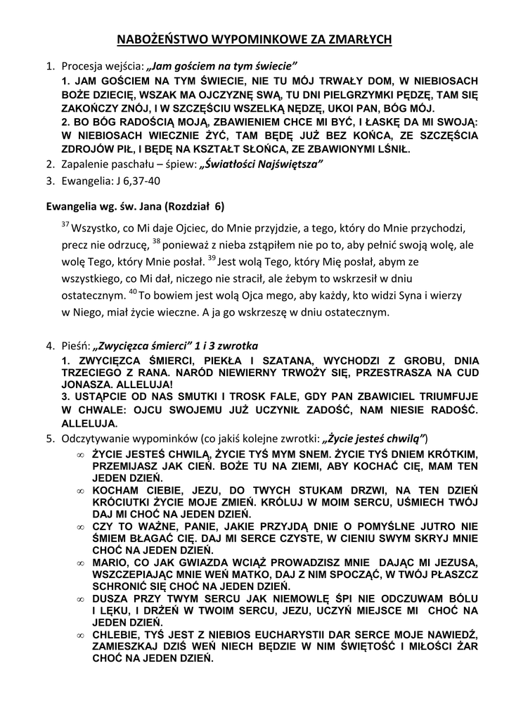NABOŻEŃSTWO WYPOMINKOWE ZA ZMARŁYCH 1. Procesja wejścia: „Jam gościem na tym świecie” 1. JAM GOŚCIEM NA TYM ŚWIECIE, NIE TU MÓJ TRWAŁY DOM, W NIEBIOSACH BOŻE DZIECIĘ, WSZAK MA OJCZYZNĘ SWĄ, TU DNI PIELGRZYMKI PĘDZĘ, TAM SIĘ ZAKOŃCZY ZNÓJ, I W SZCZĘŚCIU WSZELKĄ NĘDZĘ, UKOI PAN, BÓG MÓJ. 2. BO BÓG RADOŚCIĄ MOJĄ, ZBAWIENIEM CHCE MI BYĆ, I ŁASKĘ DA MI SWOJĄ: W NIEBIOSACH WIECZNIE ŻYĆ, TAM BĘDĘ JUŻ BEZ KOŃCA, ZE SZCZĘŚCIA ZDROJÓW PIŁ, I BĘDĘ NA KSZTAŁT SŁOŃCA, ZE ZBAWIONYMI LŚNIŁ. 2. Zapalenie paschału – śpiew: „Światłości Najświętsza” 3. Ewangelia: J 6,37-40 Ewangelia wg. św. Jana (Rozdział 6) 37 Wszystko, co Mi daje Ojciec, do Mnie przyjdzie, a tego, który do Mnie przychodzi, precz nie odrzucę, 38 ponieważ z nieba zstąpiłem nie po to, aby pełnić swoją wolę, ale wolę Tego, który Mnie posłał. 39 Jest wolą Tego, który Mię posłał, abym ze wszystkiego, co Mi dał, niczego nie stracił, ale żebym to wskrzesił w dniu ostatecznym. 40 To bowiem jest wolą Ojca mego, aby każdy, kto widzi Syna i wierzy w Niego, miał życie wieczne. A ja go wskrzeszę w dniu ostatecznym. 4. Pieśń: „Zwycięzca śmierci” 1 i 3 zwrotka 1. ZWYCIĘZCA ŚMIERCI, PIEKŁA I SZATANA, WYCHODZI Z GROBU, DNIA TRZECIEGO Z RANA. NARÓD NIEWIERNY TRWOŻY SIĘ, PRZESTRASZA NA CUD JONASZA. ALLELUJA! 3. USTĄPCIE OD NAS SMUTKI I TROSK FALE, GDY PAN ZBAWICIEL TRIUMFUJE W CHWALE: OJCU SWOJEMU JUŻ UCZYNIŁ ZADOŚĆ, NAM NIESIE RADOŚĆ. ALLELUJA. 5. Odczytywanie wypominków (co jakiś kolejne zwrotki: „Życie jesteś chwilą”) • • • • • • ŻYCIE JESTEŚ CHWILĄ, ŻYCIE TYŚ MYM SNEM. ŻYCIE TYŚ DNIEM KRÓTKIM, PRZEMIJASZ JAK CIEŃ. BOŻE TU NA ZIEMI, ABY KOCHAĆ CIĘ, MAM TEN JEDEN DZIEŃ. KOCHAM CIEBIE, JEZU, DO TWYCH STUKAM DRZWI, NA TEN DZIEŃ KRÓCIUTKI ŻYCIE MOJE ZMIEŃ. KRÓLUJ W MOIM SERCU, UŚMIECH TWÓJ DAJ MI CHOĆ NA JEDEN DZIEŃ. CZY TO WAŻNE, PANIE, JAKIE PRZYJDĄ DNIE O POMYŚLNE JUTRO NIE ŚMIEM BŁAGAĆ CIĘ. DAJ MI SERCE CZYSTE, W CIENIU SWYM SKRYJ MNIE CHOĆ NA JEDEN DZIEŃ. MARIO, CO JAK GWIAZDA WCIĄŻ PROWADZISZ MNIE DAJĄC MI JEZUSA, WSZCZEPIAJĄC MNIE WEŃ MATKO, DAJ Z NIM SPOCZĄĆ, W TWÓJ PŁASZCZ SCHRONIĆ SIĘ CHOĆ NA JEDEN DZIEŃ. DUSZA PRZY TWYM SERCU JAK NIEMOWLĘ ŚPI NIE ODCZUWAM BÓLU I LĘKU, I DRŻEŃ W TWOIM SERCU, JEZU, UCZYŃ MIEJSCE MI CHOĆ NA JEDEN DZIEŃ. CHLEBIE, TYŚ JEST Z NIEBIOS EUCHARYSTII DAR SERCE MOJE NAWIEDŹ, ZAMIESZKAJ DZIŚ WEŃ NIECH BĘDZIE W NIM ŚWIĘTOŚĆ I MIŁOŚCI ŻAR CHOĆ NA JEDEN DZIEŃ. • • CHCĘ CIĘ WIDZIEĆ, PANIE, BEZ ZASŁONY RAZ Z DALA NA WYGNANIU ŁKA DUSZA I SCHNIE ODKRYJ TERAZ, PROSZĘ, TWĄ PRZEMIŁĄ TWARZ CHOĆ NA JEDEN DZIEŃ. A KIEDY ODEJDĘ, GDZIE TWEJ CHWAŁY KRAJ GRAĆ CI POŚRÓD CHÓRÓW ANIELSKICH I PIEŃ W WIECZNYM BLASKU SŁOŃCA ROZPOCZĄĆ MI DAJ WIEKUISTY DZIEŃ. 6. Wspomnijmy teraz tych, którzy odeszli od nas od ostatniego Dnia Zadusznego, a których pożegnaliśmy w naszym kościele. Wysłuchajmy z uwagą ich imion i nazwisk (odczytanie z parafialnej księgi zmarłych – zapalenie świecy – a po każdym śpiew: „Wieczny odpoczynek” 1x) 7. Śpiew: „Królowi wieków” 8. Modlitwa: Wszechmogący, wieczny Boże, Ty rozciągasz swą władzę nad żywymi i umarłymi, Ty okazujesz miłosierdzie wszystkim, którzy dzięki swej wierze i dobrym uczynkom mają należeć do Ciebie. Najpokorniej Cię błagamy, aby ci, za których się modlimy – czy na tym świecie jeszcze żyją, czy też przeszli już do wieczności – za przyczyną Świętych Twoich dostąpili z Twej łaskawości odpuszczenia wszystkich swoich grzechów. Przez Chrystusa, Pana naszego. Amen. 9. Błogosławieństwo: Pan z wami. I z duchem twoim. Pochylcie głowy wasze przed Bogiem: Panie, wysłuchaj łaskawie prośby swojego ludu, który całą nadzieję pokłada w Twojej łasce, i prowadź go drogą zbawienia. Przez Chrystusa, Pana naszego. Amen. Niech was błogosławi… Idźcie w pokoju Chrystusa 10.Śpiew: „Dobry Jezu a nasz Panie”
