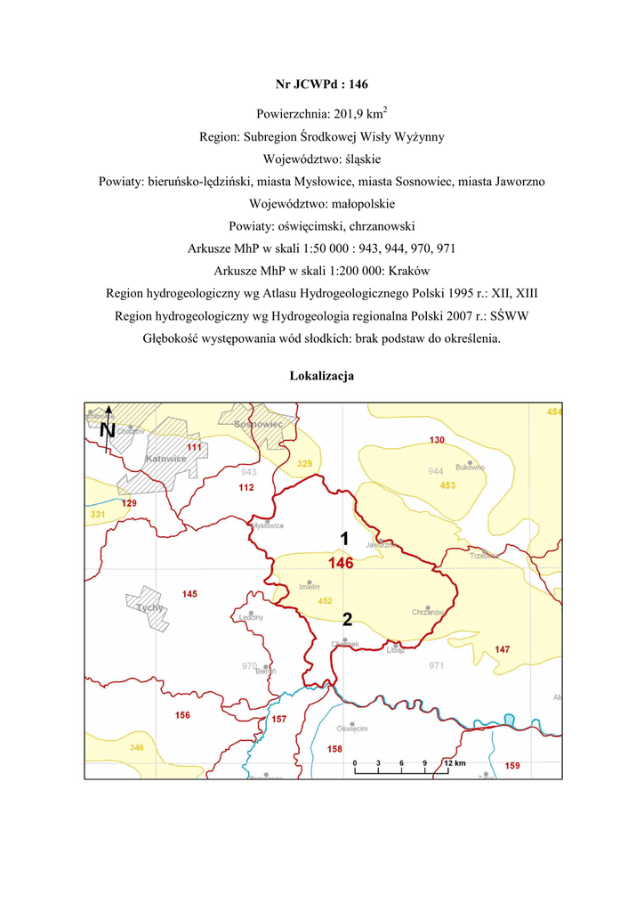 Nr JCWPd : 146 Powierzchnia: 201,9 km2 Region: Subregion Środkowej Wisły WyŜynny Województwo: śląskie Powiaty: bieruńsko-lędziński, miasta Mysłowice, miasta Sosnowiec, miasta Jaworzno Województwo: małopolskie Powiaty: oświęcimski, chrzanowski Arkusze MhP w skali 1:50 000 : 943, 944, 970, 971 Arkusze MhP w skali 1:200 000: Kraków Region hydrogeologiczny wg Atlasu Hydrogeologicznego Polski 1995 r.: XII, XIII Region hydrogeologiczny wg Hydrogeologia regionalna Polski 2007 r.: SŚWW Głębokość występowania wód słodkich: brak podstaw do określenia. Lokalizacja Profile Symbol całej JCWPd uwzględniający wszystkie profile: (Q), (T2,1,) C3 Opis symbolu jednostki: poziom wodonośny w czwartorzędzie występuje lokalnie. Poziom węglanowy triasu środkowego i dolnego występuje w wapieniu muszlowym i recie. Utwory triasu są podścielone przez poziom wodonośny karbonu górnego, prowadzący wody podziemne głównie w piaskowcach i Ŝwirowcach poszczególnych serii litostratygraficznych. Q - wody porowe w utworach piaszczystych i Ŝwirowych T 2,1 - wody szczelinowo-krasowe w utworach węglanowych C3 – wody szczelinowo-porowe w utworach piaskowcowych Cecha szczególna JCWPd – utwory triasu zalegają na powierzchni terenu; poziomy wodonośne, lokalnie odwodnione drenaŜem górniczym, w obszarach górniczych kopalń: węgla kamiennego, rud cynku i ołowiu i piasku. GZWP występujące w obrębie JCWPd : 452 - Zbiornik (T1,2) Chrzanów Schemat przepływu wód podziemnych