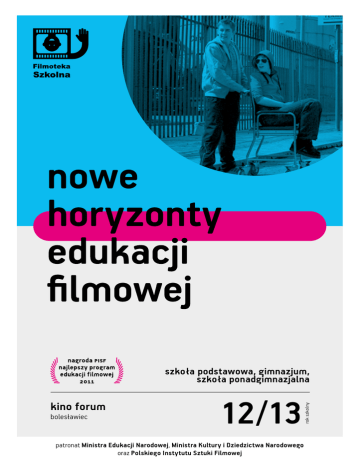 kino forum bolesławiec 12/13 rok szkolny szkoła podstawowa, gimnazjum, szkoła ponadgimnazjalna patronat Ministra Edukacji Narodowej, Ministra Kultury i Dziedzictwa Narodowego oraz Polskiego Instytutu Sztuki Filmowej popierają nas Andrzej Wajda Agnieszka Odorowicz Dyrektor Polskiego Instytutu Sztuki Filmowej Kiedy w 1955 roku odbierałem w Cannes Srebrną Palmę, dziennikarze zapytali mnie o ulubiony film. Odpowiedziałem, że podejrzewam, iż jest to Złoty wiek Luisa Buñuela. Mogłem jedynie podejrzewać – nie miałem możliwości zobaczenia go w Polsce. Zorganizowano wtedy prywatny seans – moje osobiste spotkanie z klasyką kina. Dziś młodzi widzowie mają zupełnie inne szanse. Nowe Horyzonty Edukacji Filmowej prezentują zarówno klasykę, jak i najciekawsze filmy współczesne. To propozycja nie tylko dla przyszłych reżyserów, lecz także dla tych wszystkich, którzy wierzą w magię kina. Projekt Nowe Horyzonty Edukacji Filmowej, realizowany z powodzeniem w wielu miastach w Polsce, świetnie spełnia misję edukacji młodej widowni. Projekcje kinowe filmów z całego świata, warsztaty filmowe dla uczniów i pedagogiczne dla nauczycieli stanowią doskonałe uzupełnienie Filmoteki Szkolnej. Program ten zainicjował Polski Instytut Sztuki Filmowej, od 2009 roku obejmuje on wszystkie szkoły ponadpodstawowe w kraju. Cieszę się, że udało się nawiązać współpracę i stworzyć program Filmoteka Szkolna – Nowe Horyzonty Edukacji Filmowej. Kino jest bowiem najlepszym miejscem odbioru sztuki filmowej. Zazdroszczę uczniom, że mają taką szansę na spotkania z mądrym filmem, a nauczycielom, że mogą kształtować wrażliwość i świadomość artystyczną swoich podopiecznych. Jerzy Stuhr Jan Jakub Kolski Nie ukrywajmy. Widownią kina dzisiaj w Polsce jest młodzież. To jest ich forum informacji o świecie, o kondycji człowieka, wyborach moralnych. Muszą przyjść na to spotkanie z filmem przygotowani. Muszą się dowiedzieć i przeżyć jak o tym świecie myśleli wielcy artyści kina. Muszą się nauczyć z ekranem dyskutować, a nie tylko przed nim wypoczywać. Dlatego tak bardzo wierzę w celowość programu Nowe Horyzonty Edukacji Filmowej i przyjąłem funkcję Ambasadora tego programu. Krzysztof Zanussi Przed każdym nowym filmem zapominam wszystko, co wiedziałem wcześniej. Ze strachu. Na plan wchodzę przerażony, ale... ufny. Wierzę w dobre serce filmu. I film – jak dobry nauczyciel – zwykle oddaje tę wiarę. W kilka dni uczy mnie wszystkiego od nowa. A potem ten refleks, odbity od ekranu, rozmnaża się na tysiące mniejszych nauk. Tak rozmawiamy ze sobą – film, ja i Ty. Echo tej rozmowy może być potężne i ponieść się daleko... Andrzej Maleszka Przez wiele lat szkoły uczymy się czytać teksty drukowane, po czym w życiu dojrzałym najczęściej korzystamy z przekazów audiowizualnych. Ich lektura wymaga osobnej edukacji. Nie można być dzisiaj analfabetą filmowym. 2 Film powinien być jak najlepszy prezent. Musi być wymarzoną i zarazem cudowną niespodzianką. Bardzo ważne jest, aby dzieci poznawały film w dobrej atmosferze. W miejscu, które lubią i z ludźmi, którym ufają. By mogły dzielić się radością i niepokojem. Fantastyczną cechą widowni dziecięcej jest to, że odbierają film jako zbiorowość. Chcą dzielić się emocjami. Stąd ważne są inicjatywy, które pozwalają dzieciom wspólnie i w przyjaznym miejscu oglądać dobre filmy. ekran na świat Projekt Filmoteka Szkolna. Nowe Horyzonty Edukacji Filmowej nieustannie się rozwija, by jak najlepiej odpowiadać na potrzeby uczniów i nauczycieli. W 2012 roku został laureatem Nagrody Polskiego Instytutu Sztuki Filmowej w kategorii „edukacja młodego widza”, która jest przyznawana przez niezależne grono specjalistów. Jest to dla nas nie tylko powód do radości, lecz przede wszystkim potwierdzenie, że nasze wysiłki są zasadne i mają sens, znajdują uznanie wśród osób niezwiązanych z naszym projektem. Tym goręcej zapraszamy Państwa do współpracy! Bieżąca edycja 2012/13 będzie realizowana w 32 miastach w Polsce. Oznacza to, że weźmie w niej udział około 3 tysięcy nauczycieli i 50 tysięcy uczniów. Pokazanych w jej ramach zostanie około 200 tytułów na ponad 2200 seansach. Patronatem objął ją Minister Kultury i Dziedzictwa Narodowego, Minister Edukacji Narodowej oraz Polski Instytut Sztuki Filmowej. Nauczyciele mogą wybierać cykle dopasowane do grupy wiekowej swoich uczniów. Każdy cykl obejmuje dziewięć comiesięcznych seansów odpowiednio wyselekcjonowanych tytułów. Przed projekcjam uczniowie wysłuchują prelekcji, a po filmie mogą wziąć udział w dyskusji albo warsztatach i konkursach plastycznych. Opiekunowie otrzymują dodatkowo materiały o filmie i scenariusze lekcji. Tematyka cykli jest bardzo różnorodna – część spotkań poświęcona jest zagadnieniom filmoznawczym i audiowizualnym, część – zagadnieniom kulturowym i społecznym. Projekt Filmoteka Szkolna. Nowe Horyzonty Edukacji Filmowej pozwala na realizację różnych elementów podstawy programowej. Wszystkie filmy wybrane do projektu i oglądane na dużym ekranie w niepowtarzalnej atmosferze kina niezmiennie od wielu lat stanowią swego rodzaju okno na to, co być może nieznane – inny świat, jego mieszkańców, ich zwyczaje, emocje i uczucia. Zapraszamy do wyjrzenia przez nie! Nowe Horyzonty Edukacji Filmowej to nie tylko regularne spotkania w kinie, lecz także warsztaty dla nauczycieli podczas Międzynarodowego Festiwalu Filmowego T-Mobile Nowe Horyzonty we Wrocławiu, sobotnie spotkania dla nauczycieli z cyklu Psychologia w kinie, przygotowany wspólnie z Narodowym Instytutem Audiowizualnym internetowy pakiet lekcji filmowych EKRAN 2.0 oraz zestaw scenariuszy Nowe media w Twojej szkole. Uczniowie natomiast mogą spróbować swoich sił jako twórcy, biorąc udział w projekcie Film na horyzoncie. W zeszłym roku w jego ramach powstało