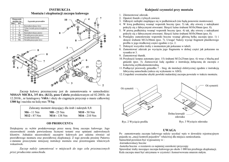Kolejność czynności przy montażu INSTRUKCJA Montażu i eksploatacji zaczepu kulowego Oznaczenie zacisku wg ISO PN 1 L 2 + 3 31 4 R 5 58R 6 54 7 58L 4 10 Łączenie przewodów Kierunkowskazy lewe Tylne światła przeciwmgłowe Masa Kierunkowskazy prawe Światła pozycyjne prawe Światła hamowania Światła pozycyjne lewe Zdemontować zderzak. Opuścić tłumik z tylnych zawiesi. Odkręcić zaślepki znajdujące się w podłużnicach (nie będą ponownie montowane). W lewą podłużnicę wsunąć wspornik boczny (poz. 5) tak, aby otwory z nakrętkami pokryły się z fabrycznymi otworami. Skręcić luźno śrubami M10x30mm (poz. 8). 5. W prawą podłużnicę wsunąć wspornik boczny (poz. 4) tak, aby otwory z nakrętkami pokryły się z fabrycznymi otworami. Skręcić luźno śrubami M10x30mm (poz. 8). 6. Pomiędzy zamontowane wsporniki boczne wsunąć główną belkę zaczepu (poz. 1) i skręcić śrubami M12x30mm (poz. 7). Uwaga! Należy wyciąć fragment plastikowego profilu w jego środkowej części zgodnie z rys. 2. 7. Dokręcić wszystkie śruby z momentem jak pokazano w tabeli. 8. Zamontować zderzak po wycięciu jego fragmentu w dolnej części jak pokazano na rysunku nr 3. 9. Zamontować tłumik. 10. Przykręcić korpus automatu (poz. 15) śrubami M12x25mm (poz. 6) wraz z blachą pod gniazdo (poz. 3). Zamocować kulę zgodnie z instrukcją dołączaną do zaczepu z końcówką szybkodemontowalną. 11. Podłączyć przewody gniazdka 7 – bieg. do instalacji elektrycznej zgodnie z instrukcją fabryczną samochodu (zaleca się wykonanie w ASO). 12. Uzupełnić ewentualne ubytki powłoki malarskiej zaczepu powstałe w trakcie montażu. 1. 2. 3. 4. 7 8 8 1 8 8 6 7 15 5 3 Oś symetrii 2 Oś symetrii Zaczep kulowy przeznaczony jest do zamontowania w samochodzie: NISSAN MICRA, 3/5 drz. (K12), poza Cabrio produkowanym od 02.2003r. do 12.2010r., nr katalogowy V60A i służy do ciągnięcia przyczep o masie całkowitej 1300 kg i nacisku na kulę max 75 kg. Zalecany moment skręcający dla śrub i nakrętek 8,8: M6 - 11 Nm M8 - 25 Nm M10 - 50 Nm M12 - 87 Nm M14 - 138 Nm M16 - 210 Nm OD PRODUCENTA Dziękujemy za wybór produkowanego przez naszą firmę zaczepu kulowego. Jego niezawodność została potwierdzona licznymi testami oraz opiniami zadowolonych klientów. Jednakże niezawodność zaczepów kulowych jest zależna również od prawidłowego montażu oraz prawidłowej eksploatacji. Z tego powodu prosimy Państwa o staranne przeczytanie niniejszej instrukcji montażu oraz przestrzeganie właściwych wskazówek. Zaczep należy zamontować w miejscach do tego celu przeznaczonych przez producenta samochodu. 75 80 80 Dolna krawędź zderzaka Rys. 3 Wycięcie zderzaka Rys. 2 Wycięcie profilu UWAGA Po zamontowaniu zaczepu kulowego należy uzyskać wpis w dowodzie rejestracyjnym pojazdu na „stacji kontroli pojazdów” właściwej dla miejsca zamieszkania. Samochód powinien być wyposażony w : -kierunkowskazy boczne -lusterka boczne o rozstawie co najmniej szerokości przyczepy Sprawdzać śruby mocujące zaczepu kulowego po około 1 000 km przebiegu eksploatacji. Kula zaczepu musi być utrzymana w czystości i konserwowana smarem stałym. PPUH AUTO-HAK Sp.J. Wyposażenie zaczepu: Produkcja Zaczepów Kulowych Henryk & Zbigniew Nejman 76-200 SŁUPSK ul. Słoneczna 16K tel/fax (059) 8-414-414; 8-414-413 E-mail: [email protected] www.autohak.com.pl Zaczep kulowy bez wyposażenia elektrycznego V60A Klasa: A50-X Nr kat. Przeznaczony do zamontowania w samochodzie: Producent: NISSAN Model: MICRA Typ: 3/5 drz. (K12), poza Cabrio produkowanym od 02.2003r. do 12.2010r. Dane techniczne: wartość siły D: 6,78 kN maksymalna masa przyczepy: 1300 kg maksymalny nacisk na kulę: 75 kg Numer homologacji zgodnie z Dyrektywą 94/20/WE: e20*94/20*1044*00 KARTA GWARANCYJNA Producent udziela gwarancji niniejszą kartą gwarancyjną na okres 24 miesięcy licząc od dnia zakupu zaczepu kulowego do samochodu: NISSAN MICRA 3/5 drz. (K12), poza Cabrio produkowanego od 02.2003r. do 12.2010r. Data produkcji .............................. Data zakupu............................................. Zakres gwarancji obejmuje wyłącznie wady jakościowe wynikające z winy producenta. Gwarancja nie obejmuje natomiast uszkodzeń zawinionych przez nabywcę, wynikających z niewłaściwego montażu, użytkowania lub konserwacji, uszkodzeń mechanicznych, normalnego zużycia podczas eksploatacji itp. Gwarancja udzielona na zakupiony towar nie wyłącza, nie ogranicza ani nie zawiesza uprawnień kupującego wynikających z niezgodności towaru z umową. Reklamacje należy zgłaszać w punkcie sprzedaży, składając jednocześnie kartę gwarancyjną. Usunięcie "wady" następuje po stwierdzeniu przez punkt sprzedaży wspólnie z producentem słuszności złożonej reklamacji. Reklamacja powinna być załatwiona w ciągu 14 dni od dnia uznania reklamacji. Karta gwarancyjna jest nieważna jeżeli nie jest wypełniona i podpisana. Data zgłoszenia reklamacji: ................................................................... INFORMACJA WSTĘPNA Zaczep kulowy jest skonstruowany zgodnie z zasadami bezpieczeństwa ruchu drogowego. Zaczep kulowy jest elementem wpływającym na bezpieczeństwo jazdy i może zostać zainstalowany wyłącznie przez personel wyspecjalizowany. Niedopuszczalne jest dokonywanie jakichkolwiek zmian w konstrukcji zaczepu. Powoduje to wygaśniecie dopuszczenia do stosowania. W przypadku obecności masy izolacyjnej lub osłony podwozia w miejscu przylegania zaczepu, należy ją usunąć. Nieosłonięte miejsca karoserii oraz wywiercone otwory należy pomalować farbą antykorozyjną. Informacjami wiążącymi odnośnie wartości obciążeń są dane podawane przez producenta samochodu, względnie wartości maksymalnej masy przyczepy oraz maksymalnego nacisku na kulę, przy czym wartości parametrów zaczepu kulowego nie mogą być przekroczone. Wzór do obliczania wartości siły D: Maks. masa przyczepy [k
