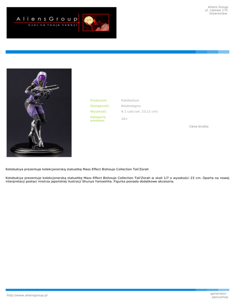 Aliens Group ul. Lipowa 17C Inowrocław Producent: Kotobukiya Dostępność: Niedostępny Wysokość: 9.1 cala (ok. 23,11 cm) Kategoria wiekowa: 16+ Cena brutto: Kotobukiya prezentuje kolekcjonerską statuetkę Mass Effect Bishoujo Collection Tali'Zorah Kotobukiya prezentuje kolekcjonerską statuetkę Mass Effect Bishoujo Collection Tali'Zorah w skali 1/7 o wysokości 23 cm. Oparta na nowej interpretacji postaci mistrza japońskiej ilustracji Shunya Yamashita. Figurka posiada dodatkowe akcesoria. http://www.aliensgroup.pl generator: aptusshop