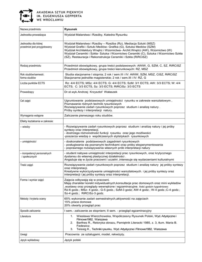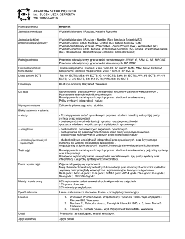 Nazwa przedmiotu Rysunek Jednostka prowadząca Wydział Malarstwa i Rzeźby, Katedra Rysunku Jednostka dla której przedmiot jest przygotowany Wydział Malarstwa i Rzeźby – Rzeźba (Rz), Mediacja Sztuki (MSZ) Wydział Grafiki i Sztuki Mediów- Grafika (G), Sztuka Mediów (SZM) Wydział Architektury Wnętrz i Wzornictwa- Archit.Wnętrz (AW), Wzornictwo (W) Wydział Ceramiki i Szkła- Sztuka i Wzornictwo Ceramiki (C), Sztuka i Wzornictwo Szkła (SZ), Restauracja i Rekonstrukcja Ceramiki i Szkła (RiRCiSZ) Rodzaj przedmiotu Przedmiot obowiązkowy, grupa treści podstawowych: AWiW, G, SZM, C, SZ, RiRCiSZ Przedmiot obowiązkowy, grupa treści kierunkowych: RZ, MSZ Rok studiów/semestr; forma studiów Studia stacjonarne I stopnia; 2 rok / sem.III i IV: AWiW, SZM, MSZ, CiSZ, RiRCiSZ Stacjonarne jednolite magisterskie; 2 rok / sem.III i IV: RZ, G Liczba punktów ECTS Rz: 4/4 ECTS; MSz: 4/4 ECTS; G: 4/4 ECTS; SzM: 3/1 ECTS; AW: 3/3 ECTS; W: 4/4 ECTS; C: 3/3 ECTS, Sz: 3/3 ECTS; RiRCiSz: 3/3 ECTS Prowadzący Dr.st.wyk.Andrzej Krzysztof Wałaszek Cel zajęć Ugruntowanie podstawowych umiejętności rysunku w zakresie warsztatowym , Poznawanie różnych technik rysunkowych Rozwiązywanie zadań rysunkowych poprzez studium i analizę natury . Próby syntezy i interpretacji natury. Wymagania wstępne Zaliczenie pierwszego roku studiów. Efekty kształcenia w zakresie: – wiedzy - Rozwiązywanie zadań rysunkowych poprzez studium i analizę natury i jej próby syntezy oraz interpretacji. - dostrzega różnorodność funkcji rysunku oraz jego możliwości -poszerza wiedzę o współczesnych stylistykach rysunkowych – umiejętności - doskonalenie podstawowych zagadnień rysunkowych - posługiwania się poznanymi technikami oraz próby eksperymentowania - poprawnego rozwiązywania własnych prób interpretacji natury – kompetencji personalnych i społecznych - student nabywa umiejętność interpretacji prac rysunkowych, oraz krytycznego dystansu do własnej plastycznej działalności . Angażuje się w życie pracowni i uczelni ,interesuje się wydarzeniami kulturalnymi Treść zajęć Rozwiązywanie zadań rysunkowych poprzez studium i analizę natury jej próby syntezy oraz interpretacji. Kreatywne wykorzystywanie umiejętności warsztatowych. i jej próby syntezy oraz interpretacji i jej próby syntezy oraz interpretacji. Forma i wymiar zajęć Zajęcia odbywają się w pracowni. Mają charakter korekt indywidualnych,konsultacje prac domowych oraz mini wykładów ,wystawy oraz przeglądy wewnętrzne i egzaminacyjne. Ilość godzin tygodniowo: Rz-6 godz.; MSz- 4 godz.; G-5 godz.; SzM-3 godz; AW-4 godz.; W-4 godz.;C-4 godz.; Sz-4 godz.; RiRCiSz-3 godz. Metody i kryteria oceny 65% wykonanie zadań semestralnych,aktywność na zajęciach 15% prace domowe 20% otwarty przegląd prac Sposób zaliczenia I sem.- zaliczenie ze stopniem; II sem. - przegląd egzaminacyjny Literatura 1. 2. 3. Wiesława Wierzchowska, Współczesny Rysunek Polski, Wyd. Artystyczne i Filmowe1982, Warszawa Barthes R., Retoryka obrazu, Pamiętnik Literacki 1985, z. 3, tłum. Maria B. Fedewicz. Teissig K., Techniki rysunku, Wyd. Artystyczne i Filmowe1982, Warszawa Uwagi Pracownia ze sztalugami, model, rekwizyty. Język wykładowy Język polski