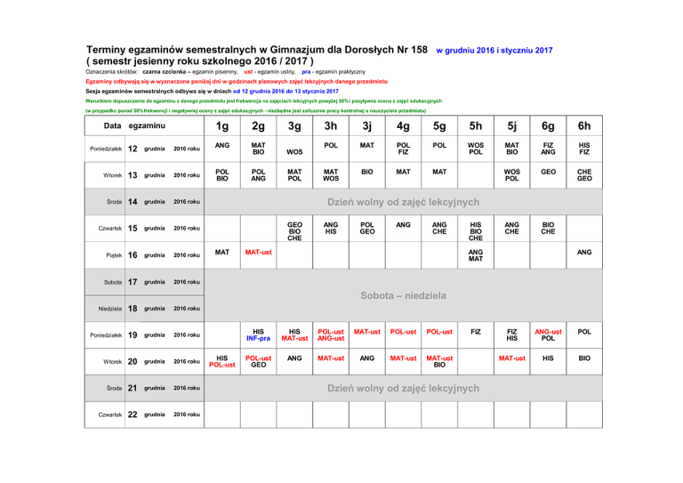 Terminy egzaminów semestralnych w Gimnazjum dla Dorosłych Nr 158 ( semestr jesienny roku szkolnego 2016 / 2017 ) Oznaczenia skrótów: czarna czcionka – egzamin pisemny, ust - egzamin ustny, w grudniu 2016 i styczniu 2017 pra - egzamin praktyczny Egzaminy odbywają się w wyznaczone poniżej dni w godzinach planowych zajęć lekcyjnych danego przedmiotu Sesja egzaminów semestralnych odbywa się w dniach od 12 grudnia 2016 do 13 stycznia 2017 Warunkiem dopuszczenia do egzaminu z danego przedmiotu jest frekwencja na zajęciach lekcyjnych powyżej 50% i pozytywna ocena z zajęć edukacyjnych (w przypadku ponad 50% frekwencji i negatywnej oceny z zajęć edukacyjnych - niezbędne jest zaliczenie pracy kontrolnej u nauczyciela przedmiotu) Data egzaminu Poniedziałek 12 grudnia 2016 roku Wtorek 13 grudnia 2016 roku Środa 14 grudnia 2016 roku Czwartek 15 grudnia 2016 roku Piątek 16 grudnia 2016 roku Sobota 17 grudnia 2016 roku 1g 2g ANG MAT BIO WOS POL ANG MAT POL POL BIO 3g 3h 3j 4g 5g 5h 5j 6g 6h POL MAT POL FIZ POL WOS POL MAT BIO FIZ ANG HIS FIZ MAT WOS BIO MAT MAT WOS POL GEO CHE GEO ANG CHE BIO CHE Dzień wolny od zajęć lekcyjnych GEO BIO CHE MAT ANG HIS POL GEO ANG ANG CHE MAT-ust HIS BIO CHE ANG MAT ANG Sobota – niedziela Niedziela 18 grudnia 2016 roku Poniedziałek 19 grudnia 2016 roku Wtorek 20 grudnia 2016 roku Środa 21 grudnia 2016 roku Czwartek 22 grudnia 2016 roku HIS POL-ust HIS INF-pra HIS MAT-ust POL-ust ANG-ust MAT-ust POL-ust POL-ust POL-ust GEO ANG MAT-ust ANG MAT-ust MAT-ust BIO FIZ Dzień wolny od zajęć lekcyjnych FIZ HIS ANG-ust POL POL MAT-ust HIS BIO Zimowa przerwa świąteczna od 23 do 31 grudnia 2016 roku Zimowa przerwa świąteczna Niedziela 1 stycznia 2017 roku Nowy Rok – dzień wolny od zajęć edukacyjnych Poniedziałek 2 stycznia 2017 roku Wtorek 3 stycznia 2017 roku Środa 4 stycznia 2017 roku Czwartek 5 stycznia 2016 roku Piątek 6 stycznia 2016 roku Sobota 7 stycznia 2016 roku INF-pra FIZ CHE MAT-ust ANG-ust GEO BIO HIS ANG-ust HIS FIZ ANG-ust POL-ust BIO HIS POL-ust MAT-ust POL-ust POL-ust ANG-ust MAT WOS MAT WOS MAT-ust MAT-ust ANG-ust Dzień wolny od zajęć lekcyjnych Święto Trzech Króli – dzień wolny od zajęć edukacyjnych Sobota – niedziela Niedziela 8 stycznia 2016 roku Poniedziałek 9 stycznia 2016 roku Wtorek 10 stycznia 2016 roku Środa 11 stycznia 2016 roku Czwartek 12 stycznia 2016 roku Piątek 13 stycznia 2016 roku Liczba egzaminów pis,ust i pra - sumy kontrolne → FIZ ANG-ust ANG-ust FIZ GEO CHE POL-ust FIZ FIZ WOS WOS WOS GEO GEO Dzień wolny od zajęć lekcyjnych CHE CHE CHE ANG-ust Egzamin Egzamin gimnazjalny gimnazjalny GEO POL-ust GEO ANG-ust 12 12 12 12 12 12 12 12 Egzamin Egzamin gimnazjalny gimnazjalny Egzamin Egzamin gimnazjalny gimnazjalny 12 12 12