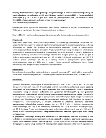 Dotyczy: Postepowania w trybie przetargu nieograniczonego o wartości szacunkowej niższej niż kwoty określone na podstawie art. 11 ust. 8 Ustawy z dnia 29 stycznia 2004 r. Prawo zamówień publicznych (t. j. Dz. U. z 2013 r., poz. 907 z późn. zm.), którego nazwą jest: „świadczenie w latach 2016-2017 usług pocztowych w obrocie krajowym i zagranicznym” Znak sprawy : FDP/2310/11/15 Przekazujemy treść pytań oraz odpowiedzi jakie zostały udzielone w związku z otrzymanymi od Wykonawcy zapytaniami dotyczącymi zamówienia ww. przetargu : Dnia 14.12.2015 r do Zamawiającego został przesłany mail w którym zadano następujące pytania : Pytanie nr 1 : Wykonawca zwraca się z wnioskiem o wyjaśnienie, czy Zamawiający przewiduje nadawanie tzw. „przesyłek terminowych”, tj. przesyłek rejestrowanych zawierających specjalistyczną korespondencję skierowaną do sądów (jak apelacja w postępowaniu cywilnym, skarga w postępowaniu administracyjnym bądź skarga na orzeczenie Krajowej Izby Odwoławczej) lub organów administracji publicznej (jak odwołania od decyzji w postępowaniu administracyjnym), z których nadaniem w placówce pocztowej operatora wyznaczonego odpowiednie przepisy prawa (np. art. 57 § 5 pkt. 2 Kodeksu postępowania administracyjnego, art. 12 § 6 pkt 2 Ordynacji podatkowej, art. 165 § 2 Kodeksu prawa cywilnego, art. 83 § 3 ustawy Prawo o postępowaniu przed sądami administracyjnymi oraz art. 198b ust. 2 ustawy Prawo zamówień publicznych) łączą skutek wniesienia pisma do sądu/urzędu przez stronę postępowania? Odpowiedź : Zamawiający nie przewiduje nadawania tzw. „ przesyłek terminowych” , jeżeli zajdzie potrzeba lub konieczność nadania takiej przesyłki Zamawiający skorzysta z kancelarii centralnej UJK w Kielcach. Pytanie nr 2 : Zgodnie z utrwalonym już poglądem orzecznictwa (vide: KIO 2601/14, KIO 2160/14, KIO 1362/13, Sąd Okręgowy w Gliwicach sygn. akt X Ga 287/13), jednym z warunków zachowania zasady uczciwej konkurencji w postępowaniu na usługi pocztowe jest uszczegółowienie zasad i warunków świadczenia usług w zakresie nadawania tzw. „przesyłek terminowych”, tj. ww. przesyłek rejestrowanych zawierających specjalistyczną korespondencję skierowaną do sądów (jak apelacja w postępowaniu cywilnym, skarga w postępowaniu administracyjnym bądź skarga na orzeczenie Krajowej Izby Odwoławczej) lub organów administracji publicznej (jak odwołania od decyzji w postępowaniu administracyjnym), z których nadaniem w placówce pocztowej operatora wyznaczonego odpowiednie przepisy prawa (np. art. 57 § 5 pkt. 2 Kodeksu postępowania administracyjnego, art. 12 § 6 pkt 2 Ordynacji podatkowej, art. 165 § 2 Kodeksu prawa cywilnego, art. 83 § 3 ustawy Prawo o postępowaniu przed sądami administracyjnymi oraz art. 198b ust. 2 ustawy Prawo zamówień publicznych) łączą skutek wniesienia pisma do sądu/urzędu przez stronę postępowania. W przypadku rzeczonego rozwiązania wykonawca – alternatywny operator pocztowy – jest podmiotem pośredniczącym w czynności nadania przesyłek w placówce operatora wyznaczonego, czyniąc to w imieniu i na rzecz Zamawiającego. Opisane wyżej rozwiązanie jest jedynym obecnie dostępnym na rynku usług pocztowych rozwiązaniem zapewniającym udział innych operatorów pocztowych w postępowaniu o udzielenie zamówienia publicznego, w których zamawiający wymaga, aby nadawane były przesyłki terminowe, powszechnie akceptowanym przez szeroki zakres instytucji państwowych, jak izby skarbowe, sądy, prokuratury, ministerstwa i jednostki samorządu terytorialnego. Co istotne – operator wyznaczony – nie jest w takim przypadku podwykonawcą operatora alternatywnego, a sama usługa pośrednictwa nie jest usługą pocztową, toteż Zamawiający nie może wymagać od wykonawcy posiadania/zawarcia umowy z operatorem wyznaczonym (tzw. umowy międzyoperatorskiej, na podstawie art. 35 ustawy Prawo pocztowe), a operator wyznaczony nie może odmówić przyjęcia przesyłek do nadania (zgodnie z treścią art. 48 ustawy Prawo Pocztowe). Jest zresztą rzeczą oczywistą, że uzależnienie możliwości świadczenia usług pocztowych przez operatora innego niż operator wyznaczony w zakresie nadawania tzw. przysyłek terminowych - od zawarcia z operatorem wyznaczonym pisemnej umowy o współpracy w rozumieniu Prawa pocztowego - wprost wyłączałoby konkurencję w postępowaniu o udzielenie zamówienia publicznego, bowiem zawarcie takiej umowy uzależnione jest tyko od woli operatora wyznaczonego, którego wszakże głównym i de facto jedynym konkurentem na rynku usług pocztowych jest właśnie Wykonawca (wskazać należy, że mimo to Wykonawca wielokrotnie podejmował bezskuteczne próby zawarcia tejże z Pocztą Polską S.A.). Powyższe potwierdza orzecznictwo Krajowej Izby Odwoławczej, gdyż jak przykładowo zauważyła Izba w wyroku z dnia 31 października 2014 roku sygn. KIO 2160/14: Po pierwsze […] Zamawiający w wyjaśnieniach treści siwz. […] dopuścił możliwość, aby wykonawca zamówienia odbierał przesyłki od Zamawiającego i przekazywał je do nadania w placówce operatora wyznaczonego. Po drugie – InPost skorzystał z tej możliwości i wskazał wprost w ofercie, ze w zakresie dotyczącym przesyłek wymagających zachowania terminu w dacie nadania, doręczanych w przypadkach przewidzianych w kpc, kpk, kpa i Ordynacji podatkowej, zamierza powierzyć wykonywanie zamówienia operatorowi wyznaczonemu. Po trzecie – ponieważ Poczta Polska jako operator wyznaczony ma obowiązek świadczenia powszechnych usług pocztowych, nie może odmówić przyjęcia takich przesyłek nadawanych fizycznie przez InPost w imieniu i na rzecz Zamawiającego. (…) Poczta Polska podnosiła, że rozwiązanie zaakceptowane przez Zamawiającego narusza art. 29 ust. 2 pzp, a zatem przepis odnoszący się do opisu przedmiotu zamówienia. Aktualnie zaś, pomimo dopuszczenia przez Zamawiają