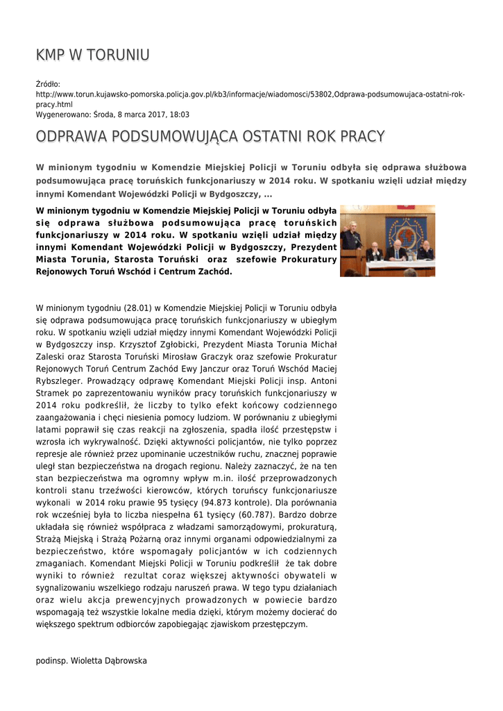 KMP W TORUNIU Źródło: http://www.torun.kujawsko-pomorska.policja.gov.pl/kb3/informacje/wiadomosci/53802,Odprawa-podsumowujaca-ostatni-rokpracy.html Wygenerowano: Środa, 8 marca 2017, 18:03 ODPRAWA PODSUMOWUJĄCA OSTATNI ROK PRACY W minionym tygodniu w Komendzie Miejskiej Policji w Toruniu odbyła się odprawa służbowa podsumowująca pracę toruńskich funkcjonariuszy w 2014 roku. W spotkaniu wzięli udział między innymi Komendant Wojewódzki Policji w Bydgoszczy, ... W minionym tygodniu w Komendzie Miejskiej Policji w Toruniu odbyła się odprawa służbowa podsumowująca pracę toruńskich funkcjonariuszy w 2014 roku. W spotkaniu wzięli udział między innymi Komendant Wojewódzki Policji w Bydgoszczy, Prezydent Miasta Torunia, Starosta Toruński oraz szefowie Prokuratury Rejonowych Toruń Wschód i Centrum Zachód. W minionym tygodniu (28.01) w Komendzie Miejskiej Policji w Toruniu odbyła się odprawa podsumowująca pracę toruńskich funkcjonariuszy w ubiegłym roku. W spotkaniu wzięli udział między innymi Komendant Wojewódzki Policji w Bydgoszczy insp. Krzysztof Zgłobicki, Prezydent Miasta Torunia Michał Zaleski oraz Starosta Toruński Mirosław Graczyk oraz szefowie Prokuratur Rejonowych Toruń Centrum Zachód Ewy Janczur oraz Toruń Wschód Maciej Rybszleger. Prowadzący odprawę Komendant Miejski Policji insp. Antoni Stramek po zaprezentowaniu wyników pracy toruńskich funkcjonariuszy w 2014 roku podkreślił, że liczby to tylko efekt końcowy codziennego zaangażowania i chęci niesienia pomocy ludziom. W porównaniu z ubiegłymi latami poprawił się czas reakcji na zgłoszenia, spadła ilość przestępstw i wzrosła ich wykrywalność. Dzięki aktywności policjantów, nie tylko poprzez represje ale również przez upominanie uczestników ruchu, znacznej poprawie uległ stan bezpieczeństwa na drogach regionu. Należy zaznaczyć, że na ten stan bezpieczeństwa ma ogromny wpływ m.in. ilość przeprowadzonych kontroli stanu trzeźwości kierowców, których toruńscy funkcjonariusze wykonali w 2014 roku prawie 95 tysięcy (94.873 kontrole). Dla porównania rok wcześniej była to liczba niespełna 61 tysięcy (60.787). Bardzo dobrze układała się również współpraca z władzami samorządowymi, prokuraturą, Strażą Miejską i Strażą Pożarną oraz innymi organami odpowiedzialnymi za bezpieczeństwo, które wspomagały policjantów w ich codziennych zmaganiach. Komendant Miejski Policji w Toruniu podkreślił że tak dobre wyniki to również rezultat coraz większej aktywności obywateli w sygnalizowaniu wszelkiego rodzaju naruszeń prawa. W tego typu działaniach oraz wielu akcja prewencyjnych prowadzonych w powiecie bardzo wspomagają też wszystkie lokalne media dzięki, którym możemy docierać do większego spektrum odbiorców zapobiegając zjawiskom przestępczym. podinsp. Wioletta Dąbrowska Autor: rzeczniktorun2 Publikacja: rzeczniktorun2 Ocena: 0/5 (0) Tweetnij