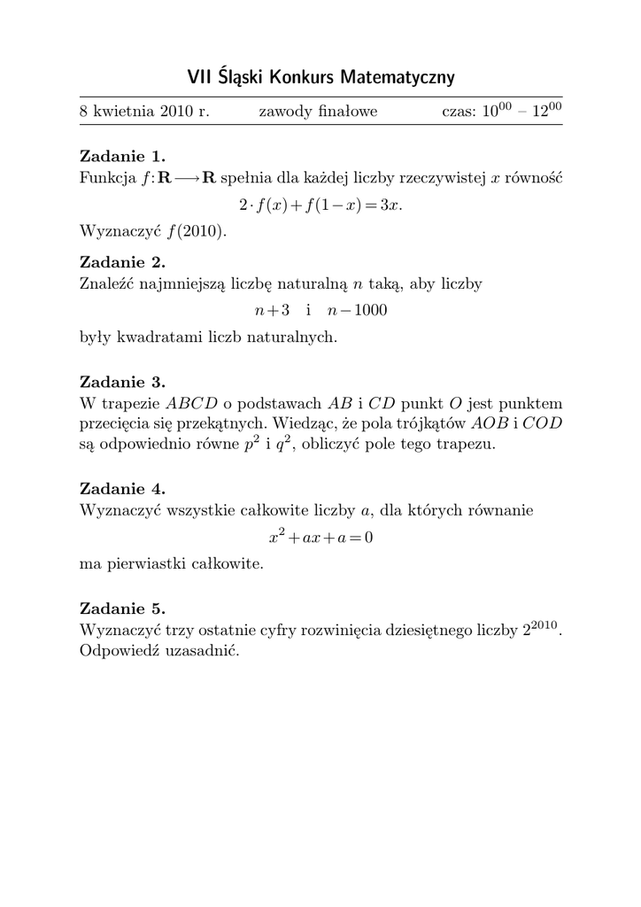 VII Śląski Konkurs Matematyczny 8 kwietnia 2010 r. zawody finałowe czas: 1000 – 1200 Zadanie 1. Funkcja f : R −→ R spełnia dla każdej liczby rzeczywistej x równość 2 · f (x) + f (1 − x) = 3x. Wyznaczyć f (2010). Zadanie 2. Znaleźć najmniejszą liczbę naturalną n taką, aby liczby n+3 i n − 1000 były kwadratami liczb naturalnych. Zadanie 3. W trapezie ABCD o podstawach AB i CD punkt O jest punktem przecięcia się przekątnych. Wiedząc, że pola trójkątów AOB i COD są odpowiednio równe p2 i q 2 , obliczyć pole tego trapezu. Zadanie 4. Wyznaczyć wszystkie całkowite liczby a, dla których równanie x2 + ax + a = 0 ma pierwiastki całkowite. Zadanie 5. Wyznaczyć trzy ostatnie cyfry rozwinięcia dziesiętnego liczby 22010 . Odpowiedź uzasadnić.