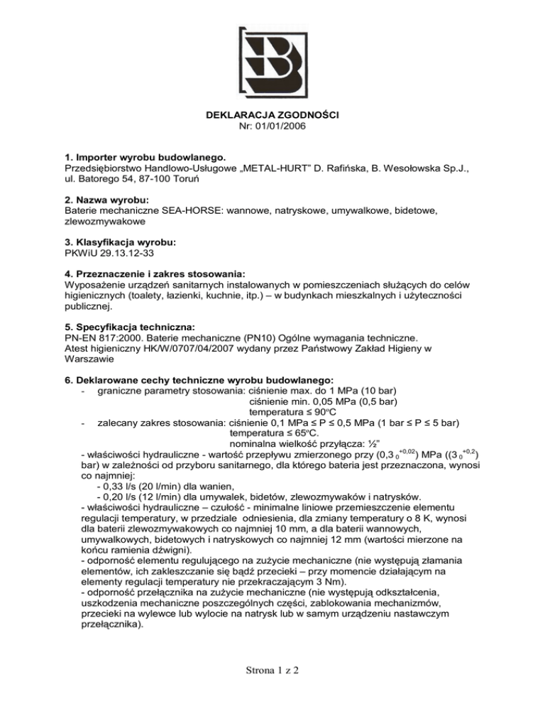 DEKLARACJA ZGODNOŚCI Nr: 01/01/2006 1. Importer wyrobu budowlanego. Przedsiębiorstwo Handlowo-Usługowe „METAL-HURT” D. Rafińska, B. Wesołowska Sp.J., ul. Batorego 54, 87-100 Toruń 2. Nazwa wyrobu: Baterie mechaniczne SEA-HORSE: wannowe, natryskowe, umywalkowe, bidetowe, zlewozmywakowe 3. Klasyfikacja wyrobu: PKWiU 29.13.12-33 4. Przeznaczenie i zakres stosowania: Wyposażenie urządzeń sanitarnych instalowanych w pomieszczeniach służących do celów higienicznych (toalety, łazienki, kuchnie, itp.) – w budynkach mieszkalnych i użyteczności publicznej. 5. Specyfikacja techniczna: PN-EN 817:2000. Baterie mechaniczne (PN10) Ogólne wymagania techniczne. Atest higieniczny HK/W/0707/04/2007 wydany przez Państwowy Zakład Higieny w Warszawie 6. Deklarowane cechy techniczne wyrobu budowlanego: - graniczne parametry stosowania: ciśnienie max. do 1 MPa (10 bar) ciśnienie min. 0,05 MPa (0,5 bar) temperatura ≤ 90ºC - zalecany zakres stosowania: ciśnienie 0,1 MPa ≤ P ≤ 0,5 MPa (1 bar ≤ P ≤ 5 bar) temperatura ≤ 65ºC. nominalna wielkość przyłącza: ½” - właściwości hydrauliczne - wartość przepływu zmierzonego przy (0,3 0+0,02) MPa ((3 0+0,2) bar) w zależności od przyboru sanitarnego, dla którego bateria jest przeznaczona, wynosi co najmniej: - 0,33 l/s (20 l/min) dla wanien, - 0,20 l/s (12 l/min) dla umywalek, bidetów, zlewozmywaków i natrysków. - właściwości hydrauliczne – czułość - minimalne liniowe przemieszczenie elementu regulacji temperatury, w przedziale odniesienia, dla zmiany temperatury o 8 K, wynosi dla baterii zlewozmywakowych co najmniej 10 mm, a dla baterii wannowych, umywalkowych, bidetowych i natryskowych co najmniej 12 mm (wartości mierzone na końcu ramienia dźwigni). - odporność elementu regulującego na zużycie mechaniczne (nie występują złamania elementów, ich zakleszczanie się bądź przecieki – przy momencie działającym na elementy regulacji temperatury nie przekraczającym 3 Nm). - odporność przełącznika na zużycie mechaniczne (nie występują odkształcenia, uszkodzenia mechaniczne poszczególnych części, zablokowania mechanizmów, przecieki na wylewce lub wylocie na natrysk lub w samym urządzeniu nastawczym przełącznika). Strona 1 z 2 - odporność ruchomej wylewki na zużycie mechaniczne (na wylewce lub na jej połączeniu z kadłubem nie występują odkształcenia, uszkodzenia mechaniczne lub przecieki w jakiejkolwiek jej części – przy obciążeniu masą 1 kg (0/-10g), gdy wysięg wylewki jest równy lub mniejszy 200 mm; - przy obciążeniu masą powodującą moment zgniatający (2 -0,20) Nm, gdy wysięg wylewki jest większy niż 200 mm). - odporność elementów regulacji na skręcanie (nie występują widoczne odkształcenia oraz pogorszenie funkcjonowania w odniesieniu do szczelności, przepływu lub czułości – przy obciążeniu regulatora przepływu momentem skręcającym (6±0,6) Nm utrzymanym w czasie 5 min; oraz przy obciążeniu regulatora temperatury momentem skręcającym (3-0,50) Nm utrzymanym w czasie 5 min. - właściwości akustyczne: grupa akustyczna II, klasa przepływu A. 7. Partia wyrobu objęta deklaracją: Wszystkie wyroby od od 01.01.2006. Deklaruję z pełna odpowiedzialnością, że wyrób budowlany jest zgodny ze specyfikacją techniczną wskazana w pkt 5. Toruń, 01.01.2006 r. ........................................... Imię i nazwisko osoby upoważnionej, podpis Strona 2 z 2
