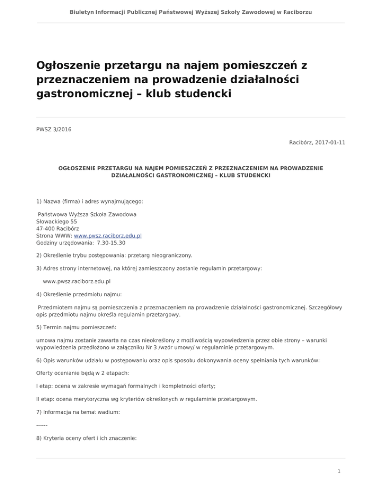 Biuletyn Informacji Publicznej Państwowej Wyższej Szkoły Zawodowej w Raciborzu Ogłoszenie przetargu na najem pomieszczeń z przeznaczeniem na prowadzenie działalności gastronomicznej – klub studencki PWSZ 3/2016 Racibórz, 2017-01-11 OGŁOSZENIE PRZETARGU NA NAJEM POMIESZCZEŃ Z PRZEZNACZENIEM NA PROWADZENIE DZIAŁALNOŚCI GASTRONOMICZNEJ – KLUB STUDENCKI 1) Nazwa (firma) i adres wynajmującego: Państwowa Wyższa Szkoła Zawodowa Słowackiego 55 47-400 Racibórz Strona WWW: www.pwsz.raciborz.edu.pl Godziny urzędowania: 7.30-15.30 2) Określenie trybu postępowania: przetarg nieograniczony. 3) Adres strony internetowej, na której zamieszczony zostanie regulamin przetargowy: www.pwsz.raciborz.edu.pl 4) Określenie przedmiotu najmu: Przedmiotem najmu są pomieszczenia z przeznaczeniem na prowadzenie działalności gastronomicznej. Szczegółowy opis przedmiotu najmu określa regulamin przetargowy. 5) Termin najmu pomieszczeń: umowa najmu zostanie zawarta na czas nieokreślony z możliwością wypowiedzenia przez obie strony – warunki wypowiedzenia przedłożono w załączniku Nr 3 /wzór umowy/ w regulaminie przetargowym. 6) Opis warunków udziału w postępowaniu oraz opis sposobu dokonywania oceny spełniania tych warunków: Oferty ocenianie będą w 2 etapach: I etap: ocena w zakresie wymagań formalnych i kompletności oferty; II etap: ocena merytoryczna wg kryteriów określonych w regulaminie przetargowym. 7) Informacja na temat wadium: -----8) Kryteria oceny ofert i ich znaczenie: 1 Biuletyn Informacji Publicznej Państwowej Wyższej Szkoły Zawodowej w Raciborzu Nazwa kryterium Waga Opłata czynszowa klubu studenckiego 100 pkt. 9) Miejsce i termin składania ofert: w siedzibie wynajmującego tj. Państwowa Wyższa Szkoła Zawodowa Słowackiego 55 47-400 Racibórz Sekretariat Kanclerza do dnia 01.02.2017 r., do godz. 10.00 11) Miejsce i termin otwarcia ofert: w siedzibie wynajmującego tj. Państwowa Wyższa Szkoła Zawodowa Słowackiego 55 47-400 Racibórz Pokój nr 140 dnia 01.02.2017 r., o godz. 10.30. 12) Termin związania ofertą: okres 30 dni , tj. do dnia 03.03.2017 r. 2 Biuletyn Informacji Publicznej Państwowej Wyższej Szkoły Zawodowej w Raciborzu 3