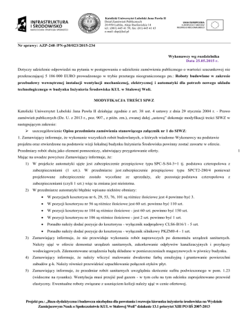 Katolicki Uniwersytet Lubelski Jana Pawła II Dział Zamówień Publicznych 20-950 Lublin, Aleje Racławickie 14 tel.: (081) 445 41 59, fax: (81) 445 41 63 e-mail: [email protected] Nr sprawy: AZP-240 /PN-p30/023/2015-234 Wykonawcy wg rozdzielnika Data 25.05.2015 r. Dotyczy udzielenie odpowiedzi na pytania w postępowaniu o udzielenie zamówienia publicznego o wartości szacunkowej nie przekraczającej 5 186 000 EURO prowadzonego w trybie przetargu nieograniczonego pn.: Roboty budowlane w zakresie przebudowy wewnętrznej instalacji wentylacji mechanicznej, elektrycznej i automatyki dla potrzeb nowego układu technologicznego w budynku Inżynieria Środowiska KUL w Stalowej Woli. MODYFIKACJA TREŚCI SIWZ Katolicki Uniwersytet Lubelski Jana Pawła II działając zgodnie z art. 38 ust. 4 ustawy z dnia 29 stycznia 2004 r. - Prawo zamówień publicznych (Dz. U. z 2013 r., poz. 907., z późn. zm.), zwanej dalej „ustawą” dokonuje modyfikacji treści SIWZ w następującym zakresie: uszczegółowienie Opisu przedmiotu zamówienia stanowiącego załącznik nr 1 do SIWZ: 1. Zamawiający informuje, że wykonanie wszystkich robót budowlanych, o których wiadomo Wykonawcy na podstawie projektu oraz stwierdzone na podstawie wizji lokalnej budynku Inżynieria Środowiska powinny zostać zawarte w ofercie. Przedmiary robót służą jako element pomocniczy, ułatwiający przygotowanie oferty. 11 Mając na uwadze powyższe Zamawiający informuje, że: 1) W projekcie automatyki ujęte jest zabezpieczenie przepięciowe typu SPC-S-S4-3+1 tj. podstawa czteropolowa z zabezpieczeniami (1 szt.). W przedmiarze jest zabezpieczenie przepięciowe typu SPCT2-280/4 ponieważ projektowane zabezpieczenie zostało wycofane ze sprzedaży, ale pozostaje podstawa czteropolowa z zabezpieczeniami (czyli 1 szt.) więc ta zmiana jest nieistotna. 2) W przedmiarze automatyki błędnie wpisano niektóre obmiary: W pozycjach kosztorysu nr 6, 29, 53, 76, 101 są różnice ilościowe jest 4 powinno być 3. W pozycji kosztorysu nr 56 są różnice ilościowe jest 60 szt. powinno być 110 szt. W pozycji kosztorysu nr 104 są różnice ilościowe - jest 60 szt. powinno być 150 szt. W pozycji kosztorysu nr 106 są różnice ilościowe - jest 2 szt. powinno być 1 szt. Ponadto należy dodać pozycje do kosztorysu - wyłącznik nadprądowy CLS6-B16/1 - 5 szt. Ponadto należy dodać pozycje do kosztorysu - wyłącznik silnikowy PKZM0-4 - 1 szt. 3) Zamawiający informuje, że nie przewiduje wykonania robót naprawczych po demontażu urządzeń sanitarnych. Należy ująć w ofercie demontaż urządzeń sanitarnych, zakorkowanie odpływów kanalizacyjnych i przyłączy wodociągowych. Zdemontowane urządzenia będą składane w pomieszczeniach magazynowych w piwnicy budynku. 4) Zamawiający informuje, że należy wliczyć malowanie dwukrotne farbą emulsyjną i gruntowanie powierzchni zabudów g-k. Należy również przewidzieć szpachlowanie połączeń styków płyt. 5) Zamawiający informuje, że przedmiar robót sanitarnych uwzględnia skrócenie sufitu podwieszonego w pom. 1.23 (widoczne na rysunku). Wentylacja musi przejść pod gazem - w tym celu na tym odcinku zaprojektowano przewód elastyczny. Ewentualne roboty związane z usunięciem kolizji należy ująć w cenie ofertowej. Projekt pn.: „Baza dydaktyczna i badawcza niezbędna dla powstania i rozwoju kierunku inżynieria środowiska na Wydziale Zamiejscowym Nauk o Społeczeństwie KUL w Stalowej Woli” działanie 13.1 priorytet XIII PO IiŚ 2007-2013 Katolicki Uniwersytet Lubelski Jana Pawła II Dział Zamówień Publicznych 20-950 Lublin, Aleje Racławickie 14 tel.: (081) 445 41 59, fax: (81) 445 41 63 e-mail: [email protected] 6) Zamawiający informuje, że w ofercie należy ująć wszystkie roboty konieczne do prawidłowej realizacji robót. Zamawiający nie przewiduje rozliczania robót dodatkowych. 7) Zamawiający informuje, że zabudowę neutralizatora w pom. -1.10 należy wykonać bez cokolika. Zamawiający wyraża zgodę na zmianę projektowanych w pom. neutralizatora drzwi stalowych na płycinowe. Oświetlenie pom. neutralizatora należy pozostawić bez zmian. 8) Zamawiający informuje, że w przypadku braku możliwości wyprowadzenia wentylacji bez przebudowy sufitu (np. w pom. -1.07) przebudowę taką należy ująć w ofercie. 9) Zamawiający informuje, że naprawę tynków i malowania należy przewidzieć jedynie w obrębie przejść przez ściany wykonywanych dla czerpni powietrza oraz w innych miejscach, gdzie powstaną uszkodzenia podczas prowadzenia robót budowlanych. Ściany w pomieszczeniach przewidzianych do naprawy malowane są dwukrotnie farbą emulsyjną. 10) Zamawiający przedstawia poprawiony schemat technologiczny szaf SA_12 i SA_22 (poprawiony rys. 5.3 projektu automatyki w załączeniu). 11) Zamawiający informuje, że projektant nie wyraża zgody na montaż falowników wentylatorów wyciągowych W1 – W3 systemu D2 w jednej wspólnej szafce. W ofercie należy ująć odrębne szafki dla każdego falownika. 12) Zamawiający informuje, że projektant nie wyraża zgody na montaż falowników wentylatorów wyciągowych W1 – W2 systemu D1 w jednej wspólnej szafce. W ofercie należy ująć odrębne szafki dla każdego falownika. 13) Zamawiający informuje, że dokumentację powykonawczą należy wykonać w dwóch egzemplarzach w wersji papierowej oraz w jednym egzemplarzu w wersji elektronicznej. Wersja elektroniczna ma być wykonana w plikach dwg i pdf. Pliki projektowe w formacie dwg Zamawiający przekaże Wykonawcy po podpisaniu umowy. 14) Ponadto Zamawiający informuje, że Wykonawcy mieli możliwość obejrzenia terenu robót w celu prawidłowego przygotowania ofert. W związku z ryczałtowym charakterem rozliczeń Wykonawca powinien w ofercie ująć wszystkie roboty konieczne do wykonania, nawet gdy nie są ujęte w przedmiarach. Rozdział XII pkt 1: Jest: Rozdział XII pkt 1. Oferty należy składać w siedzibie Zamawiającego: Katolicki U