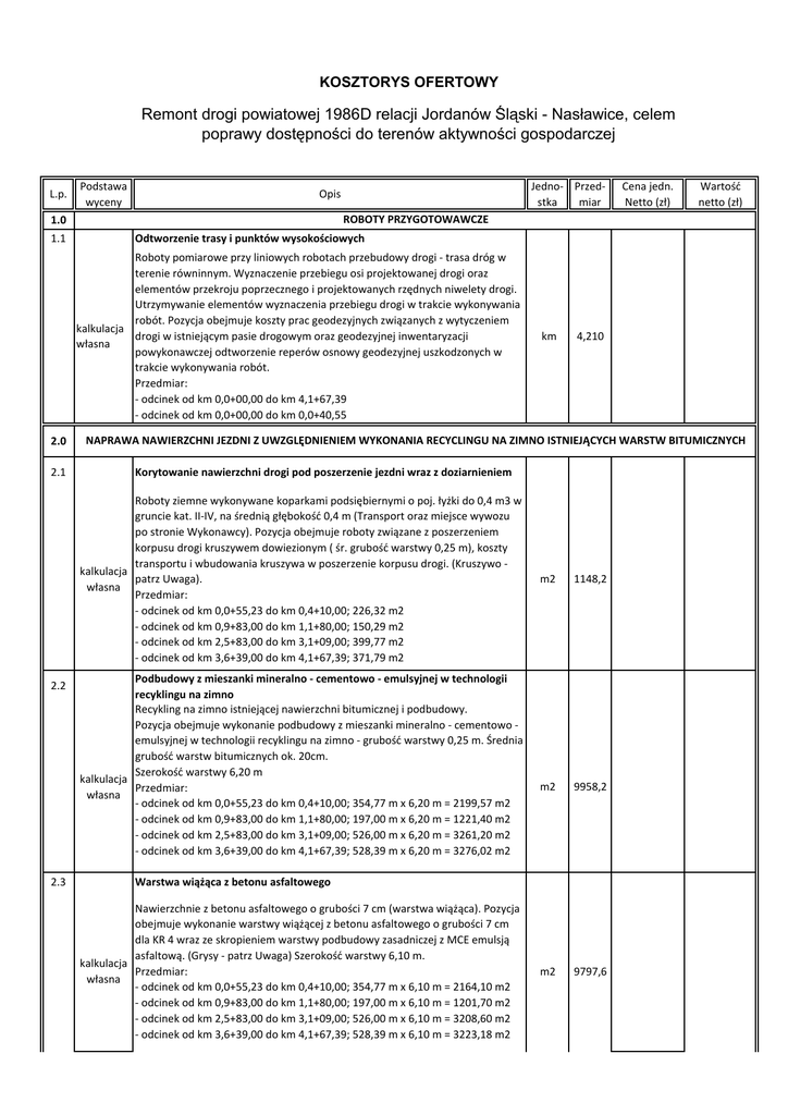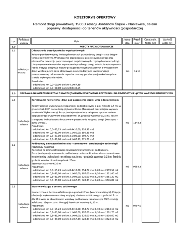 KOSZTORYS OFERTOWY Remont drogi powiatowej 1986D relacji Jordanów Śląski - Nasławice, celem poprawy dostępności do terenów aktywności gospodarczej L.p. Podstawa wyceny 2.1 2.3 km 4,210 NAPRAWA NAWIERZCHNI JEZDNI Z UWZGLĘDNIENIEM WYKONANIA RECYCLINGU NA ZIMNO ISTNIEJĄCYCH WARSTW BITUMICZNYCH Korytowanie nawierzchni drogi pod poszerzenie jezdni wraz z doziarnieniem Roboty ziemne wykonywane koparkami podsiębiernymi o poj. łyżki do 0,4 m3 w gruncie kat. II-IV, na średnią głębokość 0,4 m (Transport oraz miejsce wywozu po stronie Wykonawcy). Pozycja obejmuje roboty związane z poszerzeniem korpusu drogi kruszywem dowiezionym ( śr. grubość warstwy 0,25 m), koszty transportu i wbudowania kruszywa w poszerzenie korpusu drogi. (Kruszywo kalkulacja patrz Uwaga). własna Przedmiar: - odcinek od km 0,0+55,23 do km 0,4+10,00; 226,32 m2 - odcinek od km 0,9+83,00 do km 1,1+80,00; 150,29 m2 - odcinek od km 2,5+83,00 do km 3,1+09,00; 399,77 m2 - odcinek od km 3,6+39,00 do km 4,1+67,39; 371,79 m2 2.2 Wartość netto (zł) Odtworzenie trasy i punktów wysokościowych Roboty pomiarowe przy liniowych robotach przebudowy drogi - trasa dróg w terenie równinnym. Wyznaczenie przebiegu osi projektowanej drogi oraz elementów przekroju poprzecznego i projektowanych rzędnych niwelety drogi. Utrzymywanie elementów wyznaczenia przebiegu drogi w trakcie wykonywania robót. Pozycja obejmuje koszty prac geodezyjnych związanych z wytyczeniem kalkulacja drogi w istniejącym pasie drogowym oraz geodezyjnej inwentaryzacji własna powykonawczej odtworzenie reperów osnowy geodezyjnej uszkodzonych w trakcie wykonywania robót. Przedmiar: - odcinek od km 0,0+00,00 do km 4,1+67,39 - odcinek od km 0,0+00,00 do km 0,0+40,55 2.0 Cena jedn. Netto (zł) ROBOTY PRZYGOTOWAWCZE 1.0 1.1 Jedno- Przedstka miar Opis Podbudowy z mieszanki mineralno - cementowo - emulsyjnej w technologii recyklingu na zimno Recykling na zimno istniejącej nawierzchni bitumicznej i podbudowy. Pozycja obejmuje wykonanie podbudowy z mieszanki mineralno - cementowo emulsyjnej w technologii recyklingu na zimno - grubość warstwy 0,25 m. Średnia grubość warstw bitumicznych ok. 20cm. Szerokość warstwy 6,20 m kalkulacja Przedmiar: własna - odcinek od km 0,0+55,23 do km 0,4+10,00; 354,77 m x 6,20 m = 2199,57 m2 - odcinek od km 0,9+83,00 do km 1,1+80,00; 197,00 m x 6,20 m = 1221,40 m2 - odcinek od km 2,5+83,00 do km 3,1+09,00; 526,00 m x 6,20 m = 3261,20 m2 - odcinek od km 3,6+39,00 do km 4,1+67,39; 528,39 m x 6,20 m = 3276,02 m2 m2 1148,2 m2 9958,2 m2 9797,6 Warstwa wiążąca z betonu asfaltowego Nawierzchnie z betonu asfaltowego o grubości 7 cm (warstwa wiążąca). Pozycja obejmuje wykonanie warstwy wiążącej z betonu asfaltowego o grubości 7 cm dla KR 4 wraz ze skropieniem warstwy podbudowy zasadniczej z MCE emulsją asfaltową. (Grysy - patrz Uwaga) Szerokość warstwy 6,10 m. kalkulacja Przedmiar: własna - odcinek od km 0,0+55,23 do km 0,4+10,00; 354,77 m x 6,10 m = 2164,10 m2 - odcinek od km 0,9+83,00 do km 1,1+80,00; 197,00 m x 6,10 m = 1201,70 m2 - odcinek od km 2,5+83,00 do km 3,1+09,00; 526,00 m x 6,10 m = 3208,60 m2 - odcinek od km 3,6+39,00 do km 4,1+67,39; 528,39 m x 6,10 m = 3223,18 m2 2.4 Warstwa ścieralna z mieszanki mineralno - asfaltowej 0/11,2 mm Nawierzchnie z mieszanek mineralno - asfaltowych 0/11,2 o grubości 5 cm (warstwa ścieralna). Pozycja obejmuje wykonanie warstwy ścieralnej z mieszanki mineralno - asfaltowej o grubości 5 cm dla KR 4 wraz z oczyszczeniem i skropieniem warstwy wiążącej emulsją asfaltową. Szerokość warstwy 6,00 m. Przedmiar: - odcinek od km 0,0+55,23 do km 0,4+10,00; 354,77 m x 6,00 m = 2128,62 m2 - odcinek od km 0,9+83,00 do km 1,1+80,00; 197,00 m x 6,00 m = 1182,00 m2 - odcinek od km 2,5+83,00 do km 3,1+09,00; 526,00 m x 6,00 m = 3156,00 m2 - odcinek od km 3,6+39,00 do km 4,1+67,39; 528,39 m x 6,00 m = 3170,34 m2 3.0 3.1 Korytowanie nawierzchni drogi 16310 m2 16310 m2 16310 m2 15808 Podbudowa z kruszywa łamanego stabilizowanego mechanicznie Warstwa podbudowy z kruszyw łamanych. Pozycja obejmuje wykonanie warstwy podbudowy zasadniczej z mieszanki kruszywa łamanego zagęszczonego mechanicznie o gr. 40 cm (po zagęszczeniu) - wykonanie w dwóch warstwach o gr 20 cm.Pozycja obejmuje koszty przywiezienia (miejsce odbioru i wbudowania materiałów na podbudowę wraz z ich zagęszczeniem. (Kruszywa - patrz Uwaga) kalkulacja Szerokość warstwy 6,40 m. własna Przedmiar: - odcinek od km 0,4+10,00 do km 0,9+83,00; 573,00 m x 6,40 m = 3667,20 m2 - odcinek od km 1,1+80,00 do km 2,5+83,00; 1403,00 m x 6,40 m = 8979,20 m2 - odcinek od km 3,1+09,00 do km 3,6+39,00; 530 m x 6,40 m = 3392,00 m2 - odcinek od km 0,0+00,00 do km 0,0+35,20; 271,23 m2 3.4 m2 Stabilizacja gruntu cementem Warstwa gruntu stabilizowanego cementem o Rm = 2,5 MPa, wg PN-S-96012. Pozycja obejmuje wykonanie warstwy gruntu stabilizowanego cementem o Rm = 2,5 MPa grubości 15 cm (po zagęszczeniu). Pozycja obejmuje koszty zakupu, przywiezienia i wbudowania materiałów wraz z ich zagęszczeniem. Szerokość kalkulacja warstwy 6,40 m. własna Przedmiar: - odcinek od km 0,4+10,00 do km 0,9+83,00; 573,00 m x 6,40 m = 3667,20 m2 - odcinek od km 1,1+80,00 do km 2,5+83,00; 1403,00 m x 6,40 m = 8979,20m2 - odcinek od km 3,1+09,00 do km 3,6+39,00; 530 m x 6,40 m = 3392,00 m2 - odcinek od km 0,0+00,00 do km 0,0+35,20; 271,23 m2 3.3 9637 NAPRAWA NAWIERZCHNI JEZDNI Z UWZGLĘDNIENIEM WYKONANIA WYMIANY GRUNTU Roboty ziemne wykonywane koparkami podsiębiernymi o poj. łyżki do 1,2 m3 w gruncie kat. II-IV, na średnią głębokość 0,7 m . Pozycja obejmuje roboty związane z korytowaniem korpusu drogi oraz wywiezieniem urobku (miejsce wywozu po stronie Wykonawcy), a także profilowanie i zagęszczenie podłoża kalkulacja Przedmiar: własna - odcinek od km 0,4+10,00 do km 0,9+83,00; 573,00 m x 6,40 m = 3667,20 m2 - odcinek od km 1,1+80,00 do km 2,5+83,00; 1403,00 m x 6,40 m = 8979,20 m2 - odcinek od km 3,1+09,00 do km 3,6+39,00; 5