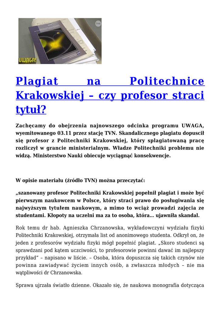 Plagiat na Politechnice Krakowskiej – czy profesor straci tytuł? Zachęcamy do obejrzenia najnowszego odcinka programu UWAGA, wyemitowanego 03.11 przez stację TVN. Skandalicznego plagiatu dopuscił się profesor z Politechniki Krakowskiej, który splagiatowaną pracę rozliczył w grancie ministerialnym. Władze Politechniki problemu nie widzą. Ministerstwo Nauki obiecuje wyciągnąć konsekwencje. W opisie materiału (źródło TVN) można przeczytać: „szanowany profesor Politechniki Krakowskiej popełnił plagiat i może być pierwszym naukowcem w Polsce, który straci prawo do posługiwania się najwyższym tytułem naukowym, a mimo to wciąż prowadzi zajęcia ze studentami. Kłopoty na uczelni ma za to osoba, która… ujawniła skandal. Rok temu dr hab. Agnieszka Chrzanowska, wykładowczyni wydziału fizyki Politechniki Krakowskiej, otrzymała list od anonimowego studenta. Odkrył on, że jeden z profesorów wydziału fizyki mógł popełnić plagiat. „Skoro studenci są sprawdzani pod kątem uczciwości, to profesorowie powinni dawać im najlepszy przykład” – napisano w liście. – Osoba, która dopuszcza się takich czynów nie powinna zawiadywać życiem innych osób, a zwłaszcza młodych – nie ma wątpliwości dr Chrzanowska. Sprawa ujrzała światło dzienne. Okazało się, że naukowa monografia dotycząca energii słonecznej, którą opublikował w 2006 roku profesor Jerzy S., jest uderzająco podobna do pracy doktorskiej stworzonej w 2000 roku na Uniwersytecie Cambridge przez Klausa Petritcha. – Sprawdziłem to wszystko i oceniłem, że 90 proc. tekstu z obliczeniami i rysunkami jest przejętych: tu jest zdanie po zdaniu, tablica, po tablicy! Plagiaty się zdarzają, ludzie przepisują dwie, trzy strony. Ale całą pracę doktorską komuś przepisać i dać jako swoją?! To jest wyjątkowy bandytyzm naukowy – mówi ostro dr hab. Marek Wroński, który od 15 lat tropi plagiaty i nierzetelność naukową na polskich uczelniach. W sprawie profesora S., złożył wniosek o wznowienie przewodu profesorskiego i unieważnienie nadanego mu stopnia naukowego. – On powinien dostać zakaz wykonywania zawodu nauczyciela akademickiego! – nie ma wątpliwości dr Wroński. Tymczasem S. nie został nawet zawieszony, a władze uczelni potrzebowały niemal dziesięciu miesięcy, by wszcząć postępowanie wyjaśniające czy doszło do plagiatu. Opinia ekspertów, którzy porównywali obie prace, miała jedną stronę i nie padło w niej słowo „plagiat”. Stwierdzono jedynie znaczne cechy podobieństwa w odniesieniu do układu i treści, oraz, że literatura źródłowa dla obu prac jest zbliżona. – Zgadzam się, że w znacznym stopniu jest to plagiat. Ale nie można powiedzieć, że praca w stu procentach została przetłumaczona i wydana, jako własna! Na siedemdziesiąt parę rysunków, czterdzieści sześć wykazuje podobieństwa, pozostałe nie. Objętość pracy jest różna, liczba rozdziałów też – mówi prof. dr hab. inż. Kazimierz Furtak, rektor Politechniki Krakowskiej. Naukowiec otrzymał w 2009 roku, z rąk Prezydenta Rzeczpospolitej, tytuł profesora zwyczajnego. To najwyższy tytuł naukowy w kraju. Po ujawnieniu plagiatu Centralna Komisja ds. Stopni i Tytułów Naukowych wznowiła postępowanie profesorskie. Jeśli S. otrzyma negatywną opinię, będzie to pierwszy przypadek w Polsce, kiedy naukowiec może zostać pozbawiony prawa posługiwania się tytułem. Póki, co profesor wciąż prowadzi zajęcia ze studentami. Komisja Dyscyplinarna ukarała go naganą i czteroletnim zakazem pełnienia funkcji kierowniczych na uczelni. Mimo, że naukowiec nie przyznaje się do winy, nie odwołał się też od decyzji. Tymczasem okazuje się, że splagiatowana praca posłużyła mu również do rozliczenia grantu badawczego, który wynosił ponad 270 tysięcy zł. Rzecznik Ministerstwa Nauki i Szkolnictwa Wyższego zapowiada, że resort rozważa zawiadomienie o sprawie prokuratury. – Analizujemy też przepisy, pod tym kątem, by móc zwrócić się o zwrot środków, jakie pan profesor otrzymał – dodaje Łukasz Szelecki, rzecznik MNiSW. Prokuratura nie wszczęła śledztwa w sprawie plagiatu, ponieważ doszło już do przedawnienia zarzutów. Profesor rozpoczął kolejny rok akademicki i prowadzi zajęcia ze studentami. Postępowanie dyscyplinarne wszczęto tymczasem… wobec dr Chrzanowskiej, która zdecydowała się skandal ujawnić. Jakie są zarzuty w stosunku do niej? Chodzi m.in. o wyrywanie krzyży przy drodze oraz… usiłowanie zabicia czterech profesorów, poprzez przejechanie ich na pasach. – Inicjatorem postępowania dyscyplinarnego jest najbliższy współpracownik pana profesora – zaznacza wykładowczyni” Zobacz materiał: http://uwaga.tvn.pl/reportaze,2671,n/czy-profesor-straci-tytul,184523.h tml Czy profesor straci tytuł? - screen z materiału TVN Data publikacji: 03.11.2015r.