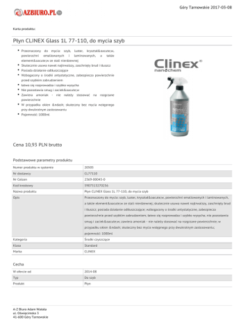 Góry Tarnowskie 2017-03-08 Karta produktu: Płyn CLINEX Glass 1L 77-110, do mycia szyb Przeznaczony do powierzchni emaliowanych mycia: szyb, i luster, kryształów, laminowanych, a także elementów ze stali nierdzewnej Skutecznie usuwa nawet najtrwalszy, zaschnięty brud i tłuszcz Posiada działanie odtłuszczające Wzbogacony o środki antystatyczne, zabezpiecza powierzchnie przed szybkim zabrudzeniem łatwo się rozprowadza i szybko wysycha Nie pozostawia smug i zacieków Zawiera amoniak - nie należy stosować na rozgrzane powierzchnie W przypadku okien – skuteczny bez mycia wstępnego przy dwukrotnym zastosowaniu Pojemność: 1000ml Cena 10,93 PLN brutto Podstawowe parametry produktu Numer produktu w systemie 20505 Nr dostawcy CL77110 Nr Celcen 2369-00043-0 Kod kreskowy 5907513270256 Nazwa produktu Płyn CLINEX Glass 1L 77-110, do mycia szyb Opis Przeznaczony do mycia: szyb, luster, kryształów, powierzchni emaliowanych i laminowanych, a także elementów ze stali nierdzewnej; skutecznie usuwa nawet najtrwalszy, zaschnięty brud i tłuszcz; posiada działanie odtłuszczające; wzbogacony o środki antystatyczne, zabezpiecza powierzchnie przed szybkim zabrudzeniem; łatwo się rozprowadza i szybko wysycha; nie pozostawia smug i zacieków; zawiera amoniak - nie należy stosować na rozgrzane powierzchnie; w przypadku okien – skuteczny bez mycia wstępnego przy dwukrotnym zastosowaniu; pojemność: 1000ml Kategoria Środki czyszczące Klasa Standard Marka CLINEX Cecha W ofercie od 2014-08 Typ Do szyb Produkt Płyn A-Z Biuro Adam Watoła ul. Oświęcimska 3 41-600 Góry Tarnowskie Góry Tarnowskie 2017-03-08 Karta katalogowa produktu cd. Płyn CLINEX Glass 1L 77-110, do mycia szyb Wymiary Pojemność (ml) 1000 Wspólny słownik zamówień CPV 39830000-9 Środki czyszczące Certyfikaty Nowy produkt w ofercie Standard Hit Standard Kolor Kolor Serdecznie zapraszamy do współpracy A-Z Biuro Adam Watoła zespół. A-Z Biuro Adam Watoła ul. Oświęcimska 3 41-600 Góry Tarnowskie Transparentny
