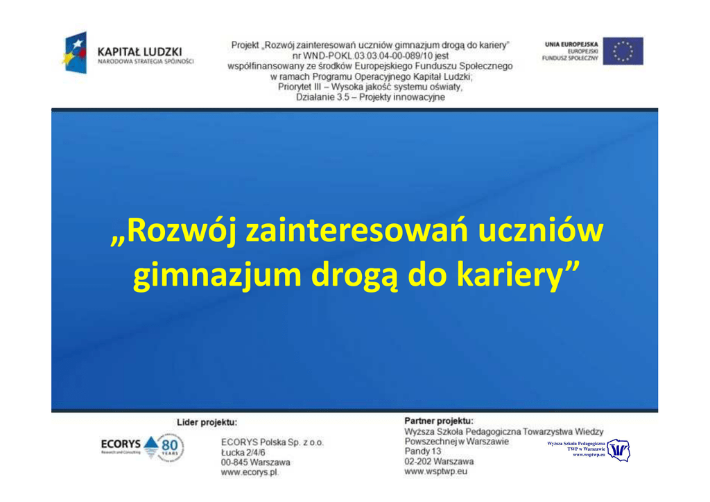 „Rozwój zainteresowań uczniów gimnazjum drogą do kariery” Lider projektu Ecorys Polska • Firma będąca częścią grupy firm badawczych i konsultingowych • Ponad 80 – letnie doświadczenie • Obszary aktywności: rynek pracy, polityka społeczna, nowoczesne zarządzanie, rozwój lokalny i regionalny, wspieranie organizacji pozarządowych Partnerzy krajowi i zagraniczni projektu Partnerzy zagraniczni: • Ecorys UK Limited – Wielka Brytania • Ecorys International BV – Holandia Partner krajowy: • Wyższa Szkoła Pedagogiczna Towarzystwa Wiedzy Powszechnej w Warszawie Tło projektu Odpowiedź na rzeczywiste zapotrzebowanie, wynikające z potrzeby zmian w modelu edukacji Możliwości wynikające z czerpania doświadczeń partnerów zagranicznych Doświadczenia zespołu projektowego w stosowaniu metody projektów na różnych poziomach edukacji Zgodność tematyki ze zmianami legislacyjnymi, zobowiazujących szkoły gimnazjalne na wprowadzanie metod aktywizujących Badania pilotażowe na Zbadano około 1200 Etap diagnozy problemów etapie przygotowywania uczniów i uczennic wniosku w 11 gimnazjach gimnazjów woj. łódzkiego województwa łódzkiego . DIAGNOZA Badaniami objęto 803 uczennic i uczniów, w tym (380 chłopców i 351 dziewcząt) 71% badanych wykazało wysoki poziom zainteresowania udziałem w zajęciach edukacyjnych podwyższających ich poziom umiejętności z przedmiotów matematyczno – przyrodniczych i przedsiębiorczości. Etap diagnozy II Gimnazjum nr 29 Gimnazjum nr 34 Na pierwszym etapie realizacji projektu przeprowadzono badania w 4 gimnazjach na próbie 395 uczniów i uczennic. Zainteresowanie udziałem w projekcie wykazało 87% uczniów i uczennic Gimnazjum nr 33 Gimnazjum nr 10 •Cel ogólny I Zwiększenie zainteresowania uczniów/ uczennic gimnazjów kontynuacją kształcenia na kierunkach o kluczowym znaczeniu dla gospodarki opartej na wiedzy poprzez wdrożenie produktu i rozwijanie umiejętności w zakresie posługiwania się ICT w procesie uczenia się oraz nawiązanie współpracy i adaptację dobrych praktyk partnerów zagranicznych i polskiego w terminie 1.VII – 10 - 31 XII.13 • Cel ogólny II Zwiększenie zainteresowania nauczycieli/ nauczycielek i dyrektorów gimnazjów wdrożeniem innowacyjnego programu i włączeniem go do polityki edukacyjnej, poprzez upowszechnianie produktu we wszystkich województwach w terminie IV.11 – XII 13. Cele szczegółowe Podwyższenie o 80% zainteresowania 1600 uczniów i uczennic gimnazjów przedmiotami przyrodniczymi i przedsiębiorczoścą i kontynuowaniem kształcenia w tych kierunkach przez 30% uczniów i uczennic poprzez aktywne uczestnictwo w wykonywaniu projektów Podwyższenie o 90% poziomu umiejętności 160 nauczycieli i o 40% poziomu umiejętności 960 nauczycieli( EU) w zakresie wdrażania systemu oceny uczniów uczestniczących w zajeciach prowadzonych metodą projektów Podwyższenie o 80% poziomu umiejętności 1600 uczniów i uczennic oraz 160 nauczycieli z zakresu posługiwania się ICT i o 40% wzrostu zainteresowania ICT 960 nauczycieli Podwyższenie o 90% poziomu umiejętności 160 nauczycieli organizujących proces kształcenia w/w przedmiotach w zakresie wdrażania do praktyki edukacyjnej tych przedmiotów IPZEz PE Wykorzystanie doświadczeń partnera zagranicznego w opracowaniu strategii i w zakresie wdrażania produktu na etapie jego testowania, upowszechniania i właczania do głównego nurtu polityki edukacyjnej . Grupy docelowe •1600 uczniów z 40 gimnazjów województwa łódzkiego •160 nauczycieli z 40 gimnazjów (etap testowania) oraz 960 nauczycieli z 160 gimnazjów (etap upowszechniania) Jakie były kryteria doboru użytkowników i odbiorców, którzy zaplanowani zostali do wzięcia udziału w projekcie ( nauczyciele i nauczycielki) Kryteria: aktywny udział nauczycieli i nauczycielek w planowaniu i wdrażaniu projektów współfinansowanych z Unii Europejskiej, 50% gimnazjów z obszarów wiejskich, nauczyciele przedmiotów matematyczno-przyrodniczych i WOS-u posiadają zaświadczenia potwierdzające ukończone kursy lub warsztaty z zakresu wdrażania metody projektów lub są zainteresowani jej wdrażaniem, w pierwszym rzędzie będą przyjmowane gimnazja, w których liczba nauczycieli jest większa niż wynikająca z badań proporcja (ustalona na etapie diagnozy proporcja w województwie łódzkim wynosi 79,5% nauczycielek i 20,5% nauczycieli), dyrektorzy gimnazjów przystępujących do projektu podpiszą oświadczenia o przeznaczeniu 2 godzin (zgodnie z KN) na wykonanie projektu w ciągu jednego roku po zakończeniu etapu testowania produktu. Wnioskodawca w 40 gimnazjach będzie monitorował stopień wykorzystania dodatkowych 2 godzin przez nauczycieli/nauczycielki. Jakie były kryteria doboru użytkowników i odbiorców, którzy zaplanowani zostali do wzięcia udziału w projekcie (uczniowie i uczennice) Kryteria: zainteresowanie uczniów/uczennic rozwojem swoich umiejętności w zakresie przedmiotów matematyczno-przyrodniczych i przedsiębiorczości zainteresowanie uczniów/uczennic podwyższeniem poziomu kompetencji informatycznych, zainteresowanie uczniów/uczennic udziałem w zajęciach pozalekcyjnych min. ocena dobra z przedmiotu, w ramach którego uczniowie i uczennice będą wykonywali projekt. Za dobór odbiorców odpowiedzialni w każdym z 40 gimnazjów będą Szkolni Asystenci Projektu. Jakie rezultaty planowane są do osiągnięcia w projekcie? •Wzrost zainteresowania przedmiotami matematyczno – przyrodniczymi i przedsiębiorczością •Wzrost umiejętności w zakresie posługiwania się ICT wśród nauczycieli i uczniów •Wzrost umiejętności wdrażania metody projektów do praktyki edukacyjnej •Wzrost umiejętności w zakresie wdrażania systemu oceny uczniów uczestniczących w zajęciach pozalekcyjnych w zakresie metody projektów •Wzrost zainteresowania nauczycieli wdrażaniem metody projektów, •Wzrost zainteresowania nauczyc