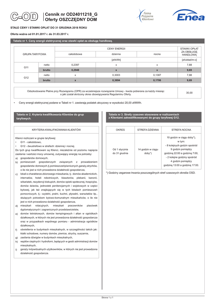 C-OD Cennik nr OD24011218_G Oferty OSZCZĘDNY DOM STAŁE CENY I STAWKI OPŁAT DO 31 GRUDNIA 2018 ROKU Oferta ważna od 01.01.2017 r. do 31.03.2017 r. Tabela nr 1. Ceny energii elektrycznej oraz stawki opłat za obsługę handlową. CENY ENERGII całodobowa GRUPA TARYFOWA dzienna STAWKI OPŁAT ZA OBSŁUGĘ HANDLOWĄ nocna [zł/kWh] G11 G12 netto 0,2397 brutto 0,2948 netto x brutto x 0,3694 [zł/układ/m-c] x x 7,88 x x 9,69 0,3003 0,1387 7,88 0,1706 9,69 Odszkodowanie Płatne przy Rozwiązaniu (OPR) za wcześniejsze rozwiązanie Umowy - kwota pobierana za każdy miesiąc o jaki został skrócony okres obowiązywania Regulaminu Oferty. • 30,00 Ceny energii elektrycznej podane w Tabeli nr 1. zawierają podatek akcyzowy w wysokości 20,00 zł/MWh. Tabela nr 3. Strefy czasowe stosowane w rozliczeniach z Klientami zakwalifikowanymi do grupy taryfowej G12. Tabela nr 2. Kryteria kwalifikowania Klientów do grup taryfowych. OKRES KRYTERIA KWALIFIKOWANIA KLIENTÓW STREFA DZIENNA 10 godzin w ciągu doby*), Klienci rozliczani w grupie taryfowej: w tym: • G11 - całodobowo, • G12 - dwustrefowo w strefach: dziennej i nocnej. - 8 kolejnych godzin spośród Do tych grup kwalifikowani są Klienci, niezależnie od poziomu napięcia zasilania i wartości mocy umownej, zużywający energię na potrzeby: a) gospodarstw domowych, b) pomieszczeń gospodarczych związanych z Od 1 stycznia 14 godzin w ciągu 9 godzin pomiędzy do 31 grudnia doby*) godziną 22:00 a godziną 7:00, - 2 kolejne godziny spośród 4 godzin pomiędzy prowadzeniem godziną 13:00 a godziną 17:00. gospodarstw domowych, tj. pomieszczeń piwnicznych, garaży, strychów, o ile nie jest w nich prowadzona działalność gospodarcza, c) lokali o charakterze zbiorowego mieszkania, tj.: domów akademickich, internatów, hoteli robotniczych, klasztorów, plebanii, *) Godziny zegarowe trwania poszczególnych stref czasowych określa OSD. kanonii, wikariatek, rezydencji biskupich, domów opieki społecznej, hospicjów, domów dziecka, jednostek penitencjarnych i wojskowych w części bytowej, jak też znajdujących się w tych lokalach pomieszczeń pomocniczych, tj.: czytelni, pralni, kuchni, pływalni, warsztatów itp., służących potrzebom bytowo-komunalnym mieszkańców, o ile nie jest w nich prowadzona działalność gospodarcza, d) mieszkań rotacyjnych, mieszkań pracowników placówek dyplomatycznych i zagranicznych przedstawicielstw, e) domów letniskowych, domów kempingowych i altan w ogródkach działkowych, w których nie jest prowadzona działalność gospodarcza oraz w przypadkach wspólnego pomiaru - administracja ogródków działkowych, f) oświetlenia w budynkach mieszkalnych, w szczególności takich jak: klatki schodowe, numery domów, piwnice, strychy, suszarnie, g) zasilania dźwigów w budynkach mieszkalnych, h) węzłów cieplnych i hydroforni, będących w gestii administracji domów mieszkalnych, i) STREFA NOCNA garaży indywidualnych użytkowników, w których nie jest prowadzona działalność gospodarcza. Strona 1 z 1