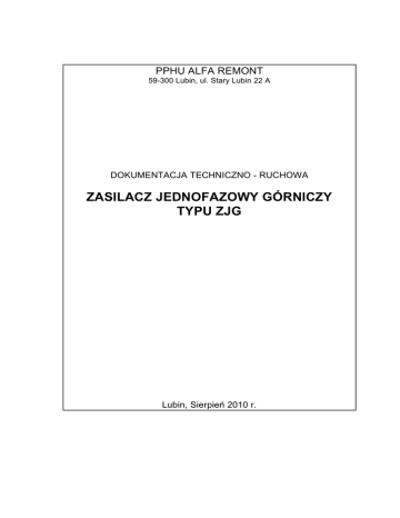 PPHU ALFA REMONT 59-300 Lubin, ul. Stary Lubin 22 A DOKUMENTACJA TECHNICZNO - RUCHOWA ZASILACZ JEDNOFAZOWY GÓRNICZY TYPU ZJG Lubin, Sierpień 2010 r. ZASILACZ JEDNOFAZOWY TYPU ZJG SPIS TREŚCI 1. INFORMACJE OGÓLNE 4 1.1 PRZEZNACZENIE I ZASTOSOWANIE 1.2 DANE TECHNICZNO – EKSPLOATACYJNE 1.2.1 W ARUNKI KLIMATYCZNE (ŚRODOWISKOWE) 1.2.2 W ARUNKI EKSPLOATACYJNE 1.2.3 DANE TECHNICZNE PODSTAWOWE 1.3 OZNACZENIA 1.4 DANE PODSTAWOWE TRANSFORMATORÓW SEPARACYJNYCH 1.5 PODSTAWOWE PARAMETRY ZASILACZY 1.6 CECHOWANIE 2. OPIS TECHNICZNY 2.1 2.2 2.3 2.4 2.5 2.6 2.7 4 5 5 5 6 7 7 7 8 9 OBUDOWA ZABEZPIECZENIE PRZED NIEPOŻĄDANYM OTWARCIEM OBUDOWY ZACISKI PRZYŁĄCZOWE, POŁĄCZENIA ELEKTRYCZNE ZACISKI UZIEMIAJĄCE, CIĄGŁOŚĆ UZIEMIENIA ZŁĄCZA ZABEZPIECZENIA I SYGNALIZACJA DZIAŁANIE 9 10 11 11 11 12 12 3. TRANSPORT 13 4. PRZECHOWYWANIE 14 5. MONTAŻ I PRZYGOTOWANIE DO PRACY 15 5.1 5.2 5.3 6. ZASADY UŻYTKOWANIA 6.1 6.2 6.3 7. 15 15 16 ODBIÓR PRZED MONTAŻEM OGLĘDZINY INSTALACJA ZASILACZA 16 ZASADY OBSŁUGI I EKSPLOATACJI INSTRUKCJA OBSŁUGI WARUNKI BHP 16 17 18 PRZEGLĄDY I NAPRAWY 19 2 ZASILACZ JEDNOFAZOWY TYPU ZJG 8. ZAGROŻENIA WYSTĘPUJĄCE W CZASIE EKSPLOATACJI 20 9. WYKAZ WYPOSAŻENIA 22 10. WYKAZ CZĘŚCI ZAMIENNYCH 24 11. SPEŁNIANE NORMY 25 12. SPOSÓB ZAMAWIANIA 26 13. SPIS RYSUNKÓW 27 − RYS. NR 1 SCHEMAT IDEOWY ZASILACZA TYPU ZJG 27 − RYS. NR 2 SCHEMAT MONTAŻOWY ZASILACZA TYPU ZJG 27 − RYS. NR 3 ZJG-1. ROZMIESZCZENIE APARATURY 27 − RYS. NR 4 ZJG-1. OBUDOWA 27 3 ZASILACZ JEDNOFAZOWY TYPU ZJG 1.INFORMACJE OGÓLNE 1.1 Przeznaczenie i zastosowanie Zasilacz jednofazowy górniczy typu ZJG jest urządzeniem elektrycznym górniczym w wykonaniu normalnym, przewidziany jest do stosowania w wyrobiskach podziemnych zakładów górniczych niemetanowych w pomieszczeniach niezagrożonych wybuchem. Zasilacz przeznaczony jest do bezpośredniego zasilania pojedynczych jednofazowych odbiorników elektrycznych (w tym elektronarzędzi) w II klasie ochronności o napięciu 230 V 50 Hz, wymagających galwanicznego odseparowania od kopalnianych sieci niskonapięciowych, 3-fazowych z izolowanym punktem neutralnym transformatora (system IT) o napięciu znamionowym 500V 50 Hz. Zasilacz wyposażony jest w zabezpieczenia elektroenergetyczne od skutków zwarć i przeciążeń. W skład wyposażenia elektrycznego zasilacza, umieszczonego w obudowie o stopniu ochrony IP54 wchodzą : część wtykowa złącza 500 V z przewodem górniczym na zasilaniu (dla instalacji doraźnych), przewód górniczy na zasilaniu (dla instalacji stałych) ,rozłącznik, transformator separacyjny, stycznik, gniazdo wtykowe 230 V na odpływie oraz aparatura sterownicza, zabezpieczeniowa i sygnalizacyjna. Do przyłączania odbiornika (elektronarzędzia) przewidziano na odpływie zabudowane na stałe gniazdo wtykowe 230 V z zabudowanym wewnątrz gniazda łącznikiem. Sterowanie stycznikiem załączającym lub wyłączającym napięcie wyjściowe 230 VAC na gniazdo odpływowe odbywa się lokalnie przyciskami zabudowanymi na ściance bocznej zasilacza. Zasilacz przeznaczony jest do pracy w warunkach określonych w pkt. 1.2. Zasilacz ZJG może być stosowany w instalacjach stałych i doraźnych. 4 ZASILACZ JEDNOFAZOWY TYPU ZJG 1.2 Dane techniczno – eksploatacyjne 1.2.1 Warunki klimatyczne (środowiskowe) • temperatura otoczenia -10° C + 40° C • wilgotność względna powietrza przy temperaturze +35°C 93±2% • maksymalna wilgotność względna w temperaturze 25°C lub niższych z kondensacją pary 100% • wysokość nad poz. morza do 1000 m • zawartość pyłu w otaczającym środowisku do 1000 mg/m3 • stopień agresywności korozyjnej wg PN - 71/H - 04651 C 1.2.2 Warunki eksploatacyjne • wahania napięcia zasilającego w sieci w stanach ustalonych • położenie robocze 0,85 ÷ 1,2Un pionowe lub poziome • narażenie na zalanie wodą kapiącą z góry i strugami wody ze wszystkich stron • od strony zasilania zasilacz powinien być chroniony zabezpieczeniem upływowym oraz w przypadku instalacji doraźnych zabezpieczeniem do kontroli ciągłości obwodów uziemienia • do zasilacza należy podłączać tylko pojedynczy odbiornik (elektronarzędzie) o II klasie ochronności • w obwodzie separowanym nie wolno stosować przedłużaczy 5 ZASILACZ JEDNOFAZOWY TYPU ZJG • części czynne obwodu separowanego nie mogą być podłączone w żadnym punkcie z innym obwodem lub ziemią, • w instalacjach doraźnych mogą być stosowane po stronie 500 V przedłużacze, przy czym osprzęt połączeniowy (gniazdo-wtyka) powinien być typu dopuszczonego, łączna długość przewodu nie powinna przekraczać 100 m, a przekrój 2 żył nie powinien być mniejszy niż 2,5 mm . 1.2.3 Dane techniczne podstawowe • stopień ochrony obudowy • IP 54 napięcie znamionowe wejściowe 500 V AC • napięcie znamionowe wyjściowe 230 V AC +/- 10%(+5%-10%) • częstotliwość znamionowa 50 Hz • napięcie znamionowe wewnętrznego obwodu sterowania • ilość odpływów 1 • moc zasilacza 1,0; 1,6; 2,0; 3,2 kVA • masa • gabaryty zasilacza dla 1,0; 1,6; 2,0 • gabaryty zasilacza dla 3,2 • gabaryty zasilacza w obudowie ramowej dla 1,0; 1,6 i 2,0 do 45 kg 500x350x220 mm (wys.xszer.xgłęb.) 500 x 350 x 240 mm (wys.x szer.x głęb.) 650 x 440 x 250 mm (wys.x szer.x głęb.) • 230 VAC gabaryty zasilacza w obudowie ramowej dla 3,2 650 x 440 x 300 mm (wys.x szer.x głęb.) 6 ZASILACZ JEDNOFAZOWY TYPU ZJG 1.3 Oznaczenia System oznaczeń zasilacza przedstawia poniższy schemat: 1.0 1.6 2.0 3.2 ZJG Zasilacz jednofazowy górniczy Moc zasilacza .... kVA Przykład: ZJG 3.2 oznacza zasilacz jednofazowy 230 VAC, zasilany napięciem 500 VAC, o mocy 3,2 kVA. 1.4 Dane podstawowe transformatorów separacyjnych Tab.1 Lp Typ transformatora 1 2 3 4 ET1o-1,0 ET1o-1,6 ET1o-2,0 ET1o-3,5 Napięcie pierwotne/prąd pierwotny V/A 500/2,1 500/3,4 500/4,2 500/7,09 Napięcie wtórne/prąd wtórny V/A Moc KVA Napięcie zwarcia % 230/4,5 230/7,0 230/8,7 2