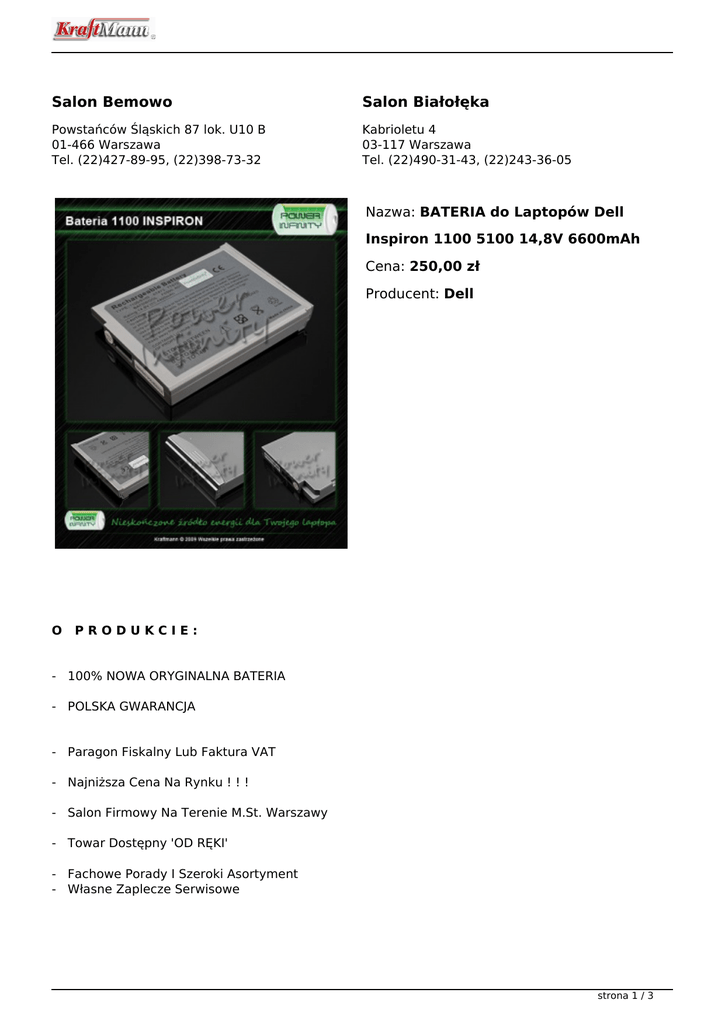 Salon Bemowo Salon Białołęka Powstańców Śląskich 87 lok. U10 B 01-466 Warszawa Tel. (22)427-89-95, (22)398-73-32 Kabrioletu 4 03-117 Warszawa Tel. (22)490-31-43, (22)243-36-05 Nazwa: BATERIA do Laptopów Dell Inspiron 1100 5100 14,8V 6600mAh Cena: 250,00 zł Producent: Dell O PRODUKCIE: - 100% NOWA ORYGINALNA BATERIA - POLSKA GWARANCJA - Paragon Fiskalny Lub Faktura VAT - Najniższa Cena Na Rynku ! ! ! - Salon Firmowy Na Terenie M.St. Warszawy - Towar Dostępny 'OD RĘKI' - Fachowe Porady I Szeroki Asortyment - Własne Zaplecze Serwisowe strona 1 / 3 Oryginalna Bateria PowerInfinity® Bateria pasuje do nast. modeli DELL: Inspiron 1100 Inspiron 1150 Inspiron 5100 Inspiron 5150 Inspiron 5160 Latitude 100L NEC: LaVie SPackard Bell: EasyNote C3Easy Note C3 EasyNote C3000 Easy Note C3000 Może być używana zamiast nast. modeli baterii: 310-5205 310-5206 312-0079 312-0296 451-10117 451-10183 6T473 7T670 8Y849 9T686 BATDW00L F0590A01 J2328 Właściwości baterii : napięcie : 14,8 V pojemność : 6600 mAh rodzaj: litowo-jonowa strona 2 / 3 .:ZALETY:. * Bateria jest fabrycznie nowa. * POLSKA GWARANCJA + Własny Serwis ! ! ! * Wystawiamy faktury VAT 23% lub Paragony Fiskalne. * Produkt dostępny "od ręki" w naszym salonie firmowym na Bemowie. (-: ! ! ! Gorąco Zapraszamy Po Odbiór Osobisty ! ! ! :-) strona 3 / 3 Powered by TCPDF (www.tcpdf.org)