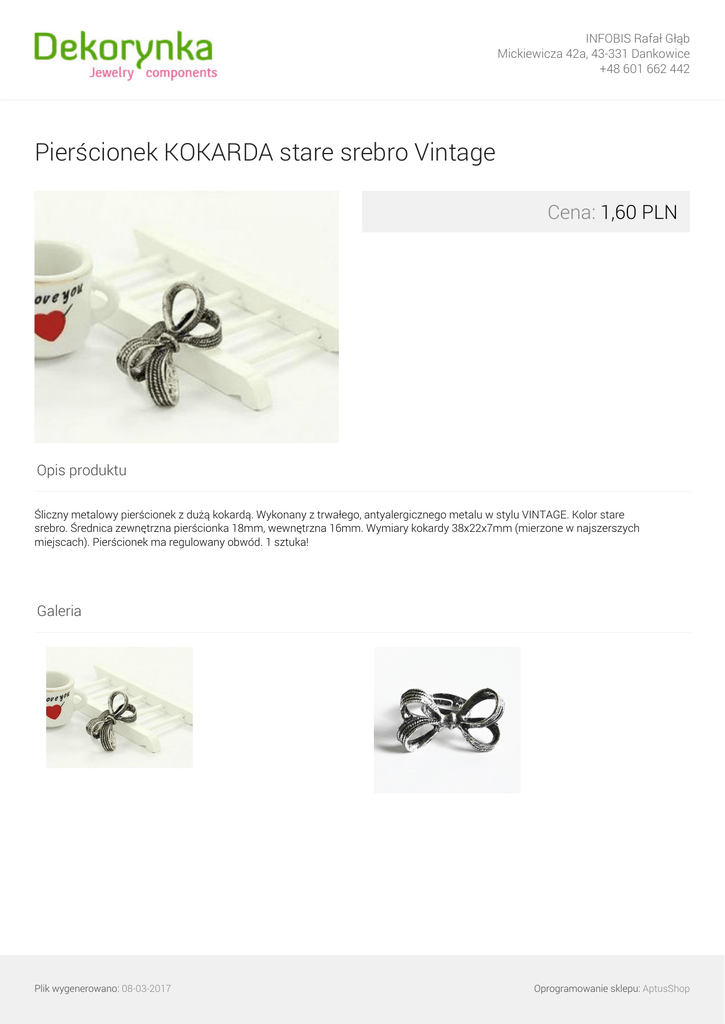 INFOBIS Rafał Głąb Mickiewicza 42a, 43-331 Dankowice +48 601 662 442 Pierścionek KOKARDA stare srebro Vintage Cena: 1,60 PLN Opis produktu Śliczny metalowy pierścionek z dużą kokardą. Wykonany z trwałego, antyalergicznego metalu w stylu VINTAGE. Kolor stare srebro. Średnica zewnętrzna pierścionka 18mm, wewnętrzna 16mm. Wymiary kokardy 38x22x7mm (mierzone w najszerszych miejscach). Pierścionek ma regulowany obwód. 1 sztuka! Galeria Plik wygenerowano: 08-03-2017 Powered by TCPDF (www.tcpdf.org) Oprogramowanie sklepu: AptusShop