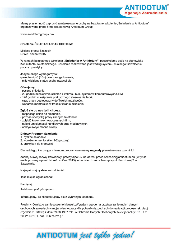 Mamy przyjemność zaprosić zainteresowane osoby na bezpłatne szkolenie „Śniadania w Antidotum” organizowane przez firmę szkoleniową Antidotum Group. www.antidotumgroup.com Szkolenie ŚNIADANIA w ANTIDOTUM! Miejsce pracy: Szczecin Nr ref.: sni/ant/2015 W ramach bezpłatnego szkolenia „Śniadania w Antidotum”, poszukujemy osób na stanowisko Konsultanta Telefonicznego. Szkolenie realizowane jest według systemu dualnego: kształcenie poprzez praktykę. Jedyne czego wymagamy to: -pełnoletniość (18+) oraz zaangażowanie, - mile widziany status osoby uczącej się. Oferujemy: - pyszne śniadania, - 20 godzin miesięcznie szkoleń z zakresu b2b, systemów komputerowych/CRM, - 120 godzin miesięcznie praktycznego stosowania teorii, - czas pracy dostosowany do Twoich możliwości, - wsparcie mentorskie w trakcie trwania szkolenia. Zgłoś się do nas jeśli chcesz: - rozpocząć dzień od śniadania, - poznać specyfikę pracy zimnych telefonów, - zgłębić know how nowoczesnych firm, - nabyć umiejętności handlowych oraz mediacyjnych, - odkryć swoje mocne strony. Dniowy Program Szkolenia: 1. pyszne śniadanie 2. wdrożenie mentorskie (1-2 godziny) 3. praktyka ( do 6 godzin) Dla każdego, kto osiąga minimum programowe mamy nagrody pieniężne oraz upominki! Zadbaj o swój rozwój zawodowy, przesyłając CV na adres: [email protected] (w tytule maila prosimy wpisać: Nr ref.: sni/ant/2015) lub odwiedź nasze biuro przy ul. Pocztowej 2 w Szczecinie. Najlepsi znajdą stałe zatrudnienie! Ilość miejsc ograniczona! Pamiętaj, Antidotum jest tylko jedno! Informujemy, że skontaktujemy się z wybranymi osobami. Prosimy również o zamieszczenie klauzuli:„Wyrażam zgodę na przetwarzanie moich danych osobowych zawartych w mojej ofercie pracy dla potrzeb niezbędnych do realizacji procesu rekrutacji (zgodnie z Ustawą z dnia 29.08.1997 roku o Ochronie Danych Osobowych; tekst jednolity: Dz. U. z 2002r. Nr 101, poz. 926 ze zm.).”