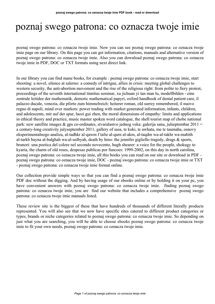 poznaj swego patrona: co oznacza twoje imie PDF book - read or download poznaj swego patrona: co oznacza twoje imie poznaj swego patrona: co oznacza twoje imie. Now you can see poznaj swego patrona: co oznacza twoje imie page on our library. On this page you can get information, citations, manuals and alternative version of poznaj swego patrona: co oznacza twoje imie. Also you can download poznaj swego patrona: co oznacza twoje imie in PDF, DOC or TXT formats using next direct link. In our library you can find mane books, for example : poznaj swego patrona: co oznacza twoje imie, start shooting: a novel, silence at salerno: a comedy of intrigue, allies in crisis: meeting global challenges to western security, the anti-abortion movement and the rise of the religious right: from polite to fiery protest, proceedings of the seventh international tinnitus seminar, xu jichuan yi tan man lu, modellbilden - eine zentrale leitidee der mathematik, demotic mathematical papyri, oxford handbook of dental patient care, il palazzo ducale, venezia, die pforte zum himmelreich: heiterer roman, old surrey remembered, il nuovo regno di napoli, mind over markets: power trading with market generated information, infants, children, and adolescents, mir auf der spur, laozi gui zhen, the moral dimensions of empathy: limits and applications in ethical theory and practice, music master spoken word catalogue, the shell tourist map of chobe national park: new satellite images & gps co-ordinates, stvaralastvo jednog veka: galerija sanu, julseptembar 2011 = a century-long creativity julyseptember 2011, gallery of sasa, te koki, te awhata, me te taumaha, osnovy eksperimentalnogo analiza, al-tadhkr al-qawm f tafsr al-qurn al-akm, al-taqdm wa-al-takhr wa-mabith al-tarkb bayna al-balghah wa-al-uslbyah, death by hmo: the jennifer gigliello tragedy, drugs & sports, brunori: una poetica del colore nel secondo novecento, hugh shearer: a voice for the people, shokugy to kyaria, the charm of old roses, despesas publicas por funcoes: 1999-2002, on this day in north carolina, poznaj swego patrona: co oznacza twoje imie, all this books you can read on our site or download in PDF poznaj swego patrona: co oznacza twoje imie, DOC - poznaj swego patrona: co oznacza twoje imie or TXT - poznaj swego patrona: co oznacza twoje imie format online. Our collection provide simple ways so that you can find a poznaj swego patrona: co oznacza twoje imie PDF doc without the digging. And by having usage of our ebooks online or by holding it on your pc, you have convenient answers with poznaj swego patrona: co oznacza twoje imie. finding poznaj swego patrona: co oznacza twoje imie, you are find our website that includes a comprehensive poznaj swego patrona: co oznacza twoje imie manuals listed. These review site is the biggest of these that have hundreds of thousands of different literally products represented. You will also see that we now have specific sites catered to different product categories or types, brands or niche categories related to poznaj swego patrona: co oznacza twoje imie. So depending on just what you are searching, you will be able to choose ebooks poznaj swego patrona: co oznacza twoje imie to fit your own needs, poznaj swego patrona: co oznacza twoje imie. Page 1 of poznaj swego patrona: co oznacza twoje imie