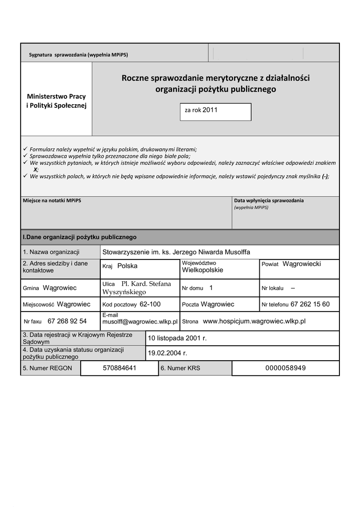 Sygnatura sprawozdania (wypełnia MPiPS) Roczne sprawozdanie merytoryczne z działalności organizacji pożytku publicznego Ministerstwo Pracy i Polityki Społecznej za rok 2011 ü Formularz należy wypełnić w języku polskim, drukowanymi literami; ü Sprawozdawca wypełnia tylko przeznaczone dla niego białe pola; ü We wszystkich pytaniach, w których istnieje możliwość wyboru odpowiedzi, należy zaznaczyć właściwe odpowiedzi znakiem X; ü We wszystkich polach, w których nie będą wpisane odpowiednie informacje, należy wstawić pojedynczy znak myślnika (-); Miejsce na notatki MPiPS Data wpłynięcia sprawozdania (wypełnia MPiPS) I.Dane organizacji pożytku publicznego 1. Nazwa organizacji Stowarzyszenie im. ks. Jerzego Niwarda Musolffa 2. Adres siedziby i dane kontaktowe Kraj Gmina Wągrowiec Miejscowość Wągrowiec Województwo Polska Ulica Pl. Kard. Stefana Wyszyńskiego Kod pocztowy Powiat Wągrowiecki Wielkopolskie 62-100 Nr domu Poczta 1 Wągrowiec Nr lokalu – Nr telefonu 67 262 15 60 E-mail Nr faxu 67 268 92 54 [email protected] Strona www.hospicjum.wagrowiec.wlkp.pl 3. Data rejestracji w Krajowym Rejestrze Sądowym 4. Data uzyskania statusu organizacji pożytku publicznego 5. Numer REGON 570884641 10 listopada 2001 r. 19.02.2004 r. 6. Numer KRS 0000058949 2 7. Skład organu zarządzającego organizacji (Należy wpisać imiona, nazwiska oraz informacje o funkcji pełnionej przez poszczególnych członków organu zarządzającego) Andrzej Rygielski – prezes zarządu Michał Politowski – wiceprezes zarządu Stanisław Owsianny – sekretarz zarządu Marian Talaczyński – skarbnik Bronisław Pędzisz – członek zarządu Bogumiła Nickel – członek zarządu Edmund Knapski – przewodniczący komisji rewizyjnej 8. Skład organu kontroli lub nadzoru organizacji January Bątkiewicz – członek komisji rewizyjnej (Należy wpisać imiona, nazwiska oraz informacje o funkcji pełnionej przez poszczególnych członków organu kontroli lub nadzoru) Krzysztof Bucholc – członek komisji rewizyjnej – 9. Cele statutowe organizacji (Należy opisać cele na podstawie statutu organizacji) 1) Działalność dobroczynna, ochrona zdrowia i pomoc społeczna osobom fizycznym znajdującym się w trudnej sytuacji bez względu na wyznanie i światopogląd; 2) Opieka hospicyjna nad chorym w terminalnej fazie choroby, pomoc rodzinie chorego w trakcie choroby i w okresie osierocenia; 3) Niesienie pomocy i opieki ludziom chorym, samotnym, bezdomnym, w podeszłym wieku; 4) Opieka nad osobami bezdomnymi i niezaradnymi życiowo; 5) Organizacja i promocja wolontariatu; 6) Organizowanie różnych form wypoczynku dla dzieci i młodzieży z rodzin ubogich, dotkniętych patologiami alkoholizmu i narkomanii; 7) Szkolenie personelu medycznego, wolontariuszy i rodzin chorych; 8) Propagowanie i podnoszenie świadomości społecznej na temat wielodyscyplinarnej opieki hospicyjnej; 9) Współpraca z organami administracji publicznej, samorządowej oraz z instytucjami, organizacjami i osobami w kraju i zagranicą, których działania są zbieżne z celami Stowarzyszenia. 3 10. Sposób realizacji celów statutowych organizacji (Należy opisać sposób realizacji celów statutowych organizacji na podstawie statutu organizacji) 1. Stowarzyszenie realizuje swoje cele poprzez: a) Prowadzenie szkoleń, kursów, wykładów i poradnictwa rodzinnego; b) Organizowanie i finansowanie imprez kulturalnych, rozrywkowych, sportowych i turystycznych; c) Organizowanie wolontariatu i kwest na rzecz Stowarzyszenia; d) Prowadzenie hospicjum stacjonarnego i domowego dla terminalnie chorych, noclegowni dla bezdomnych i jadłodajni oraz ich remont, modernizacja i rozbudowa. e) Zakup żywności, niezbędnych leków na potrzeby osób chorych, samotnych, w podeszłym wieku; f) Organizowanie i finansowanie kolonii i wycieczek dla dzieci i młodzieży z rodzin ubogich, dotkniętych patologiami alkoholizmu i narkomanii; g) Przyjmowanie darowizn i spadków na rzecz Stowarzyszenia; h) Korzystanie z dotacji i subwencji od osób prawnych. 2. Działalność wymieniona w ust. 1 jest wyłączną działalnością Stowarzyszenia. 11. Najważniejsze sfery działalności pożytku publicznego (Należy wskazać nie więcej niż trzy najważniejsze, pod względem wielkości wydatkowanych środków, sfery działalności pożytku publicznego, o których mowa w art. 4 ust.1 ustawy z dnia 24 kwietnia 2003 r. o działalności pożytku publicznego i o wolontariacie(Dz. U. z 2010 r. Nr 234, poz. 1536), zaczynając od najważniejszej) 1. szpitalnictwo – wg PKD 86.10.Z 2. pozostałe placówki gastronomiczne – wg PKD 56.10.A 3. pozostałe miejsca krótkotrwałego zakwaterowania, gdzie indziej nie sklasyfikowane – wg PKD 55.90.Z II. Charakterystyka działalności organizacji pożytku publicznego w okresie sprawozdawczym 1.Opis działalności pożytku publicznego 1. 2. 3. 4. 5. Prowadzenie hospicjum stacjonarnego. Prowadzenie hospicjum domowego. Prowadzenie noclegowni. Prowadzenie jadłodajni. Organizowanie i finansowanie kolonii i wycieczek dla dzieci i młodzieży z rodzin ubogich i dotkniętych patologiami. 6. Szkolenie wolontariuszy. 7. Organizowanie imprez kulturalnych i rozrywkowych na rzecz hospicjum. 1. Opis głównych działań podjętych przez organizację 2.Zasięg terytorialny prowadzonej przez organizację działalności pożytku publicznego (Należy wskazać np. „gmina”, „powiat”, „województwo”, „cały kraj”, „zagranica”) Cały kraj 4 2. Informacja dotycząca prowadzonych przez organizację pożytku publicznego placówek w okresie sprawozdawczym 1.Organizacja prowadziła placówki zapewniające całodobową opiekę osobom niepełnosprawnym, przewlekle chorym lub osobom w podeszłym wieku, centra integracji społecznej, domy pomocy społecznej, placówki opiekuńczowychowawcze określone w przepisach o pomocy społecznej, szkoły i placówki tak publiczne określone w przepisach o systemie oświaty lub niepubl